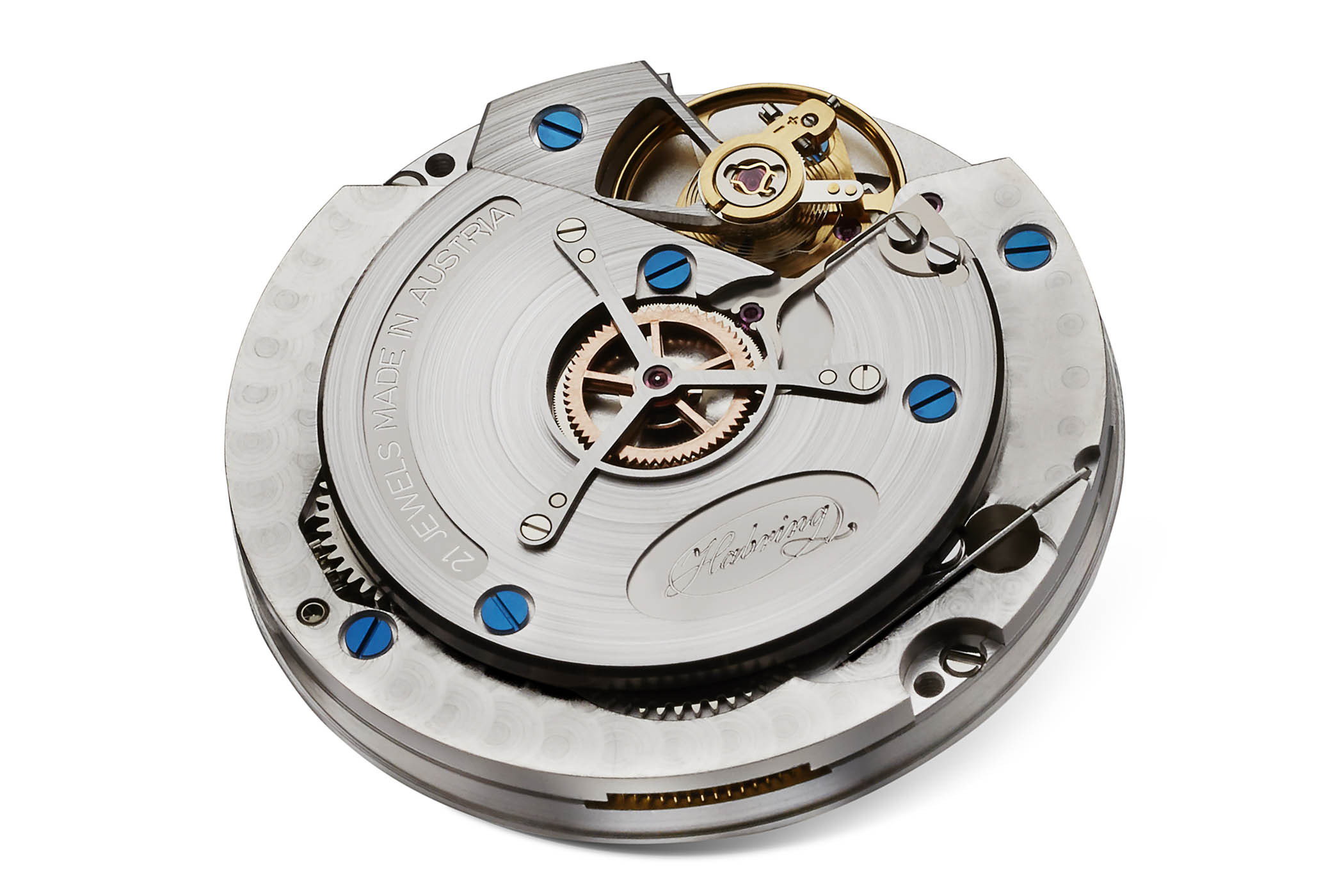 The hand-wound calibre A11MS of the Habring² Erwin LAB01 is exactly the same as the other editions of the Erwin model, meaning nicely decorated plates and bridges (brushed surfaces, perlage and blued screws), a 48h power reserve and a 4Hz frequency.