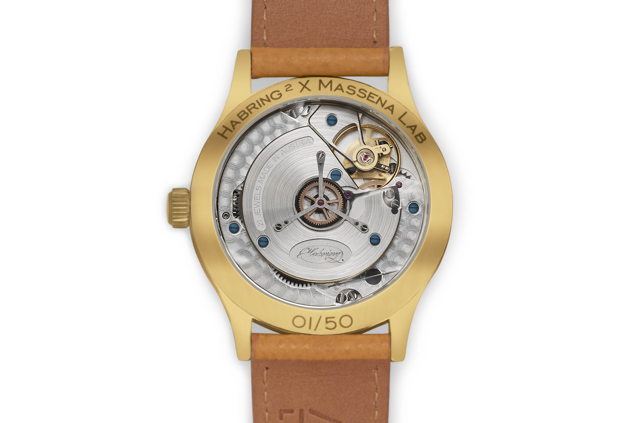 The Habring² Erwin LAB01 is worn on a honey brown Italian leather strap with a bronze tang buckle. It will be produced in 50 pieces and only available through massenalab.com at a price of USD 5,995.