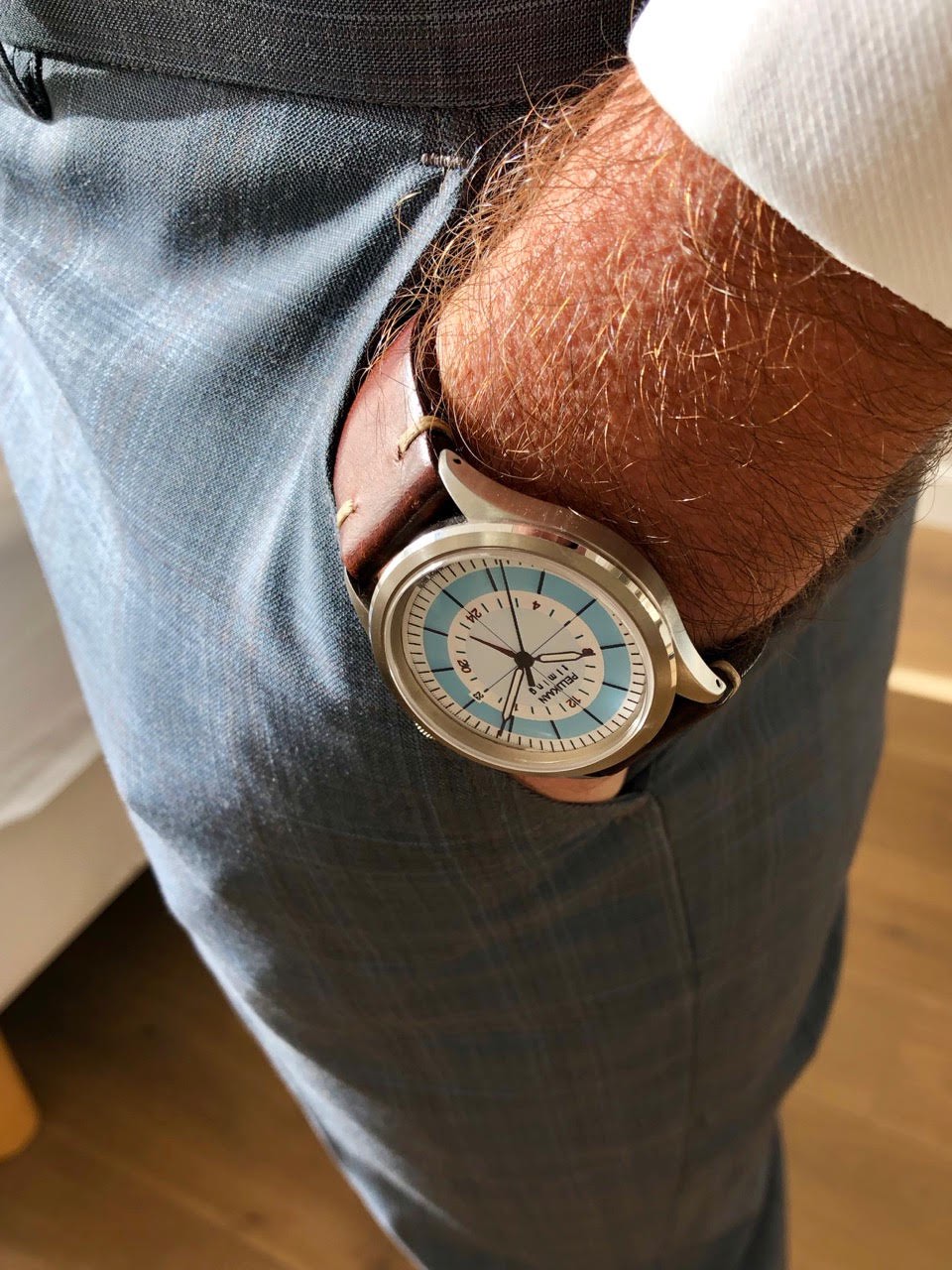 A centrally mounted GMT-hand indicates the second time zone, with touches of red, over a white and faded Bugatti blue dial with black markings and tracks. Offered in a smaller, stainless steel case than the original hand-wound Flying Dutchman, the GMT sibling measures 41mm across with a height of 13.5mm. We do need to point out one thing though. As this is a suggested model for the watch forum, the dial you see in the pictures is a printed paper version and a Photoshopped version, and not an actual production dial. No actual dial has been produced yet as the Pellikaan Timing Flying Dutchman GMT has only just been selected as the HFLE 2019 watch.