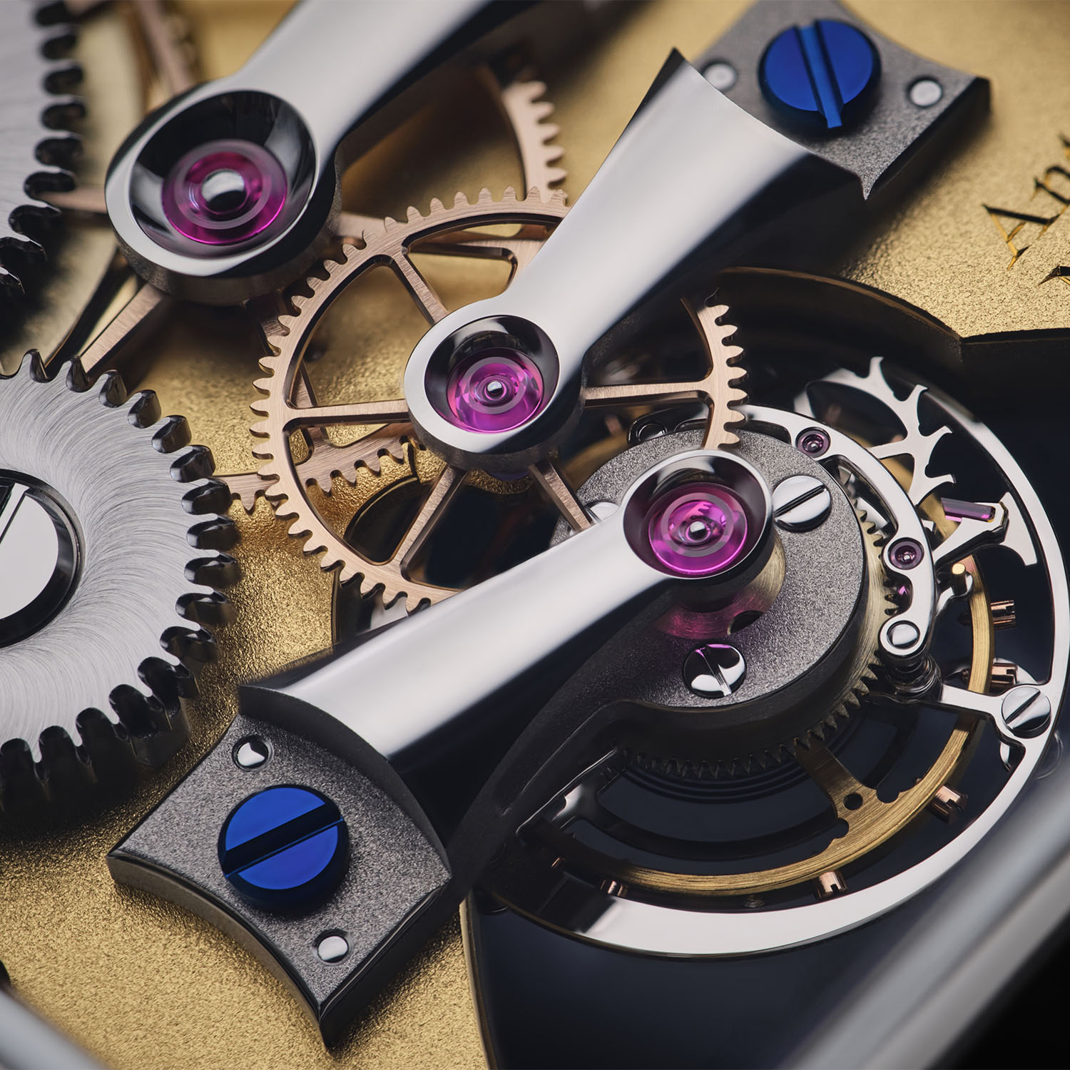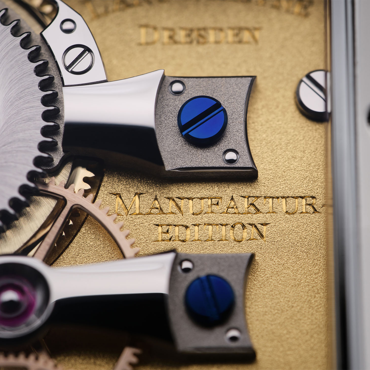 The sapphire crystal caseback unveils the gold-plated, grainy-textured mainplate adorned with hand-engraved details, including the brand’s logo, “Manufaktur Edition”, the model’s name, and its limited-edition number. As in previous editions, the hand-wound calibre IX is adorned with two diamonds mounted in polished sets. The 163-component movement appears almost simple, with parts seemingly spread over ample space, inviting admiration for the superb decoration details, like the finely bevelled wheels and the mirror-polished jewel sinks. Some elements are textured, while others are highly polished, exemplified by the bridges and cocks held by blued screws.