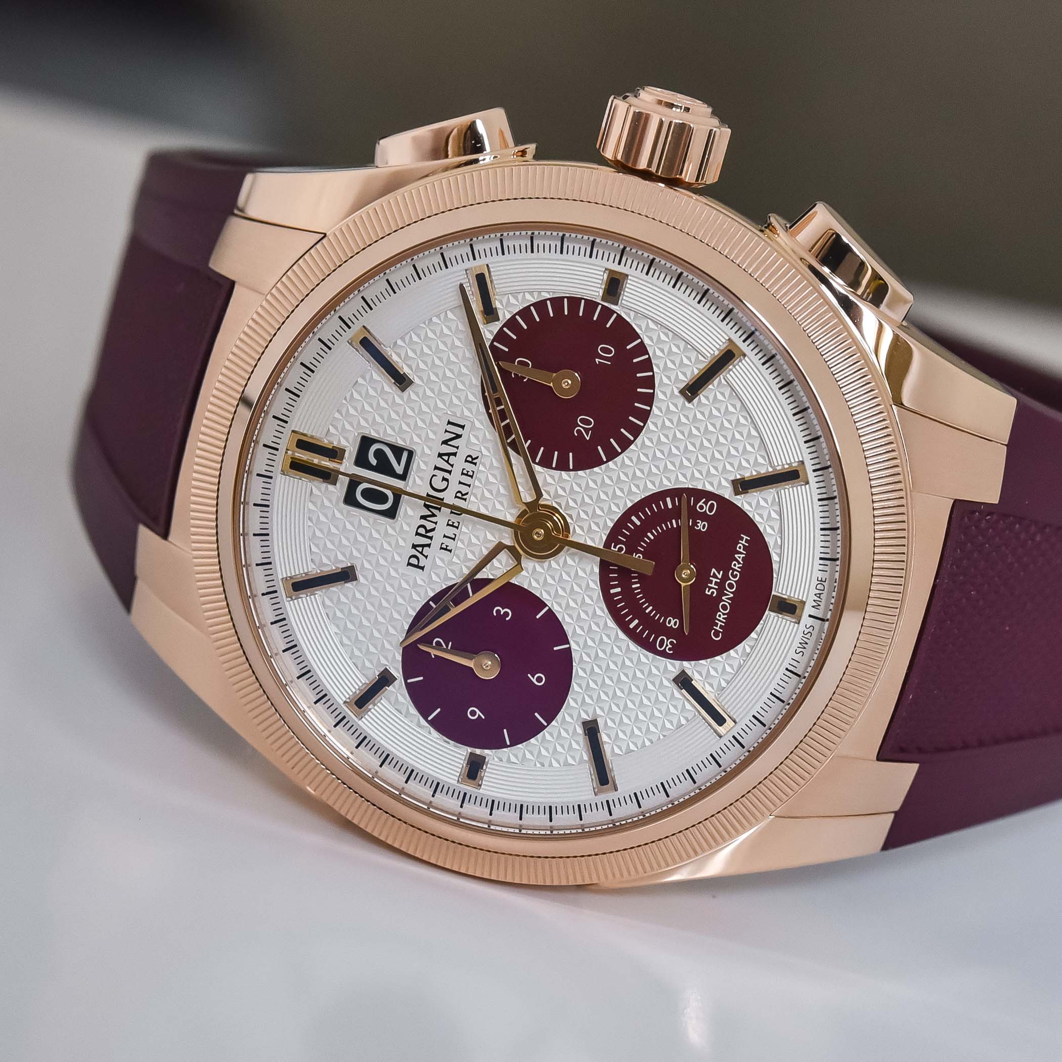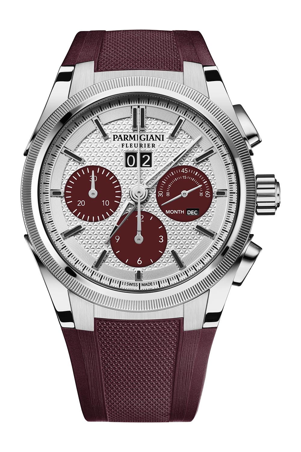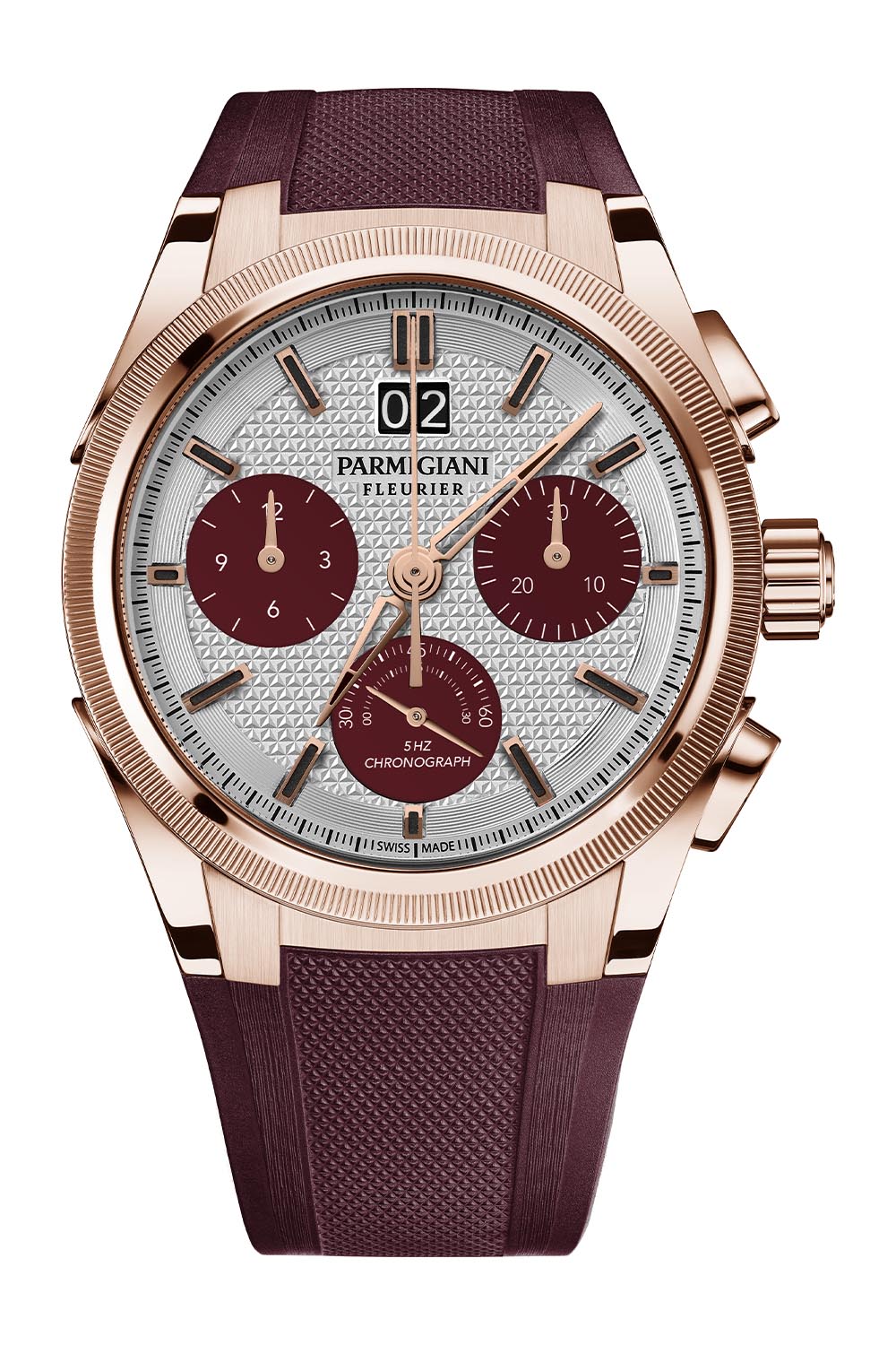 Quick facts: 42mm diameter x 14.3mm height – 18k rose gold, brushed and polished – knurled bezel – screw-down crown – 100m water-resistance – anti-reflective sapphire over dial, sapphire crystal caseback – silver guilloché dial with Quantum Grey or Granata counters – chronograph indications in sub-dials at 3 and 9, running seconds at 6 o’clock – applied indices with black luminescent coating – delta-shaped openworked h&m hands – big date at 12 o’clock – calibre PF071 (based on calibre PF361) automatic with integrated chronograph and big date display – COSC-certified – chronograph with column wheel and vertical clutch – 5Hz/36,000vph – 331 components – 42 jewels – 65h power reserve – hours, minutes, small seconds, big date and chronograph – Quantum Grey or Granata rubber strap – CHF 43,100 quantum grey dial (ref. PFC903- 2020001-400181) – CHF 43,100 Granata dial (ref. PFC903- 2020002-400181)