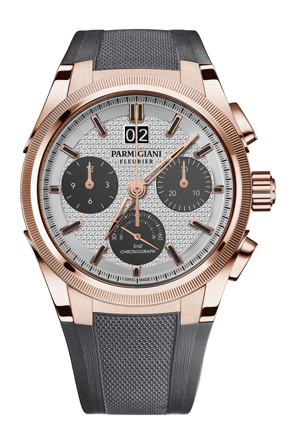 Visible through the sapphire crystal caseback is Parmigiani Fleurier’s in-house, COSC-certified, integrated high-frequency chronograph with a column wheel, vertical clutch and big date display. The in-house calibre PF071, is based on the GPGH award-winning calibre PF361 and its 5Hz/36,000vph frequency allows the stopwatch to capture intervals of 1/10th of a second. Fitted with 331 components and 42 jewels, the movement delivers a robust 65-hour power reserve. A high-end movement, calibre PF071 displays Haute Horlogerie finishings with satin-brushed openworked bridges, hand-bevelled edges, and a skeletonised 22k rose gold rotor.