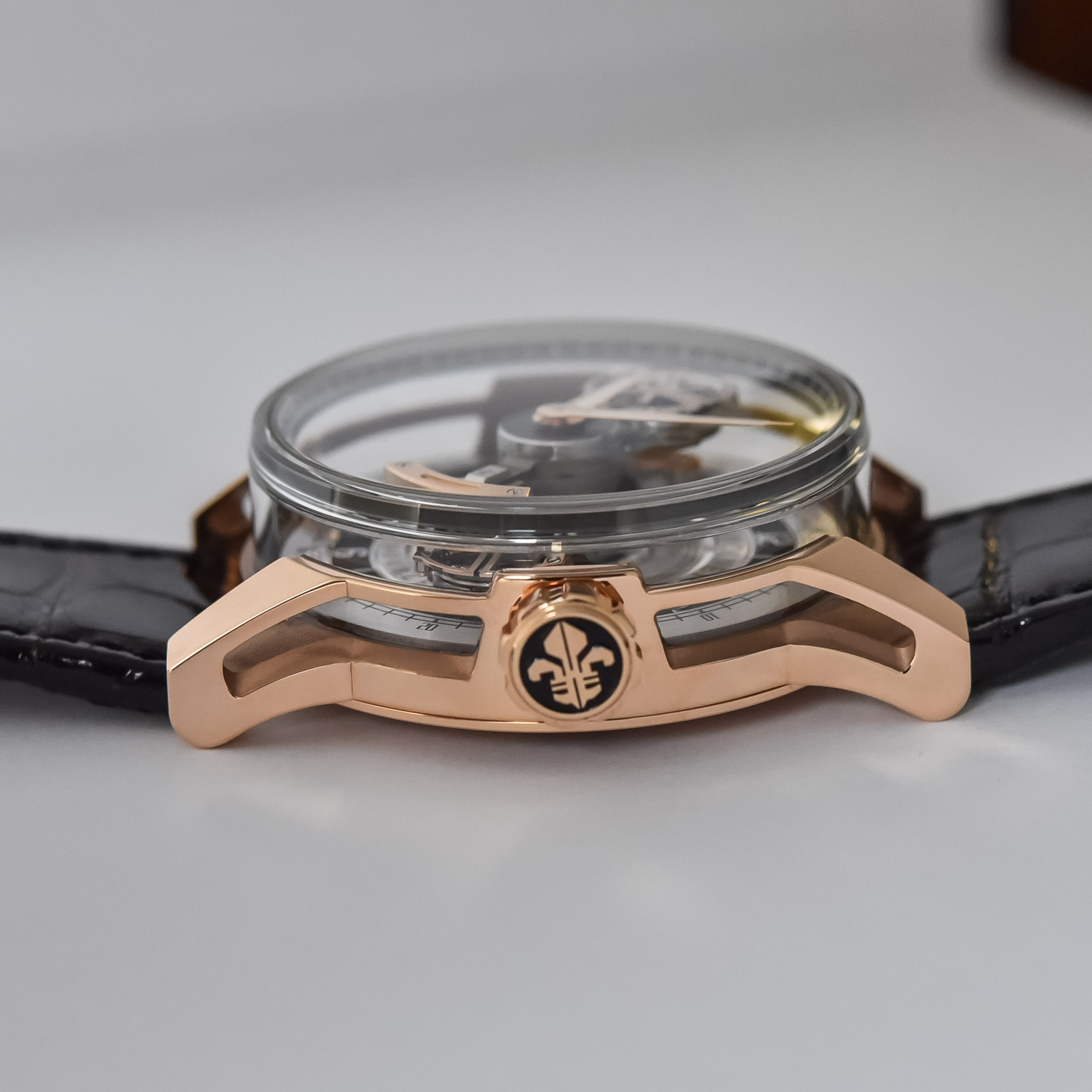 If the Astronef reinterprets the technology developed for the Space Revolution, it brings the concept in a different direction. Louis Moinet still puts time under glass, housing its tridimensional animated movement inside a box domed sapphire crystal mounted on a gold chassis with openwork lugs (it measures 43.5mm for the gold base and 41.6 mm for the sapphire top). Yet, it does away with the science fiction side of the watch. Instead of animating space ships, the twin planetary tourbillons are presented in more traditional execution, in particular for the 18k gold counterweights and, obviously, with the two-tone black and silver dial that offers a much clearer time indication.