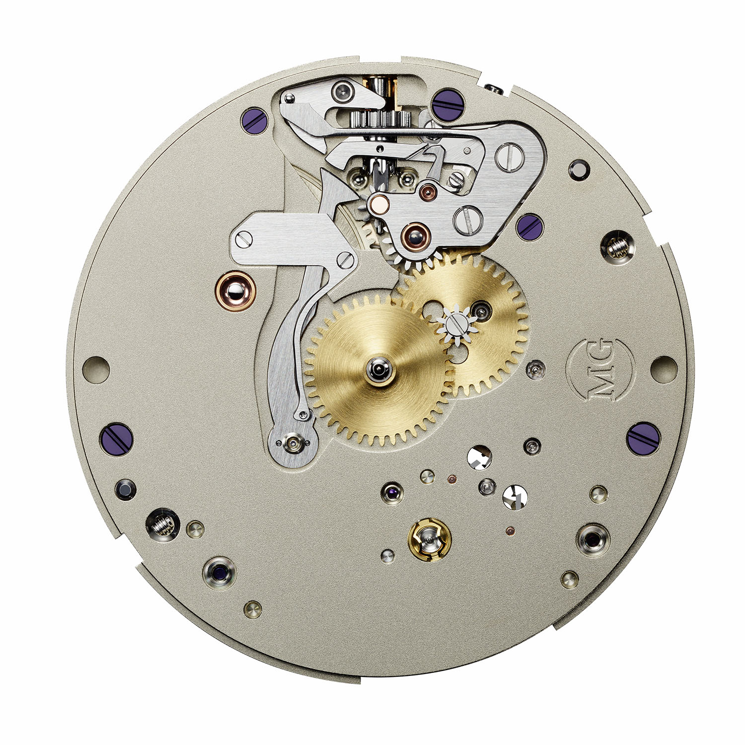The Moritz Grossmann Central Seconds purple comes in exactly the same steel case as the previous models, measuring 41mm across and 12mm in height. On the right-hand side, we find MG’s signature crown-and-pusher winding and setting system. This system cleverly prevents dust and water to enter the case, as it resets the crown after pulling it out. It also prevents unwanted adjustments of the hands that can occur when pushing back in a conventional crown. The small pusher you see just below it releases the movement again.