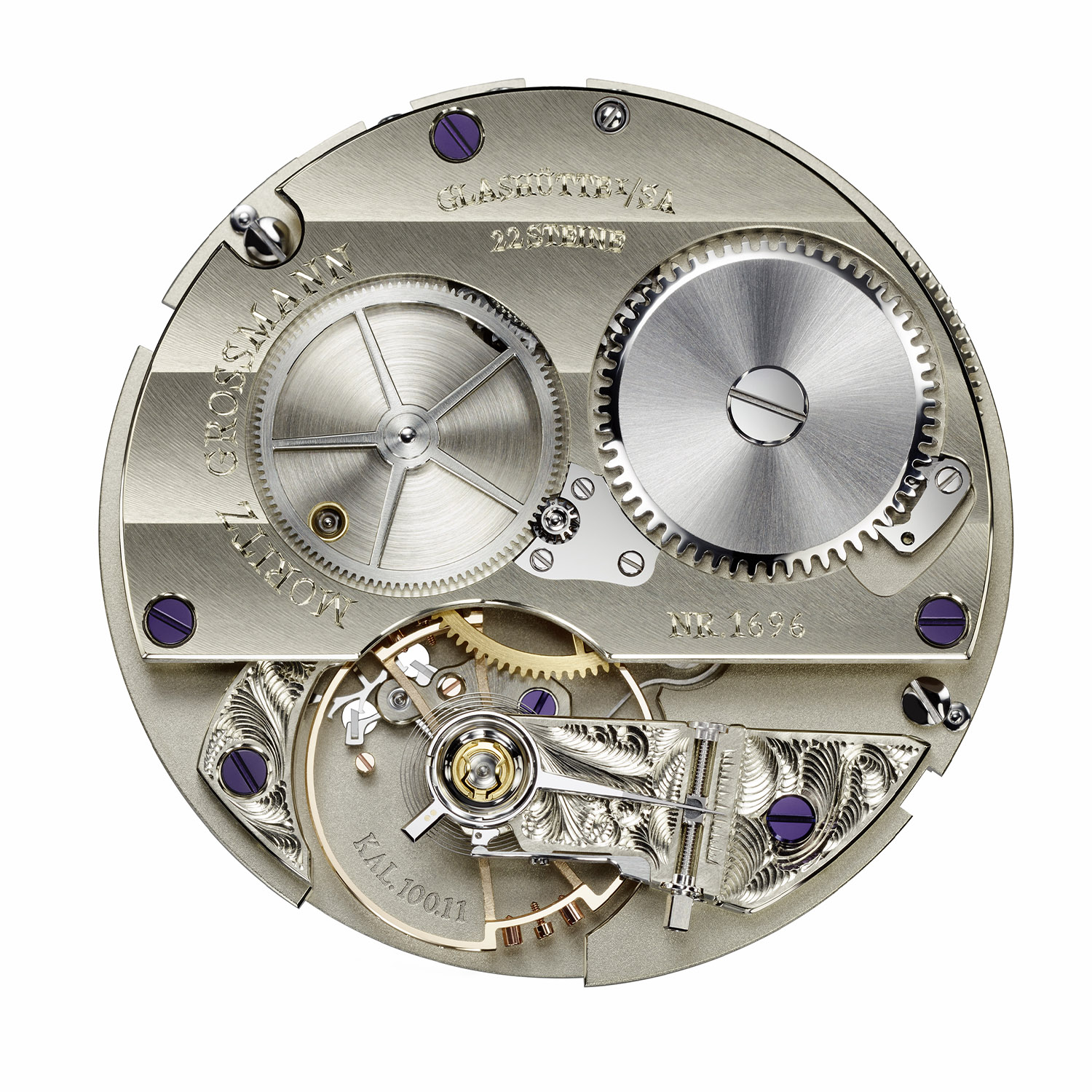 Inside ticks the manufacture calibre 100.11. this manual wound movement is composed of 198 parts including 22 jewels. It runs at a frequency of 18,000vph and fully wound it will provide 42 hours of running time. It features a shock-resistant Moritz Grossmann variable inertia balance and that clever winding system I mentioned earlier. As we’ve come to expect from the brand, everything is finished to Haute Horlogerie standards, with Glashütte ribbing, polished bevels, violet heat-annealed screws, hand-engraved decorations, frosting on the main plate, gold chatons.