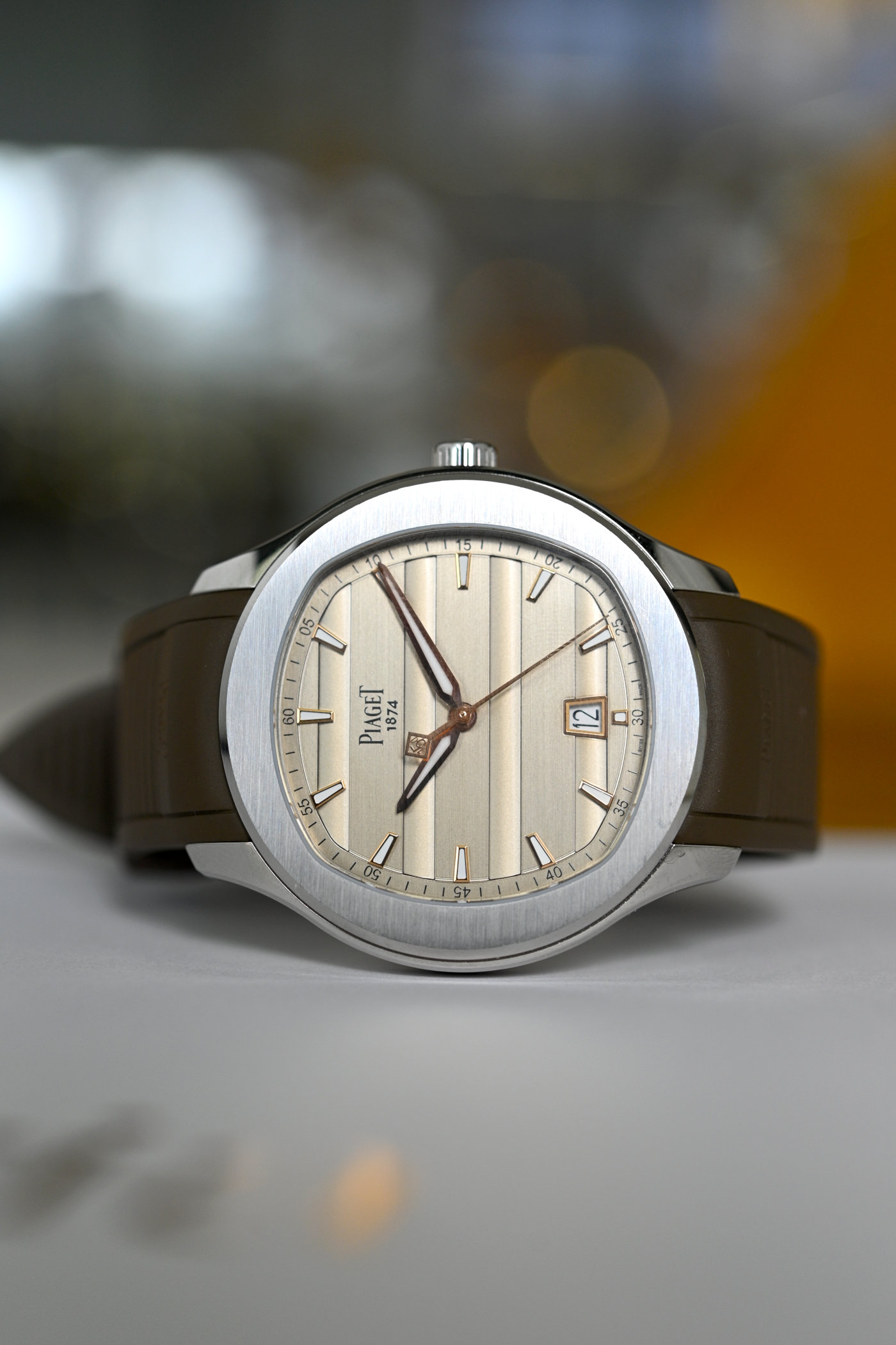 The signature gadroons found on the original Polo 79 transition to the dial of the Piaget Polo Date.