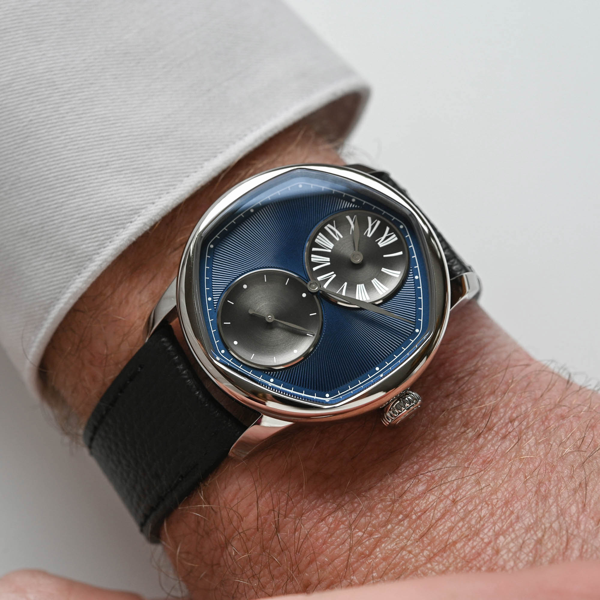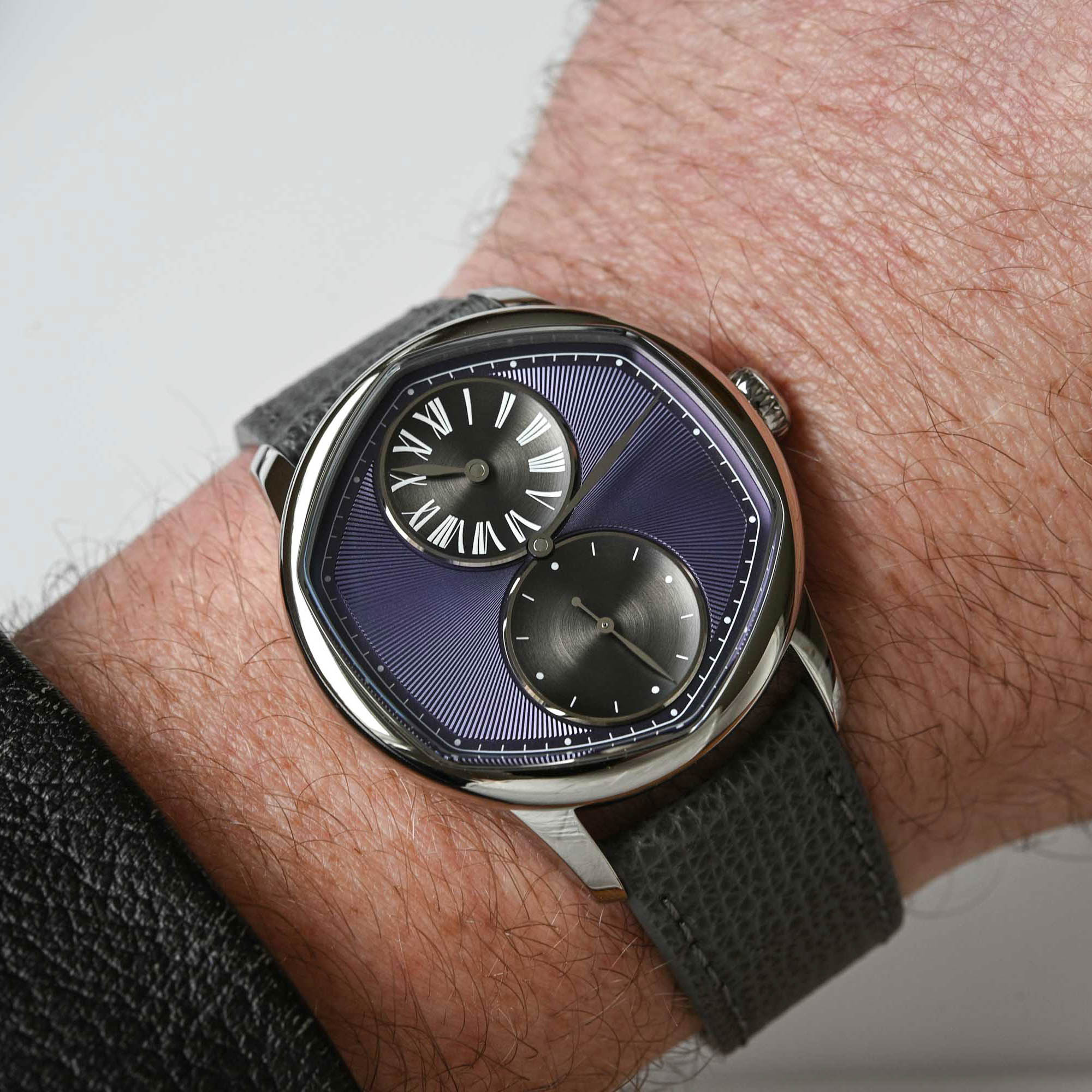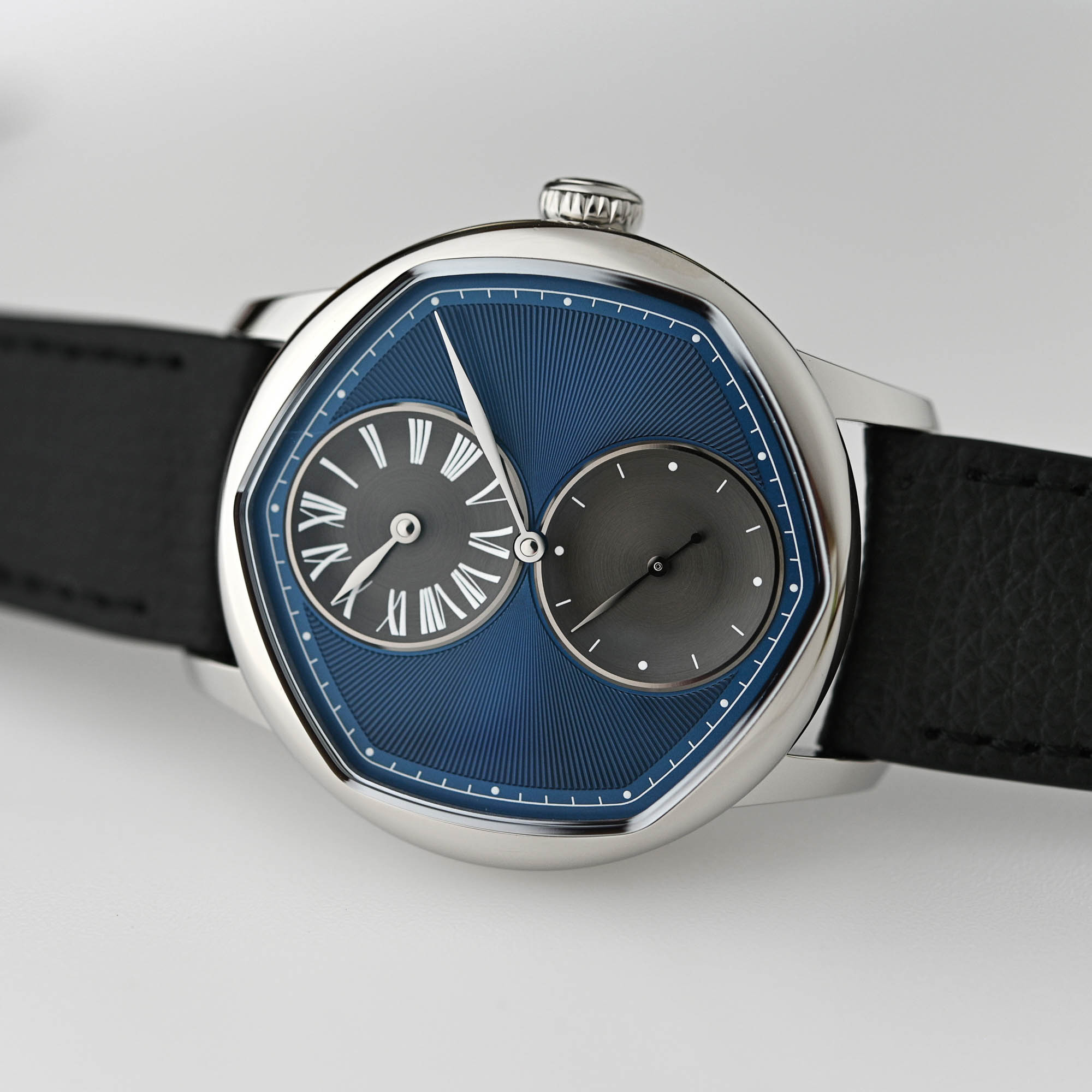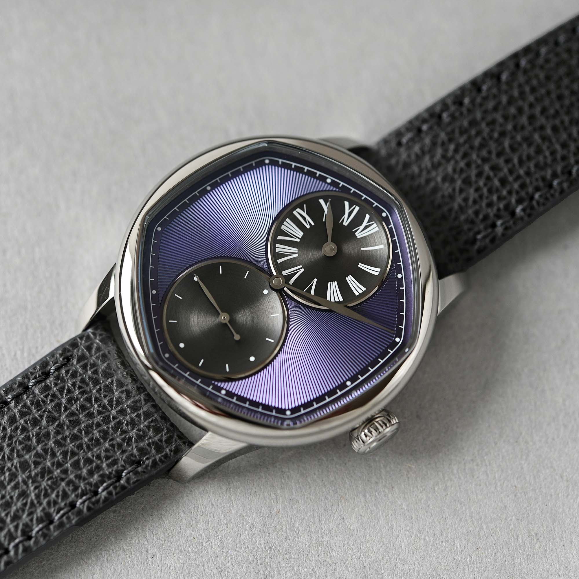 The new collaboration watch is offered with a mauve or blue dial and is limited to 178 pieces in each colour. As a regulator, the all-important minutes track is featured on the periphery and indicated by a central hand but is hexagonal to underscore the six-sided dial opening. The hours are relayed in a sub-dial with Roman numerals at noon, and the small seconds are at 6 o’clock. To give the watch its bespoke identity, the sunray pattern on the PVD dial base evokes traditional guilloché finishing, while the two anthracite-coloured sub-dials are concave and have a circular satin-brushed finish, suggestive of an engine-turned decoration.