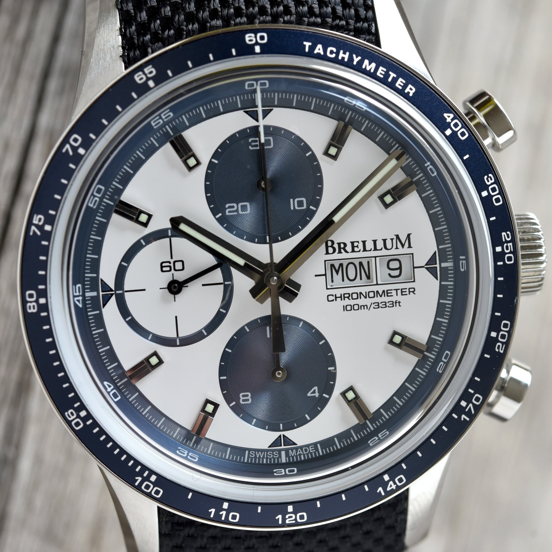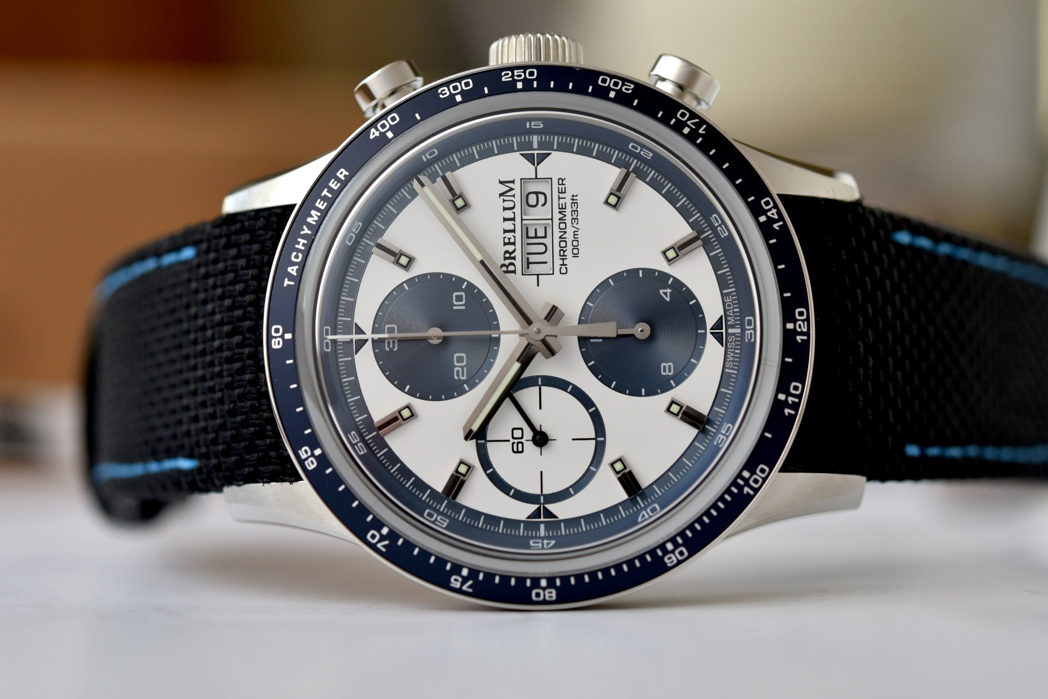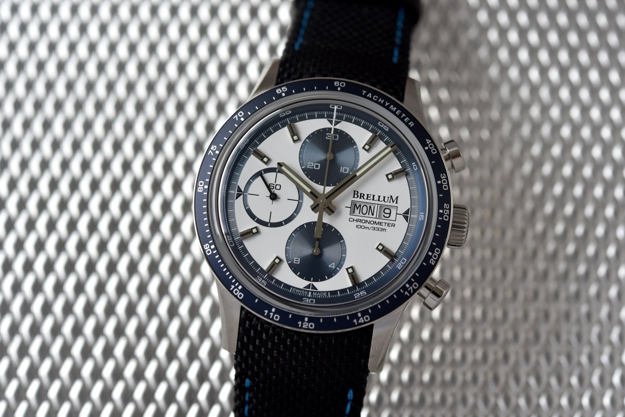 The latest version of Brellum’s sports-oriented chronograph gets a white-and-blue makeover.