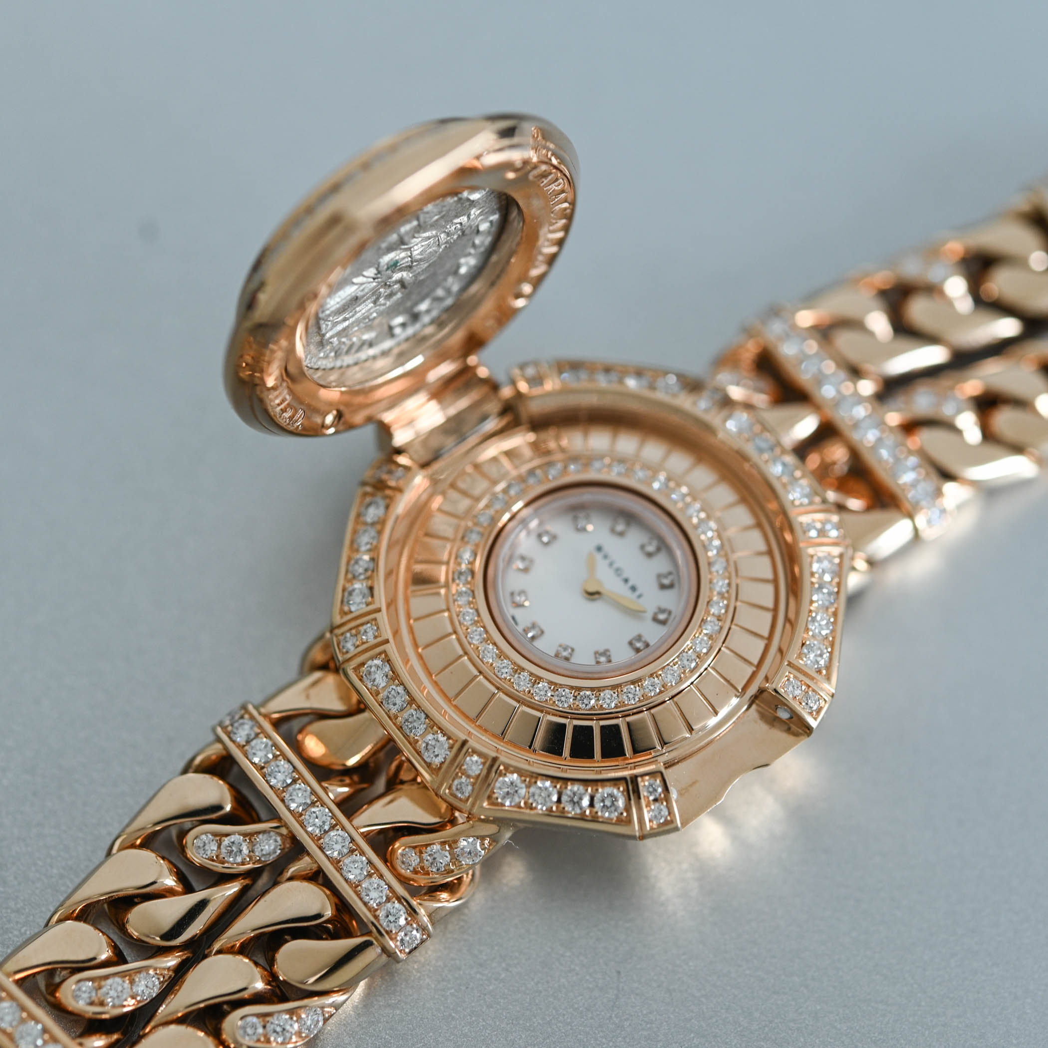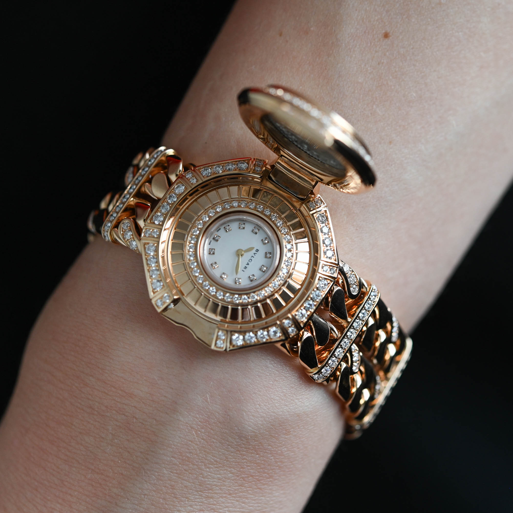 The second Monete Catene model is crafted in rose gold and features a silver denarius coin on the cover depicting Emperor Caracalla (198-217 AD). Like many of Bulgari’s designs, the case replicates architectural features from Rome’s Imperial past. The octagonal case is said to be inspired by the coffering on the ceiling of the Maxentius Basilica in Rome. Set with brilliant-cut diamonds, the section at 3 o’clock can be opened to reveal the dial. Despite the geometry of the case, the watch has round, fluid forms that flow into the two rose gold chains that comprise the bracelet.