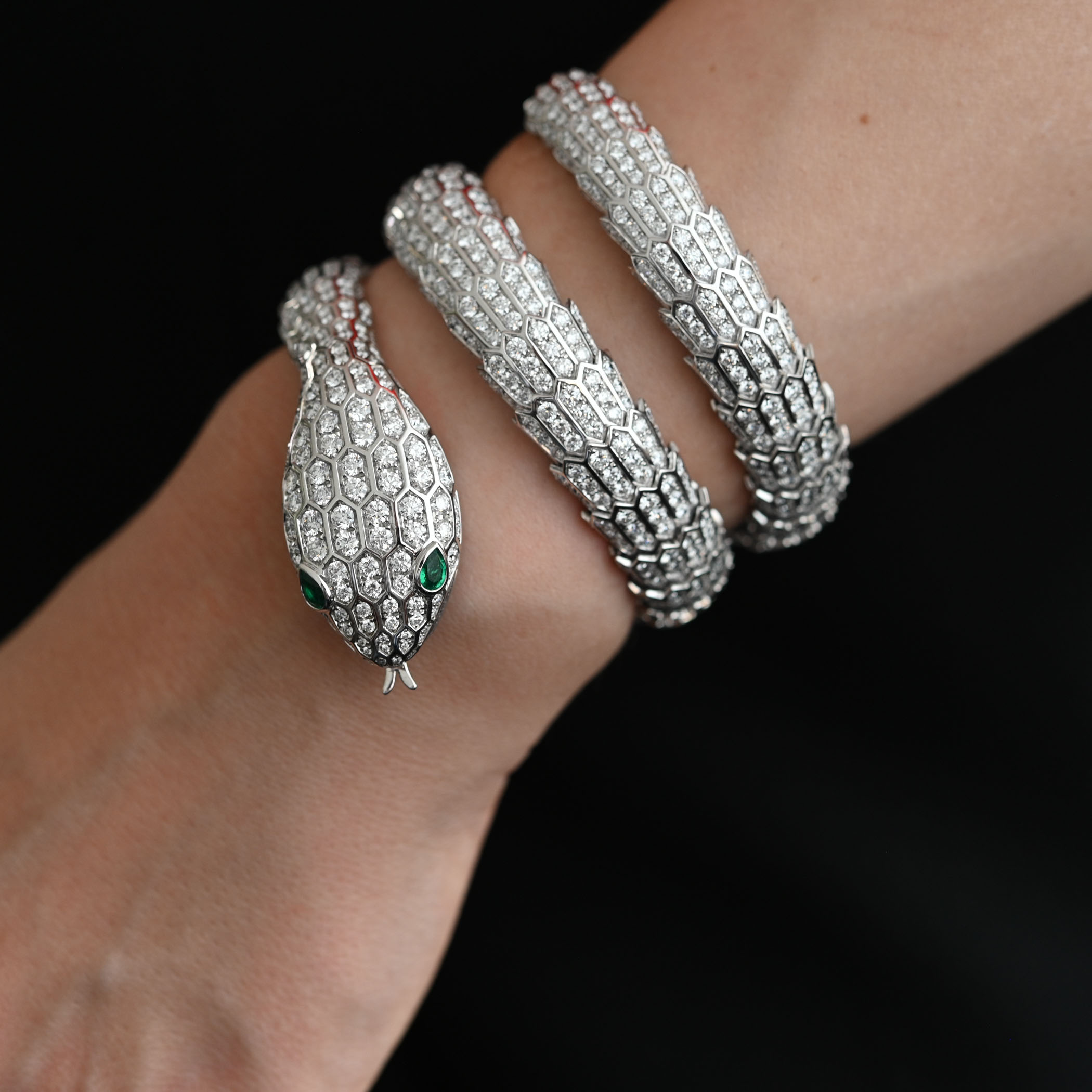 Each of the Serpenti’s overlapping hexagonal scales is cast using a lost-wax technique, and its sinuous body coils around the wrist in two turns. The white gold model glistens with the light of 116 brilliant-cut diamonds, and the eyes glow with the alluring light of pear-shaped emeralds. The snake’s head, complete with a gold forked tongue, guards the pavé-set dial powered by the tiny, ultra-thin Piccolissimo calibre.