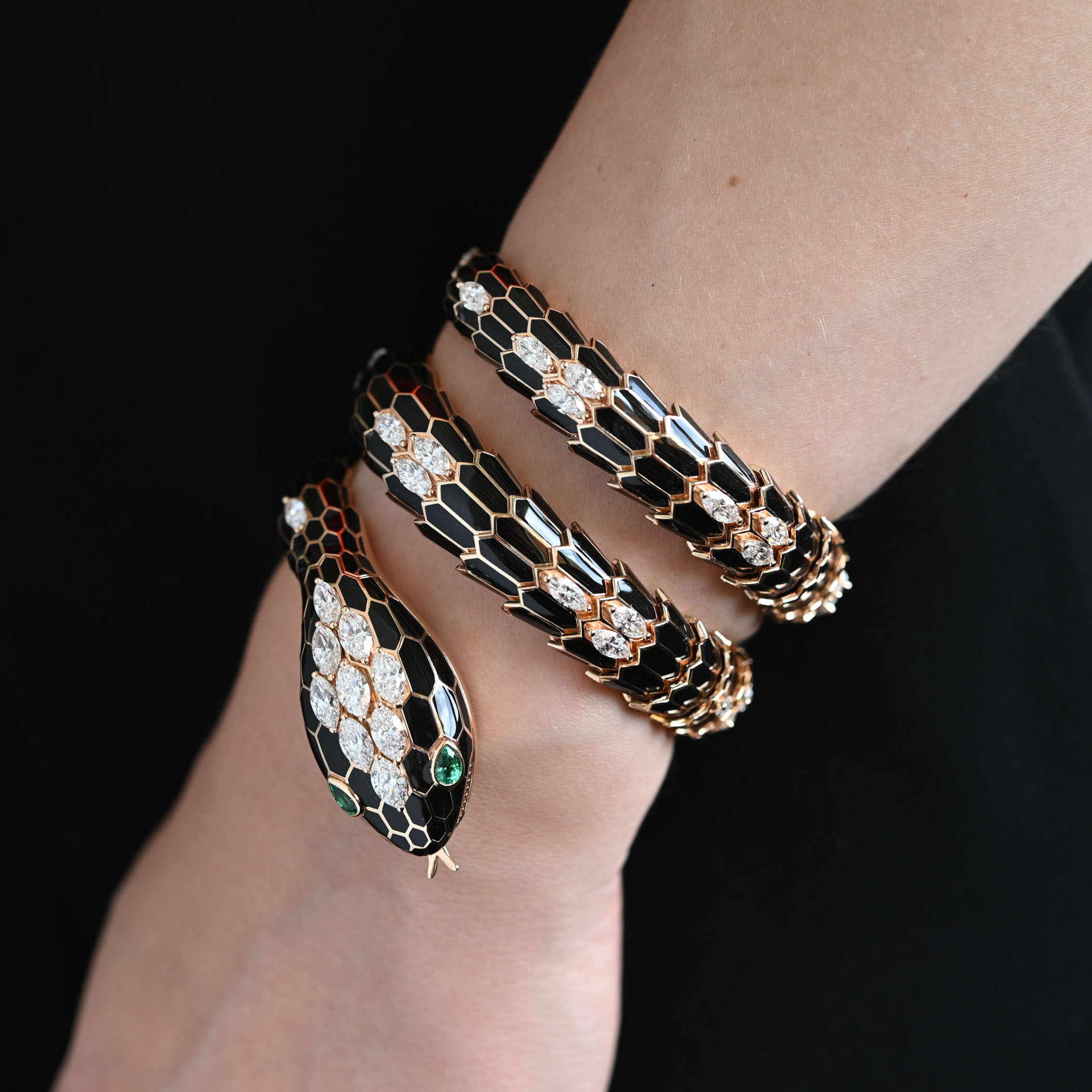 The dramatic rose gold Serpenti Misteriosi has black lacquered scales punctuated with navette-cut diamonds. Like the white gold snake, the eyes are pear-shaped emeralds.