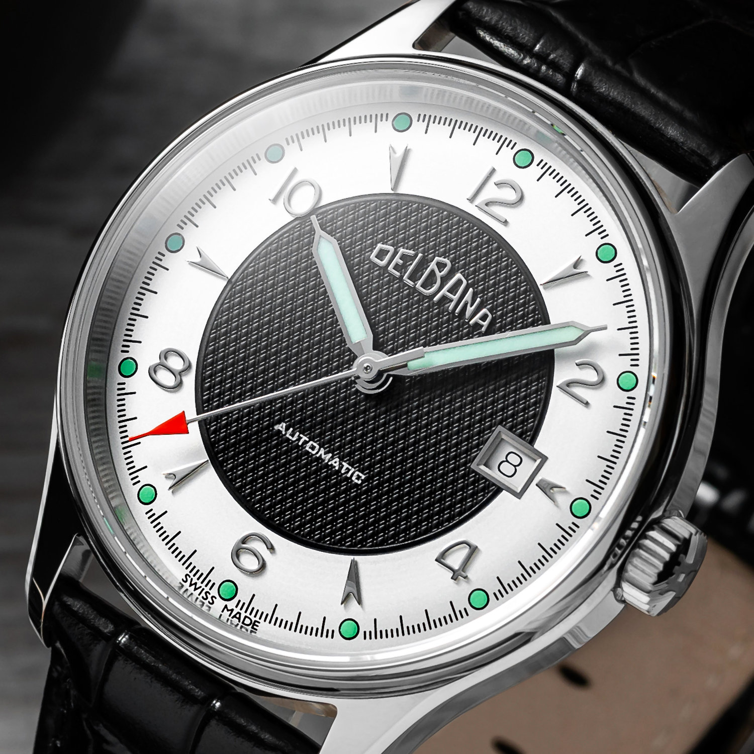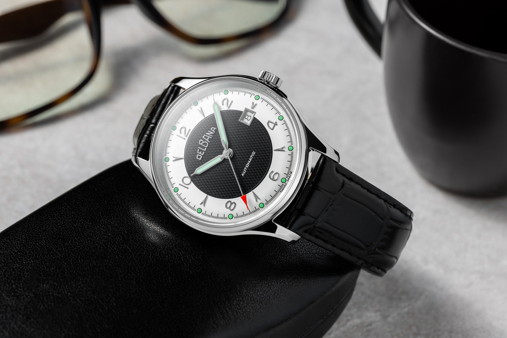 The dial for the Delbana Rotonda is a mix of black and white, much in vein of the Recordmaster. From the outside in, we see a minute track with vintage green luminous dots. One step inward we see applied polished hour digits for every even hour, and arrow-head shaped indices for every odd hour. The middle section is in black, with a subtle guilloché pattern engraved into it. A pair of cathedral hour and minute hands indicate the time, with a red arrow-tipped seconds hand. At 3 o’clock there’s a framed date window with a black on white disc underneath.