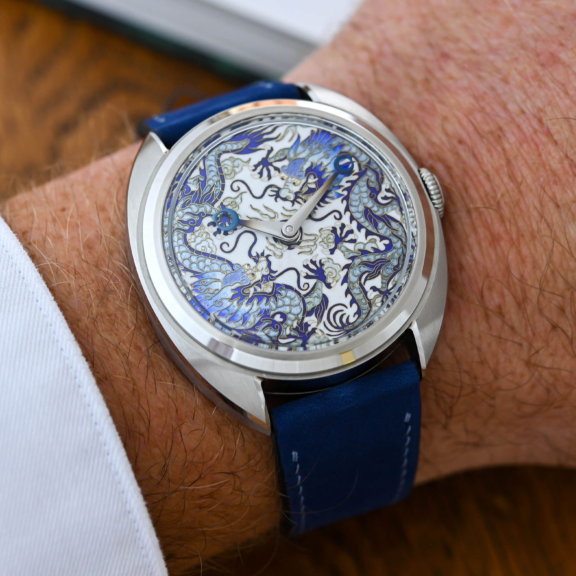 Featuring a classic Chinese motif, the Céladon Century Double Dragon was created to celebrate the year of the Dragon and Céladon’s Zodiac anniversary, marking 12 years (a complete Chinese zodiac cycle) since the creation of the brand. The watch stands out with its two dragons fighting playfully. Rendered in blue and white, typical Ming-inspired colours, these are traced in cloisonné enamel. Cloisonné is a delicate and time-consuming process. The enameller creates the contours of the patterns with fine gold wires. The cells created by these “cloisons” are then filled layer after layer with enamel and fired in a kiln.