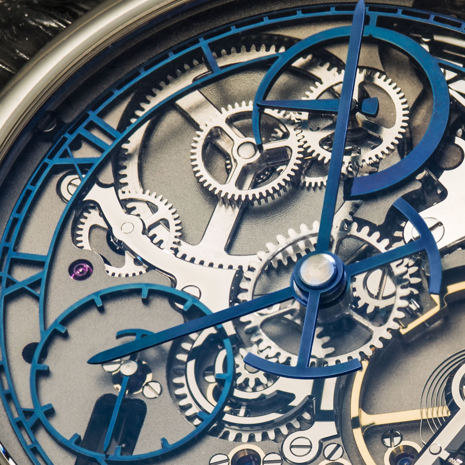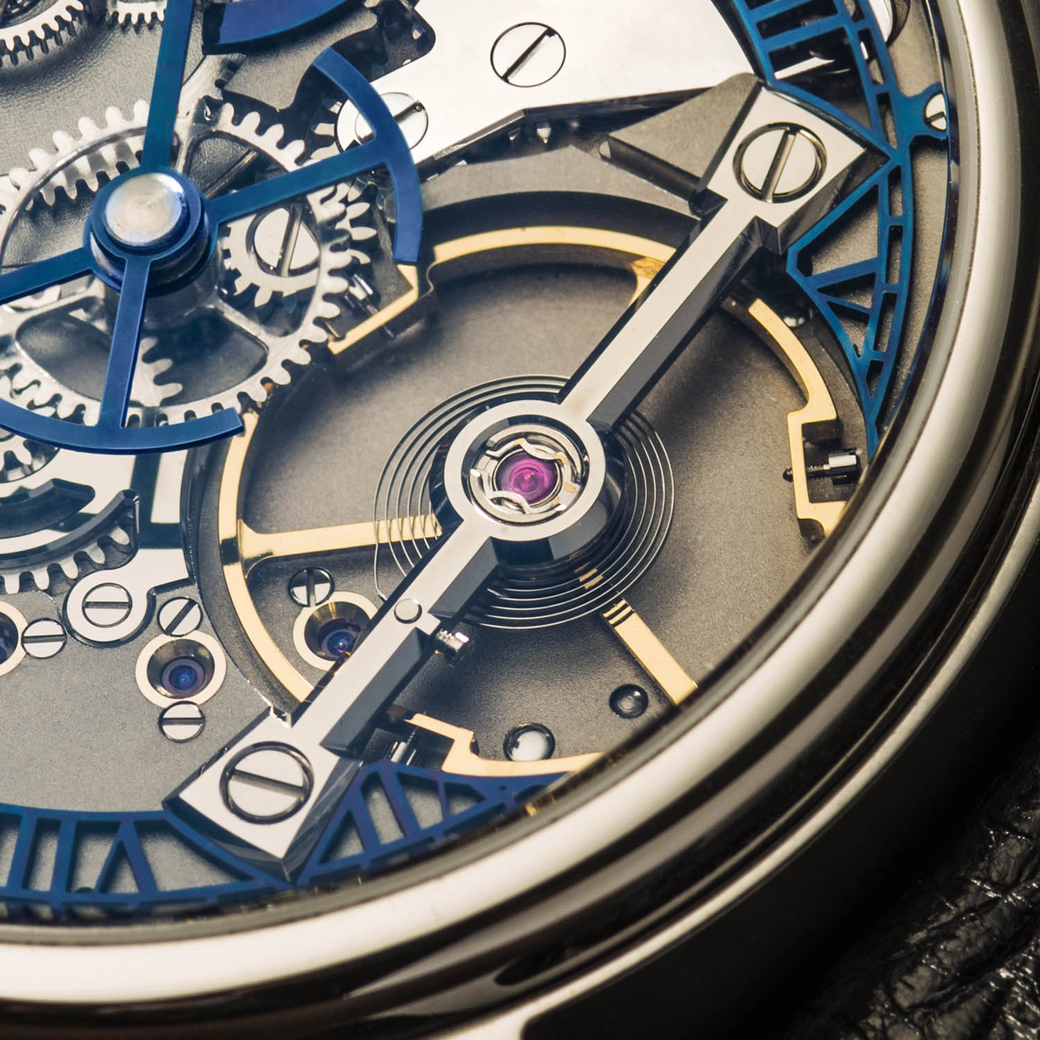 The gears of the movement, along with several other components, are made by Garrick in-house, on traditional machinery. On the edge of the dial side of the movement, a heat-blued hour track is positioned. This slightly edges out at the bottom to allow full view of the regulating organ. The hour track also incorporates the subdials for the running seconds and power reserve displays, positioned in the top part of the watch. Flip the watch over to reveal the hand-frosted movement with that originally shaped click spring and screwed chatons.