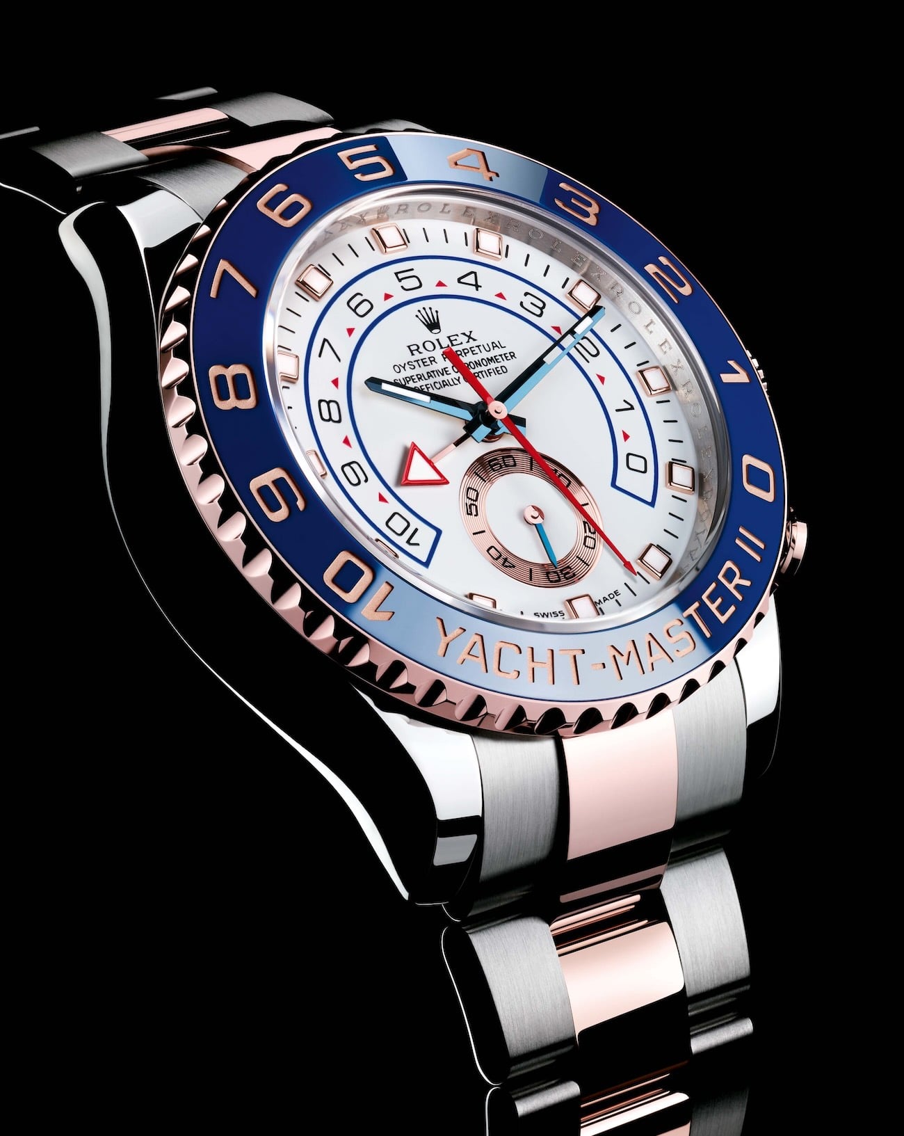 The first versions of the Rolex Yacht-Master II, unveiled in 2007, were the yellow gold 116688 and the white gold version with a platinum bezel, the reference 116689. In 2011, Rolex unveiled an Everose Rolesor edition, the 116681, followed by a full-steel model in 2013, the reference 116680, which also introduced an updated movement, the Calibre 4161, replacing the former Calibre 4160.