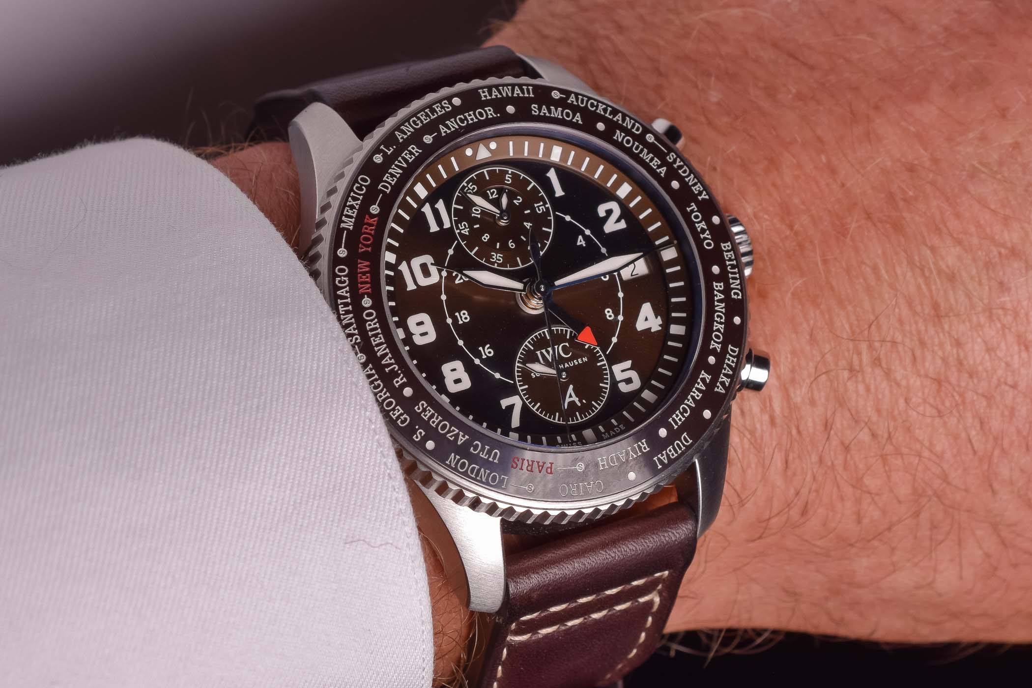 Powering the IWC Pilot’s Watch Timezoner Chronograph IW395003 is the in-house Calibre 89760, an automatic, integrated chronograph with column wheel and vertical clutch. This modern movement boasts a comfortable 68-hour power reserve and beats at 28,800 vibrations per hour. The flyback function is a nice addition and the pushers have a nice, firm feeling.
