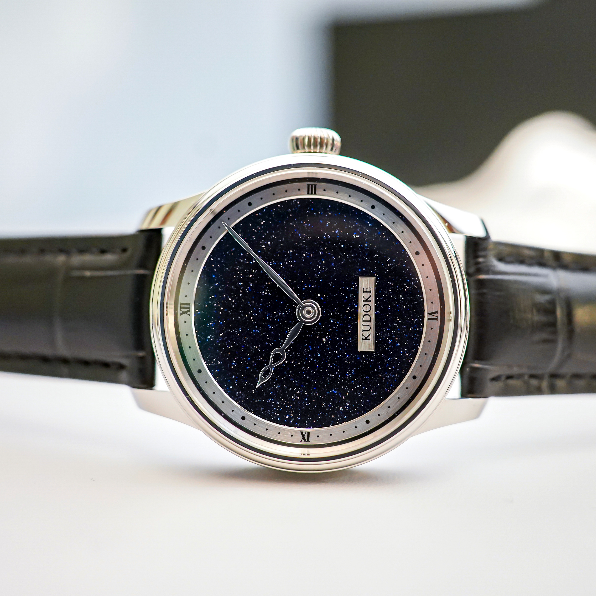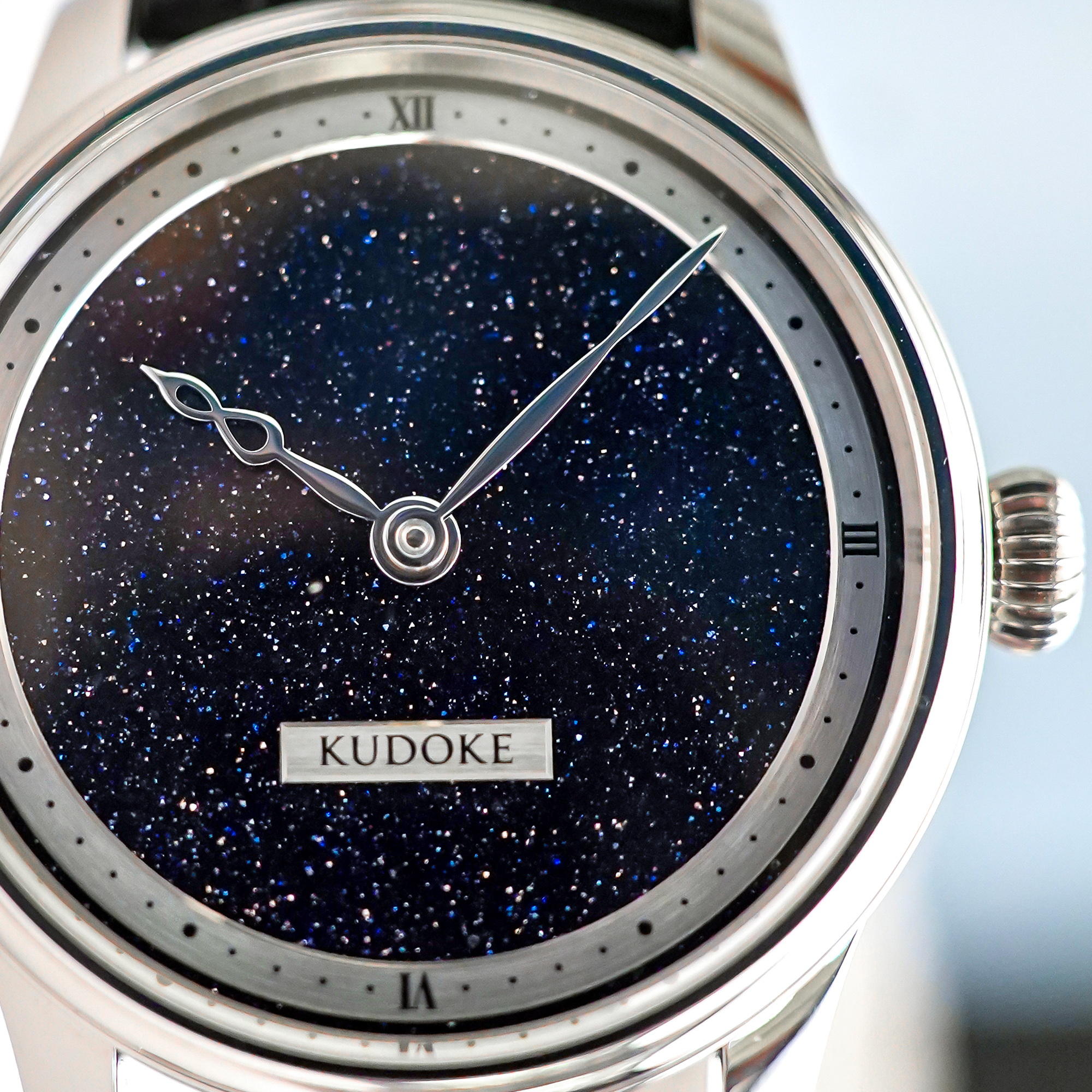 Also known as goldstone, the story behind aventurine glass (from the Italian a venture, meaning by chance) involves a Murano glassmaker who mistakenly introduced copper shavings into molten glass. Evoking the unfathomable mysteries of the cosmos, the sparkling aventurine dial of this Kudoke is hypnotic. Framed by a rhodium-plated chapter ring with Roman numerals and dots, the hours are indicated by an elegant hand with an infinity symbol at its tip and a slender minutes hand with a slight taper to echo the shape of the hour hand.