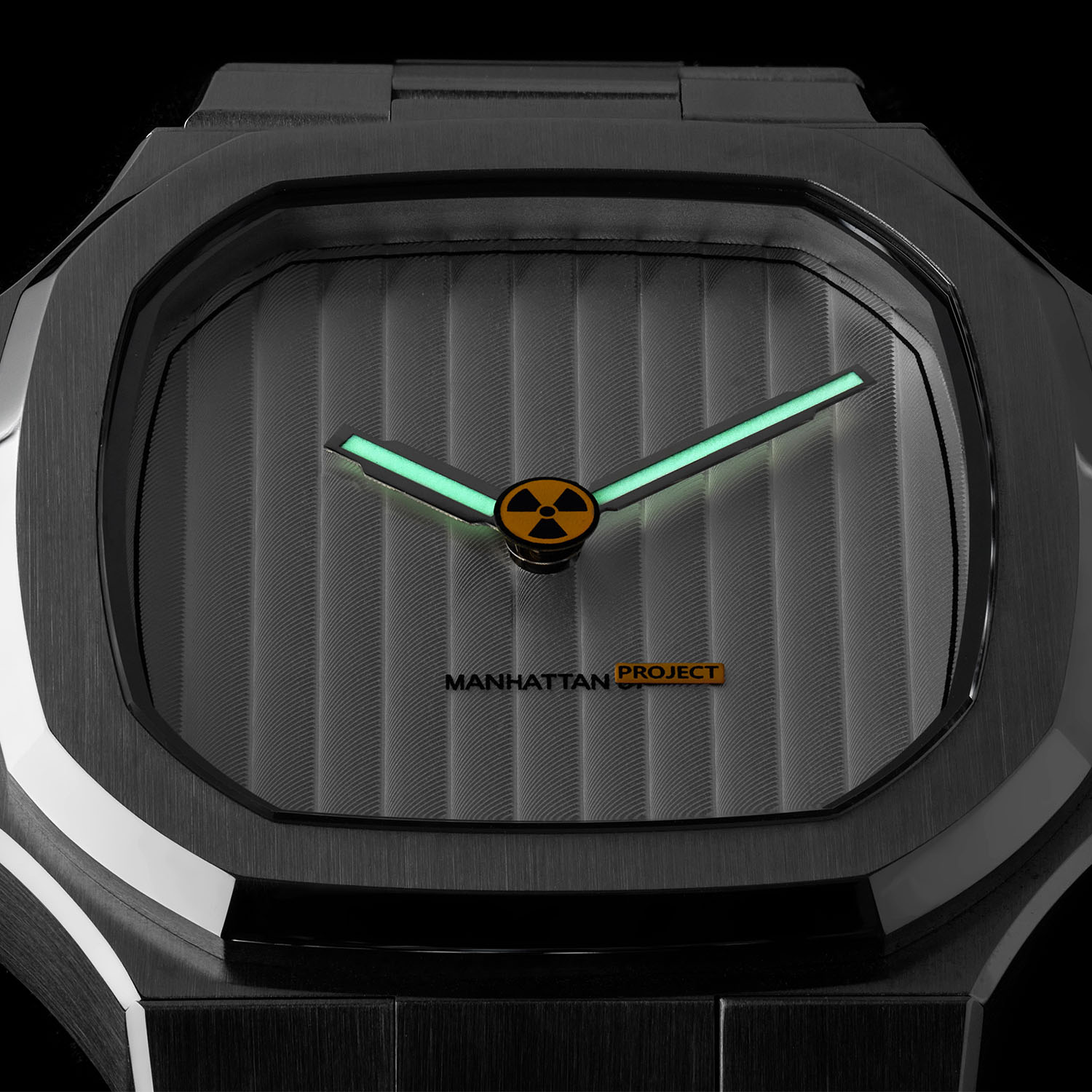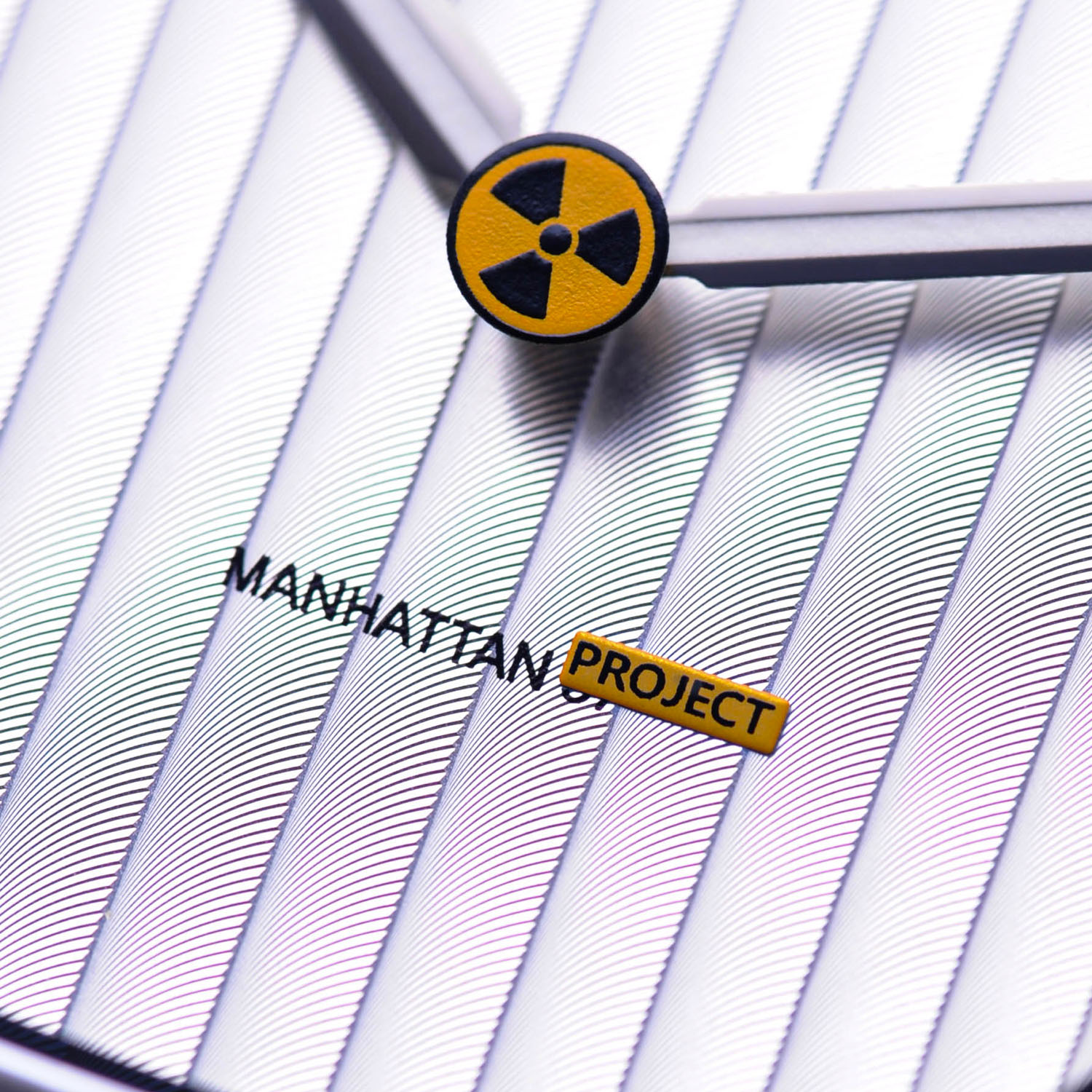 The ice-grey dial of the Maen Manhattan Project watch stands out with vertical Côtes de Genève stripes and a minimalist look with no logo, indices, or date window – a symbol of “nuclear nothingness”. Only the uniquely shaped central hour and minute hands, treated with a generous stripe of Super-LumiNova, are present, and, adding a bold touch, the seconds hand is replaced by the nuclear hazard symbol. While the original Manhattan 37 model displays the model name below the centre, the Project watch replaces it with a striking yellow “Project” plaque, enhancing its dramatic appeal.