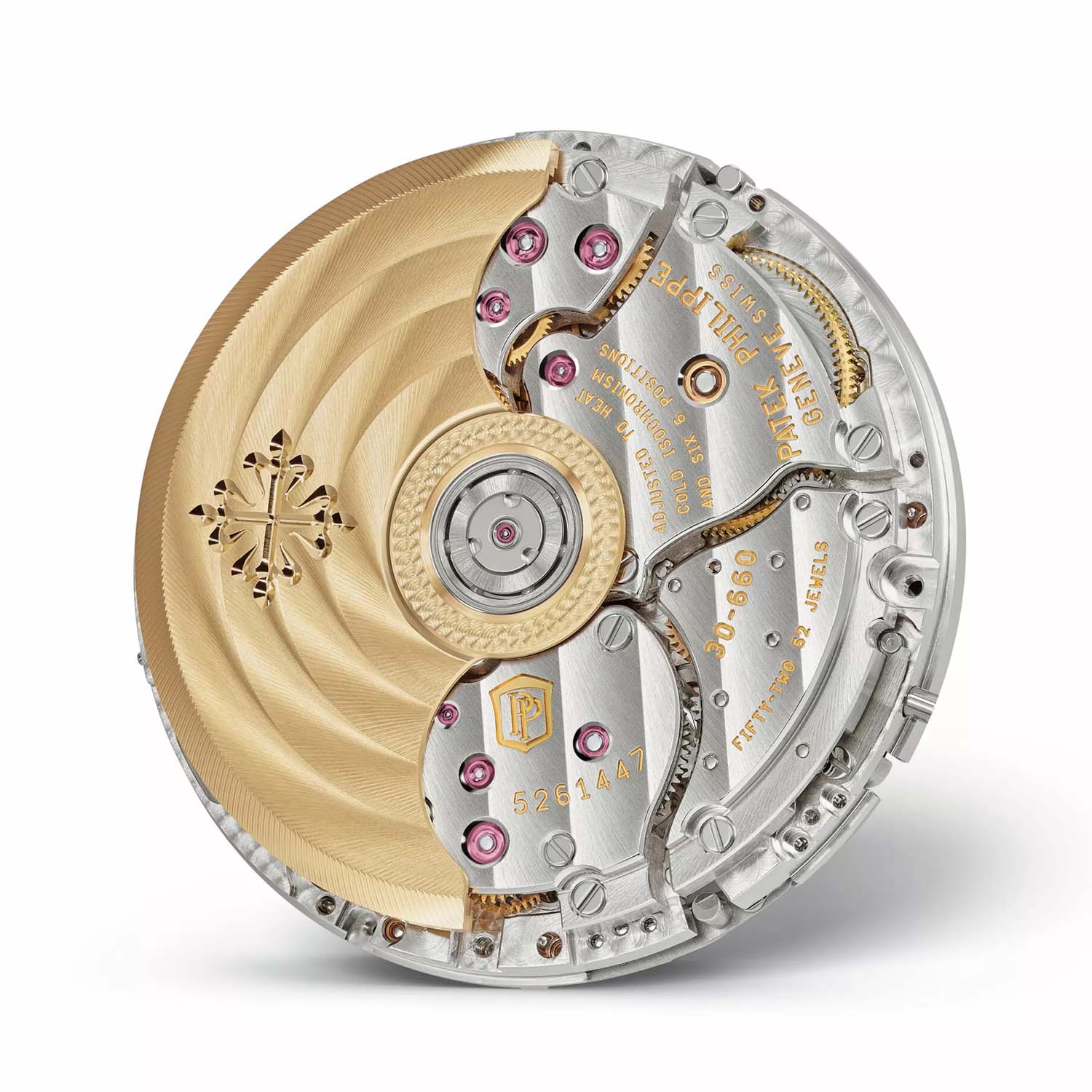 Crafted from 18K white gold, the 5322G features a 41mm diameter and a single push piece at 2 o’clock. It stands out with the Clous de Paris (hobnail) pattern that adorns the entire circumference of the caseband. To accommodate this continuous guilloché motif, the case employs a unique construction where the lugs are an integral part of the case back, rather than being soldered to the case middle.