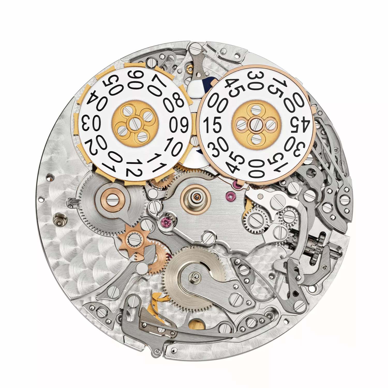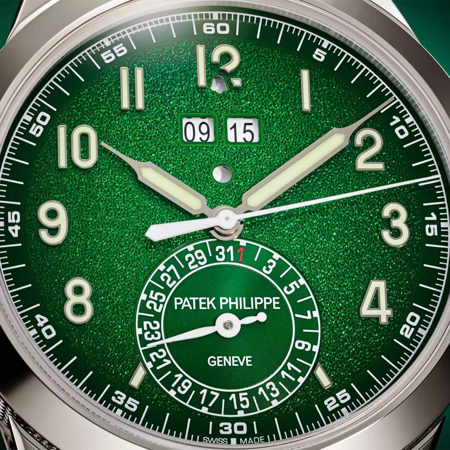 The 5322G is slightly simpler, focusing on the alarm only. Its design is less complex, less polarizing and resolutely modern with a Calatrava case with a hobnail pattern and a grainy gradient dial. Available in green or blue, the grainy gradient dial of the new 5322G-001 and 5322G-010 is obviously derived from the style inaugurated in 2022 with the references 5226 and 5326. The white gold applied numerals and syringe-style hour and minute hands feature luminescent material. The seconds and date hands are painted in white.