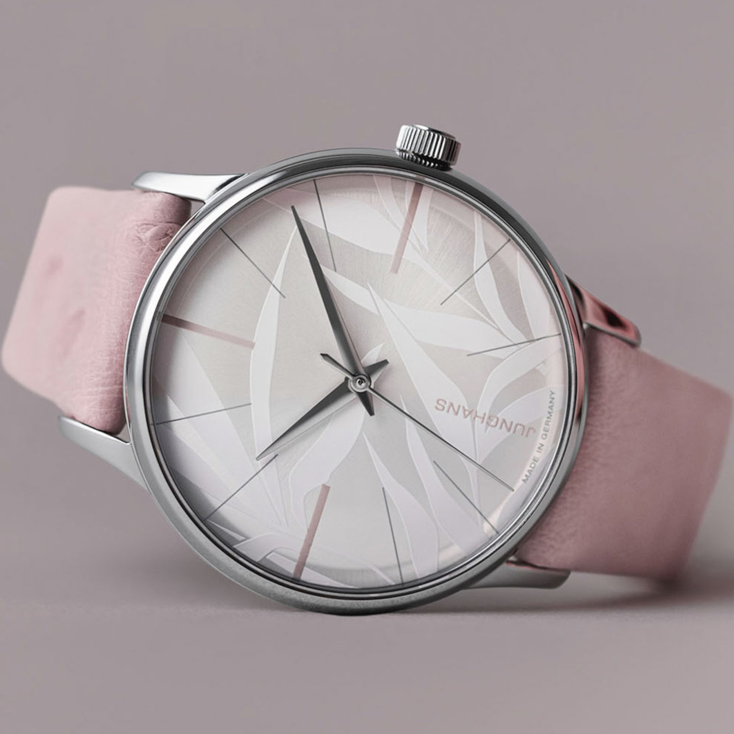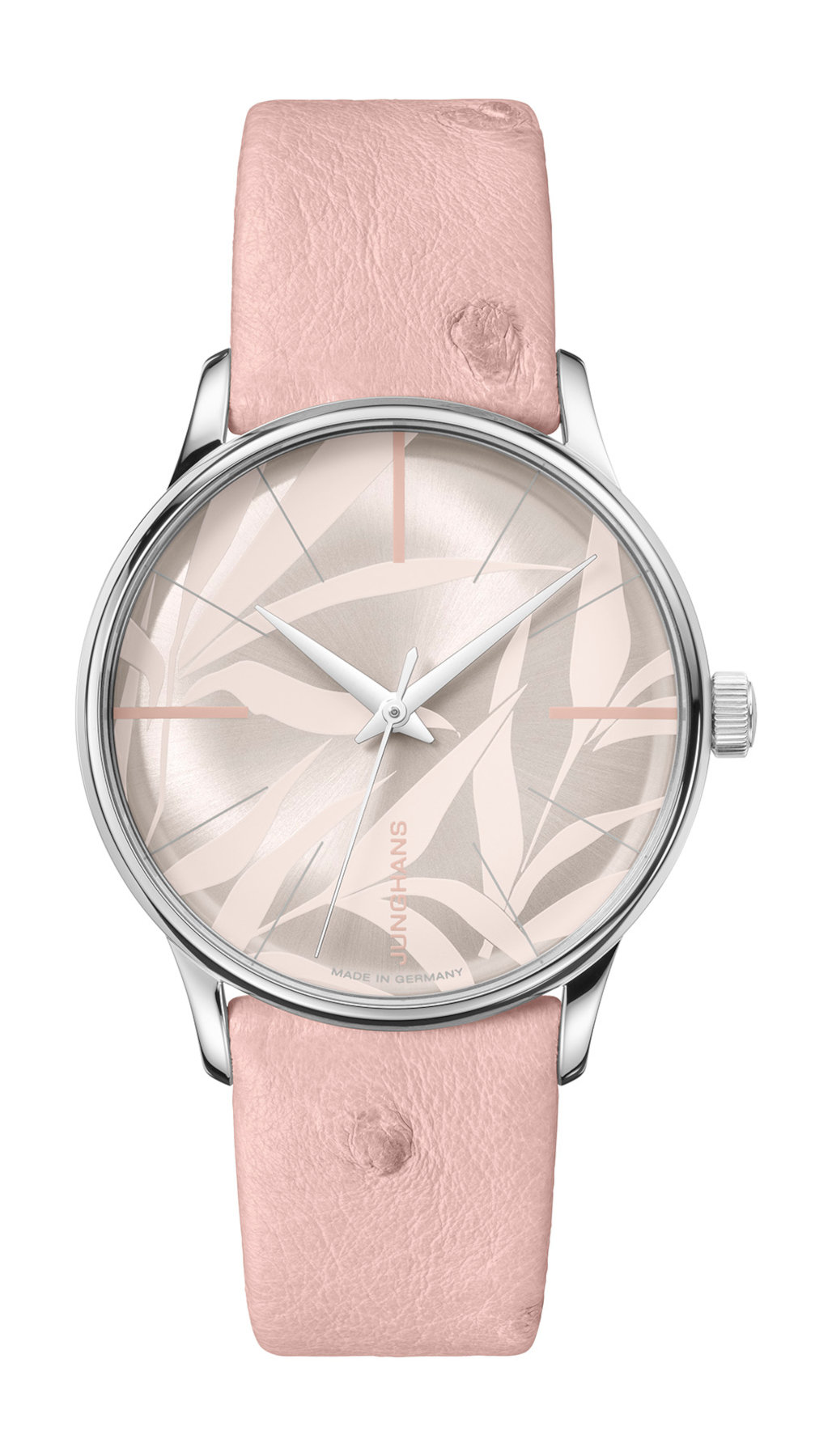 The inscription Junghans, printed in pink, is placed vertically at 6 o’clock. The watch is powered by the automatic calibre J840.1, which has a power reserve of 38 hours. The brand name appears in an unusual position at 6 o’clock and is printed vertically. Matching the delicate pink tones of the dial, the pink ostrich leather strap features a quick-release system. The price is set at EUR 1,440 incl. taxes.