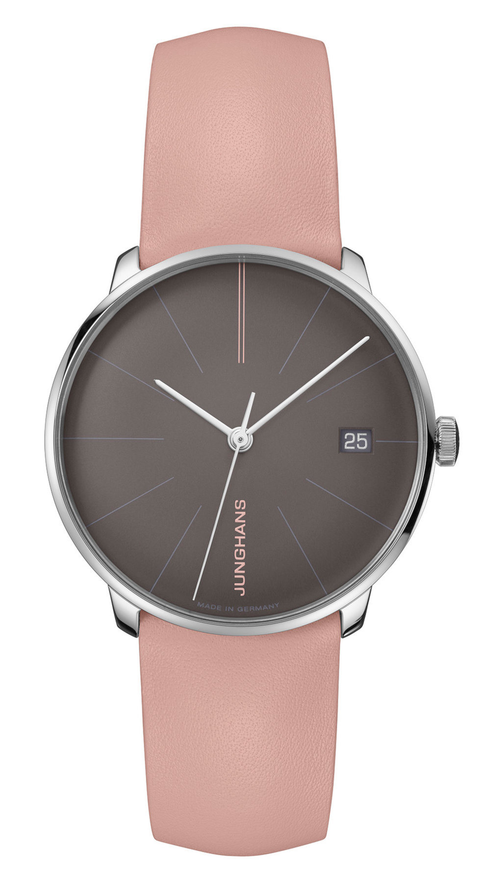 Slightly larger at 35mm, the polished steel case of this model has a relatively slim height of 10.1mm and a. Embracing the brand’s minimalist design ethos, this model plays with subtle colour nuances. The dial has a sleek matte grey background combined with elongated hour markers and a double marker at noon in pink, matching the vertical Junghans inscription at 6 o’clock and the curved pink leather strap. The lean baton hands are white, and the date window matches the dial colour. Also powered by an automatic movement, the power reserve is 38 hours. This one is slightly more affordable, retailing for EUR 1,190 incl. taxes.