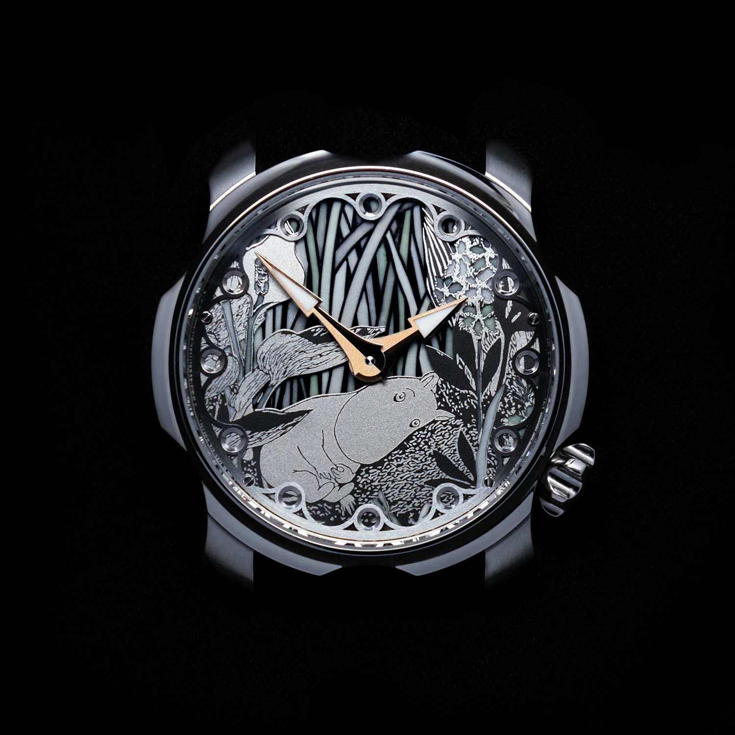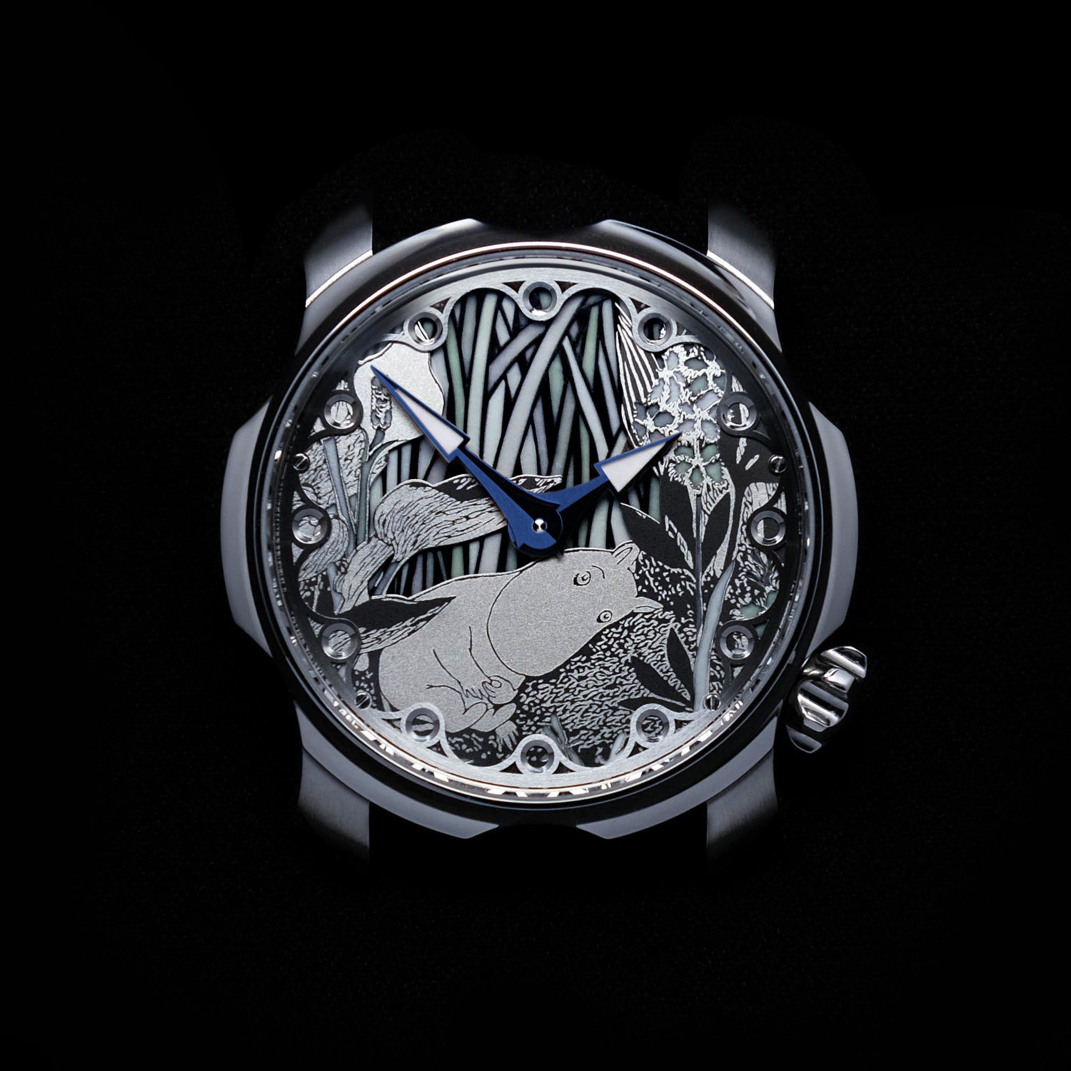 Time is indicated by a set of hand-made hands, in typical Sarpaneva style. A total of four different types of hands are available; Steel Rhodium, Flamed Blue, Red Gold and Pitch Black. All come with a Super-LumiNova insert in the spear-head like tips. Surrounding the dial is a shaped chapter ring with open roundels doubling as hour indices. This chapter ring differs from the first Moomin watch by Stepan Sarpaneva.