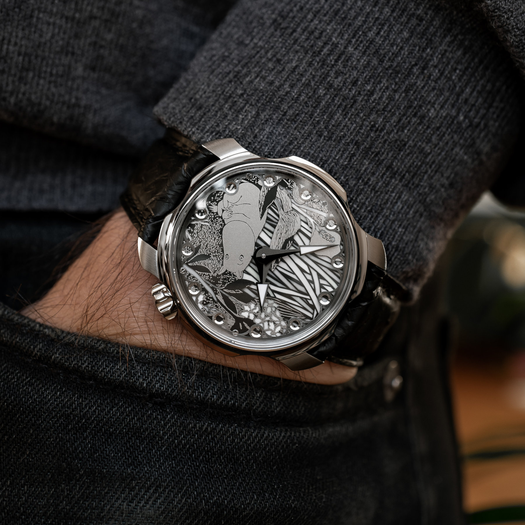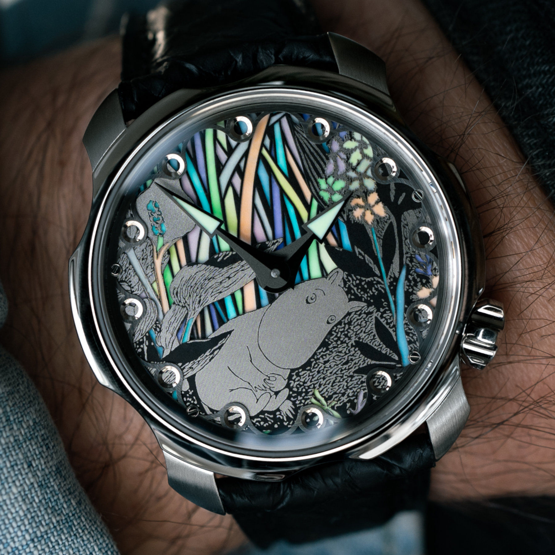 The dial is where the Sarpaneva x Moomin really comes alive. It is a three-piece steel construction, with a lot of depth to it thanks to the multiple layers. The image of Moomintroll resting and waiting for his mother to complete the bark boat is crisp, with engraved trees and bushes surrounding the main character. The background, and some of the stems in the foreground, are hand-painted with multiple colours of Super-LumiNova. The resulting spectacle is a fun, whimsical play of colours and brings even more life to the dial.
