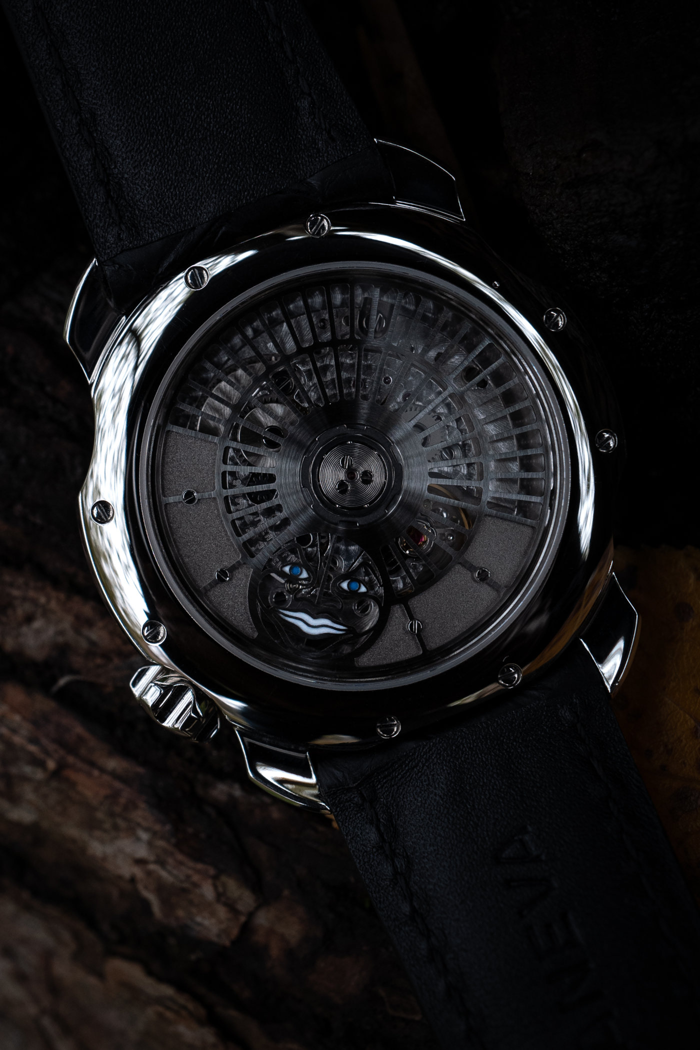 The Sarpaneva x Moomin L.E. is equipped with a modified Soprod A10 automatic movement. This Swiss-made calibre is considered an alternative to the ETA 2829, and measures 25.60mm in diameter and 3.6mm in height. It runs at a frequency of 28,800vph (or 4hz) and provides 42 hours of power reserve. A Sarpaneva watch wouldn’t be complete without the Angry Moonface somewhere, and next to the one on the crown we also find it on the winding rotor. The Moonface has Super-LumiNova for the eyes and mouth, tying it in with the front of the watch.