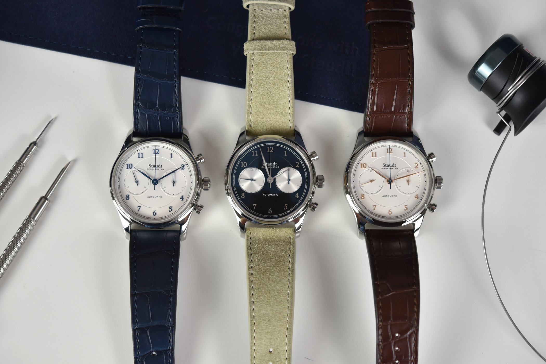 You have a choice of a couple of dials, coming down to black versus white for the stainless steel case or white for the rose gold one. The white or black base dials show some depth through raised areas like the rings around the subdials and the chapter ring that caries the hour indices. The finishing is crisp and very finely done. The applied numerals are either blued or gold coloured on the white dial, or polished on the black dial. Blued, gold-coloured or polished leaf-shaped hands are used for the central hours and minutes, paired with needle-like hands for the remaining indications. The small seconds and chronograph 30-minute hands always match the central hour and minute hands in terms of colour/finishing. Around the outside of the dial is a printed railroad-style minute track. The final details on the dial are the “Staudt Chronometrie” signing at the top, and the hint it uses an automatic movement at the bottom.
