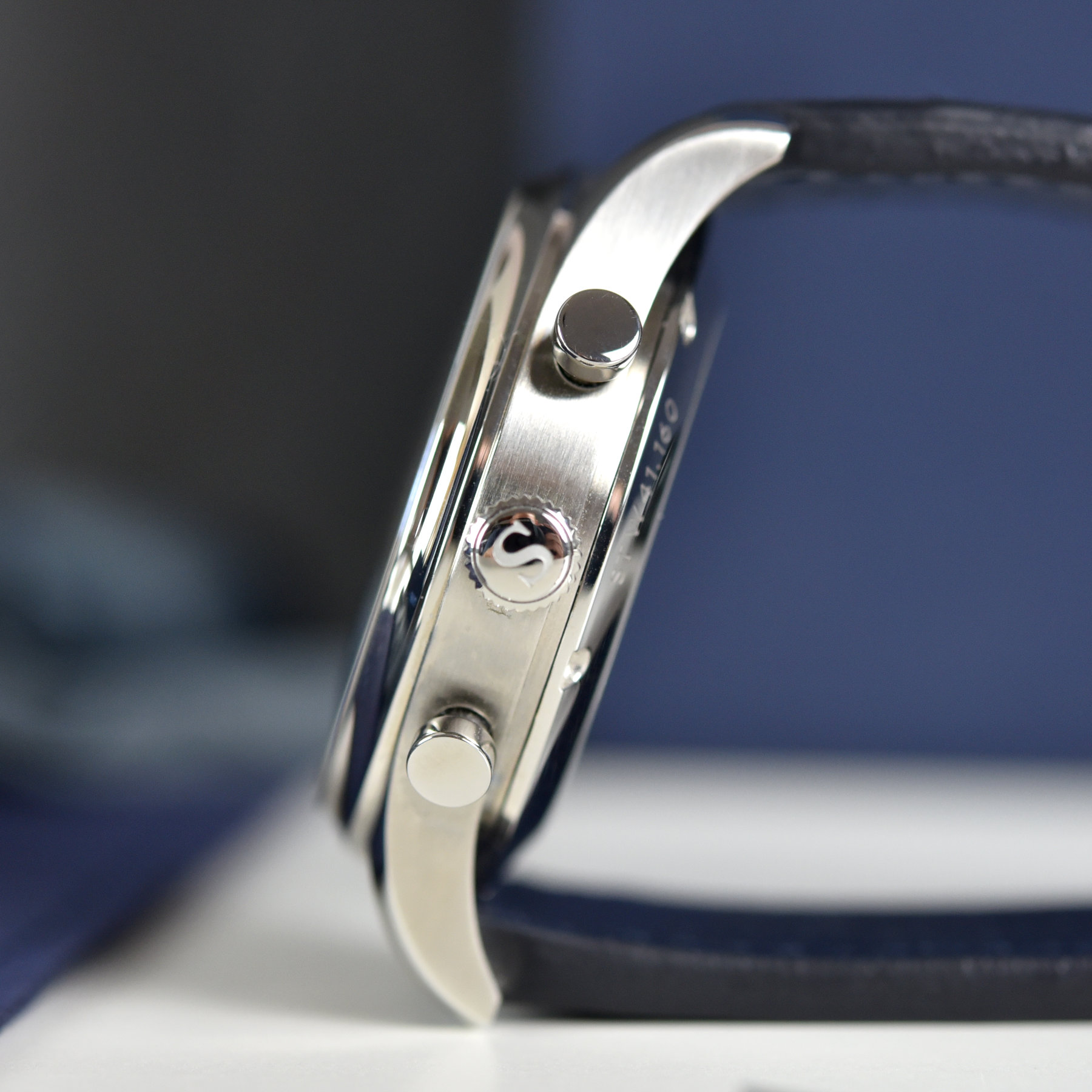 The caseband is brushed on the vertical sides and polished on top. A concave polished bezel rises up to great the domed sapphire crystal. The backside of the case also has a sapphire crystal, held in place by a concave-shaped caseback. Classical pump-style pushers are used for the chronograph, giving a resounding “snap” when pushed. The pull-out crown is knurled for a bit of extra grip and signed with an S, in reference to Staudt.