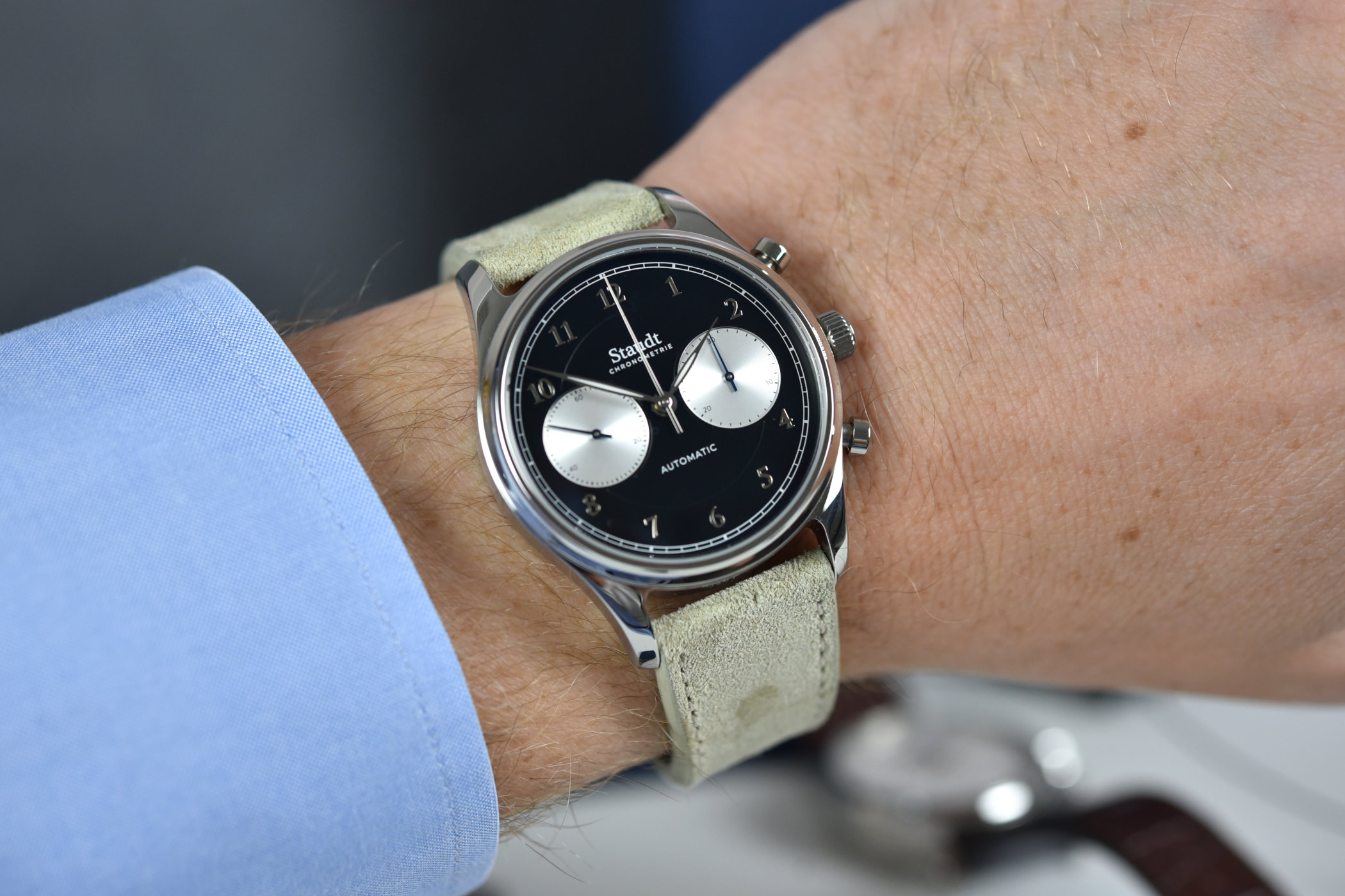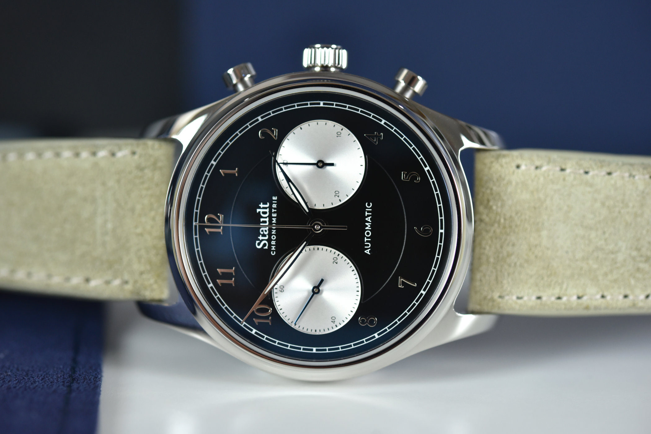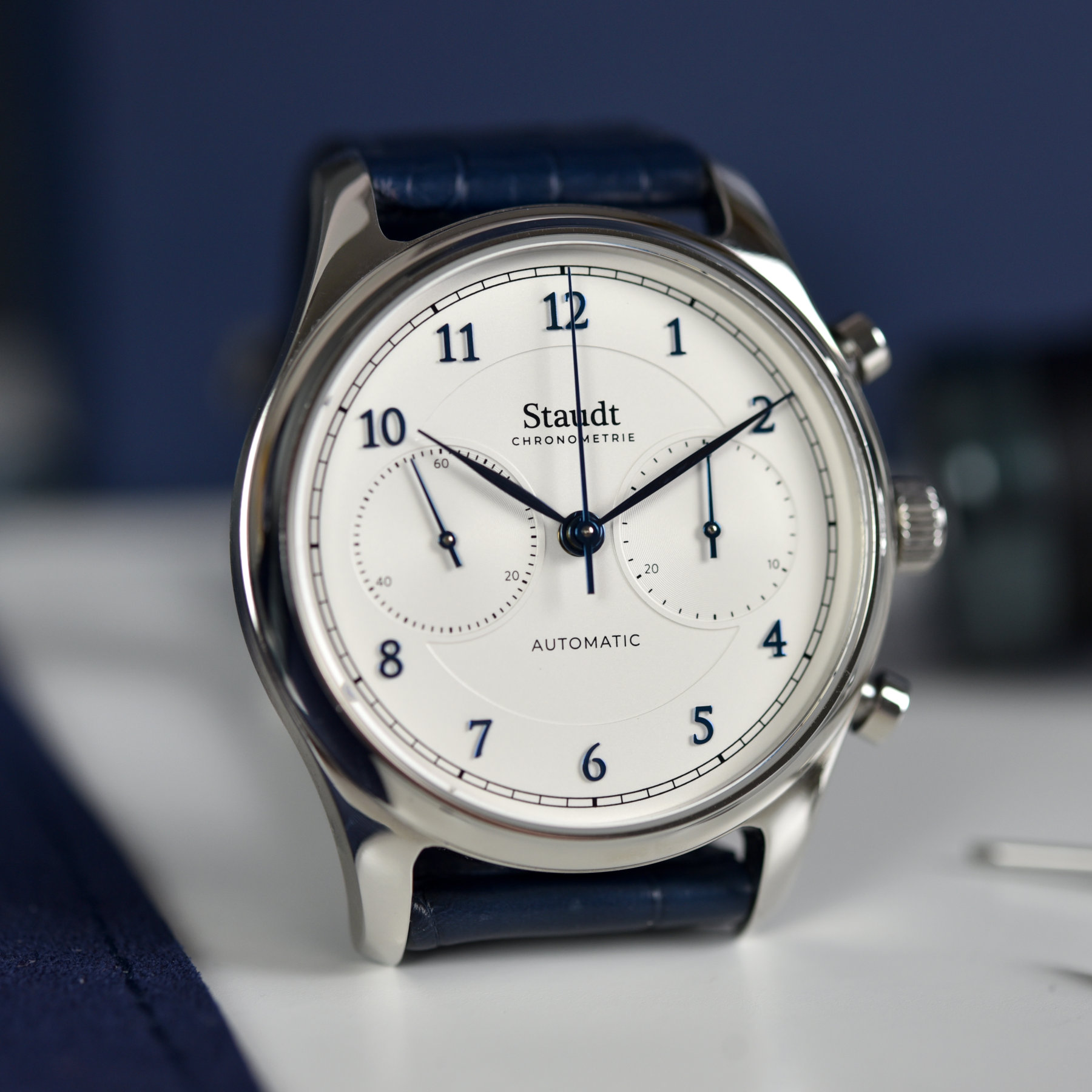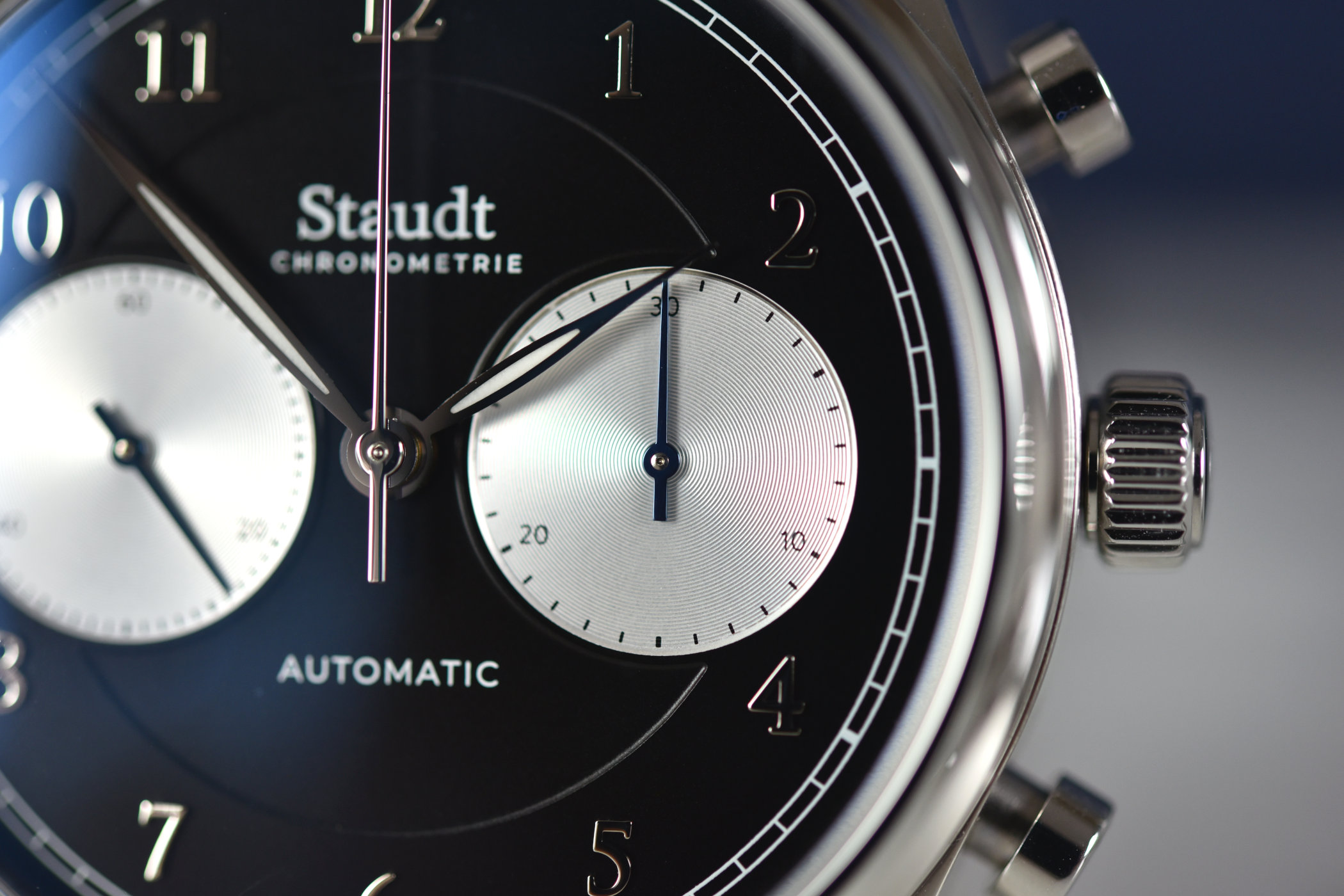 You have a choice of a couple of dials, coming down to black versus white for the stainless steel case or white for the rose gold one. The white or black base dials show some depth through raised areas like the rings around the subdials and the chapter ring that caries the hour indices. The finishing is crisp and very finely done. The applied numerals are either blued or gold coloured on the white dial, or polished on the black dial. Blued, gold-coloured or polished leaf-shaped hands are used for the central hours and minutes, paired with needle-like hands for the remaining indications. The small seconds and chronograph 30-minute hands always match the central hour and minute hands in terms of colour/finishing. Around the outside of the dial is a printed railroad-style minute track. The final details on the dial are the “Staudt Chronometrie” signing at the top, and the hint it uses an automatic movement at the bottom.