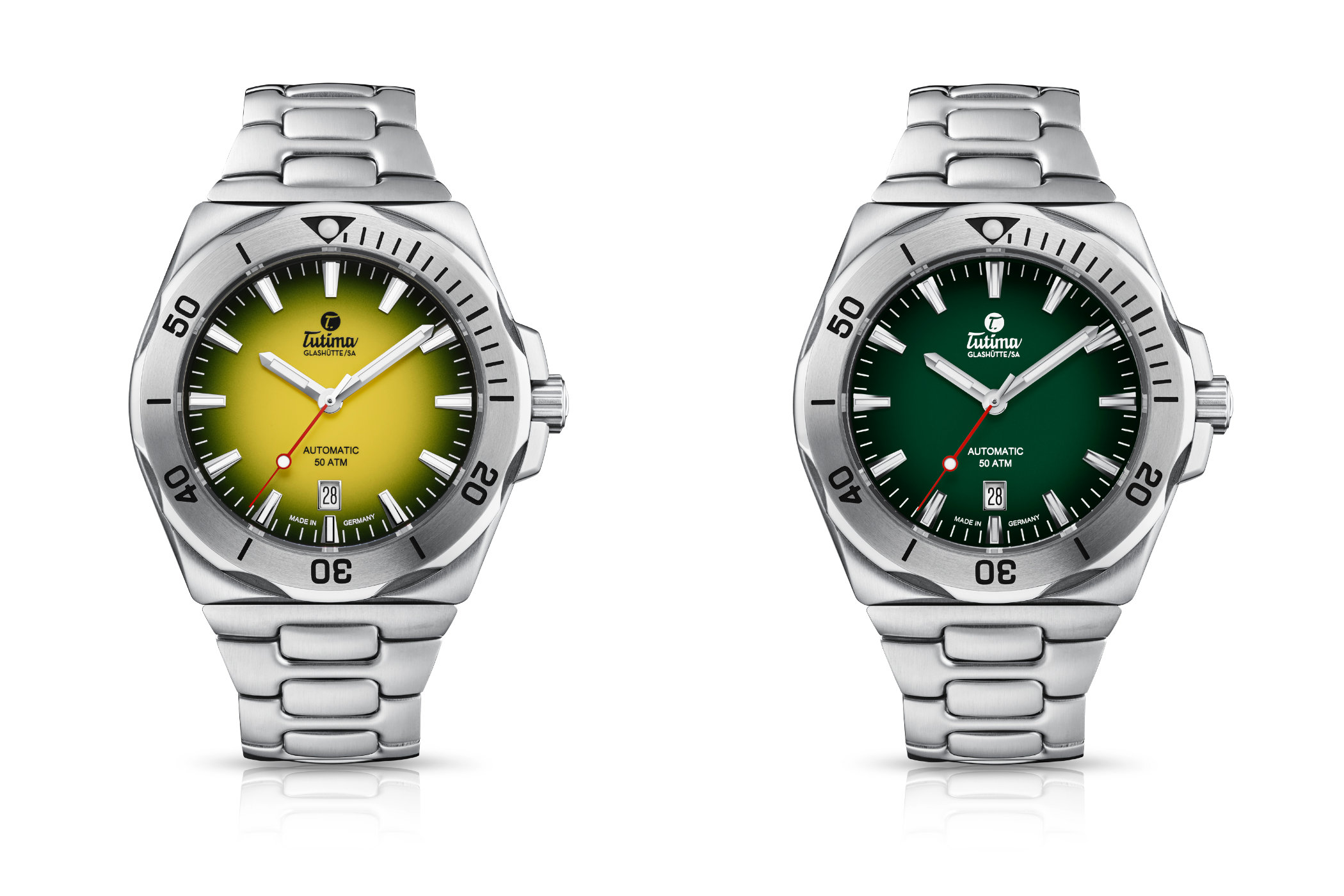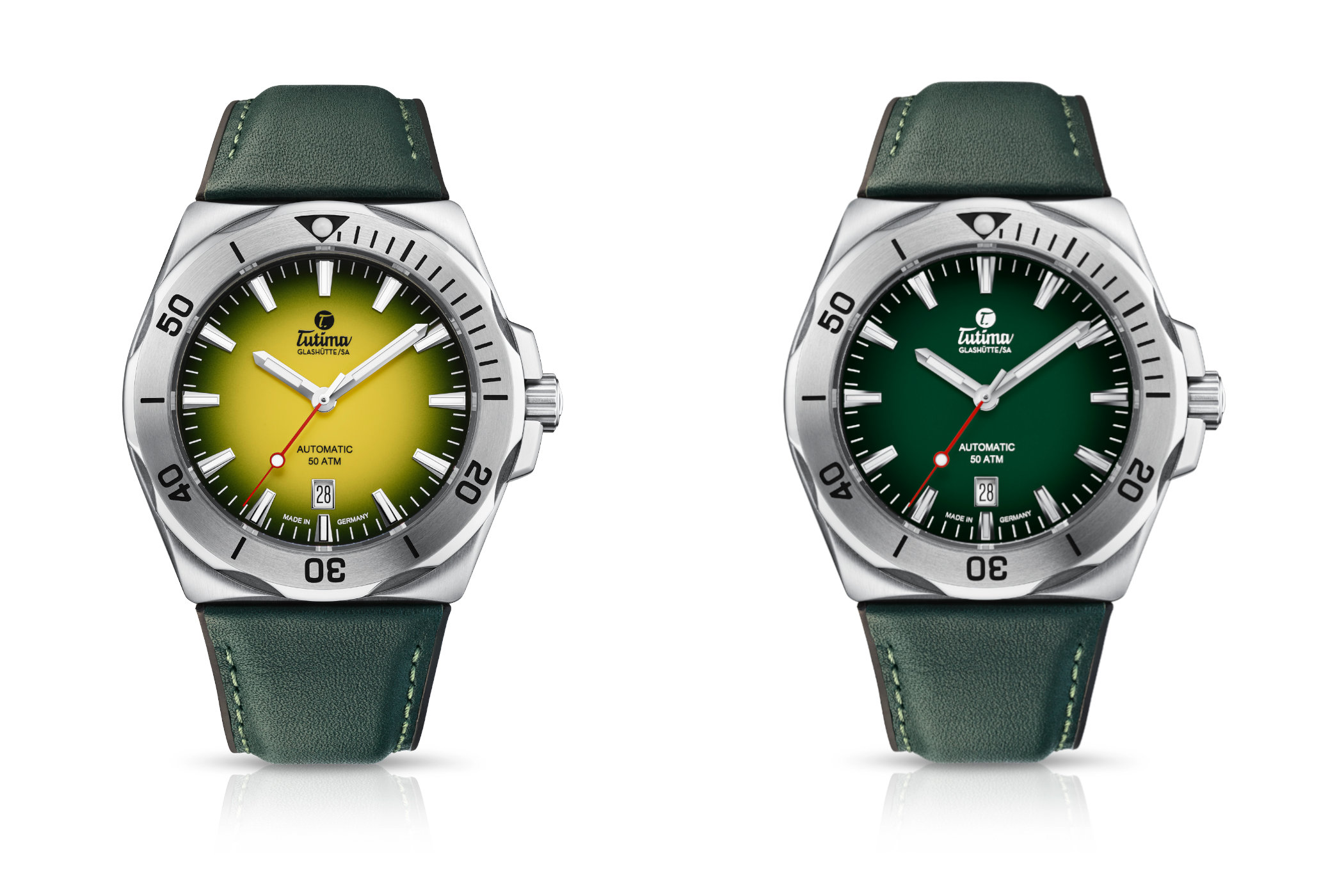 For the dial, Tutima introduces two new colors, both with a dégradé effect. There’s either a distinct vibrant yellow tone, darkening towards green and eventually black towards the edge. The other option is a green dial, very much in line with the biggest trend in watchmaking at the moment. This too darkens at the edge, giving the dial a sense of depth.