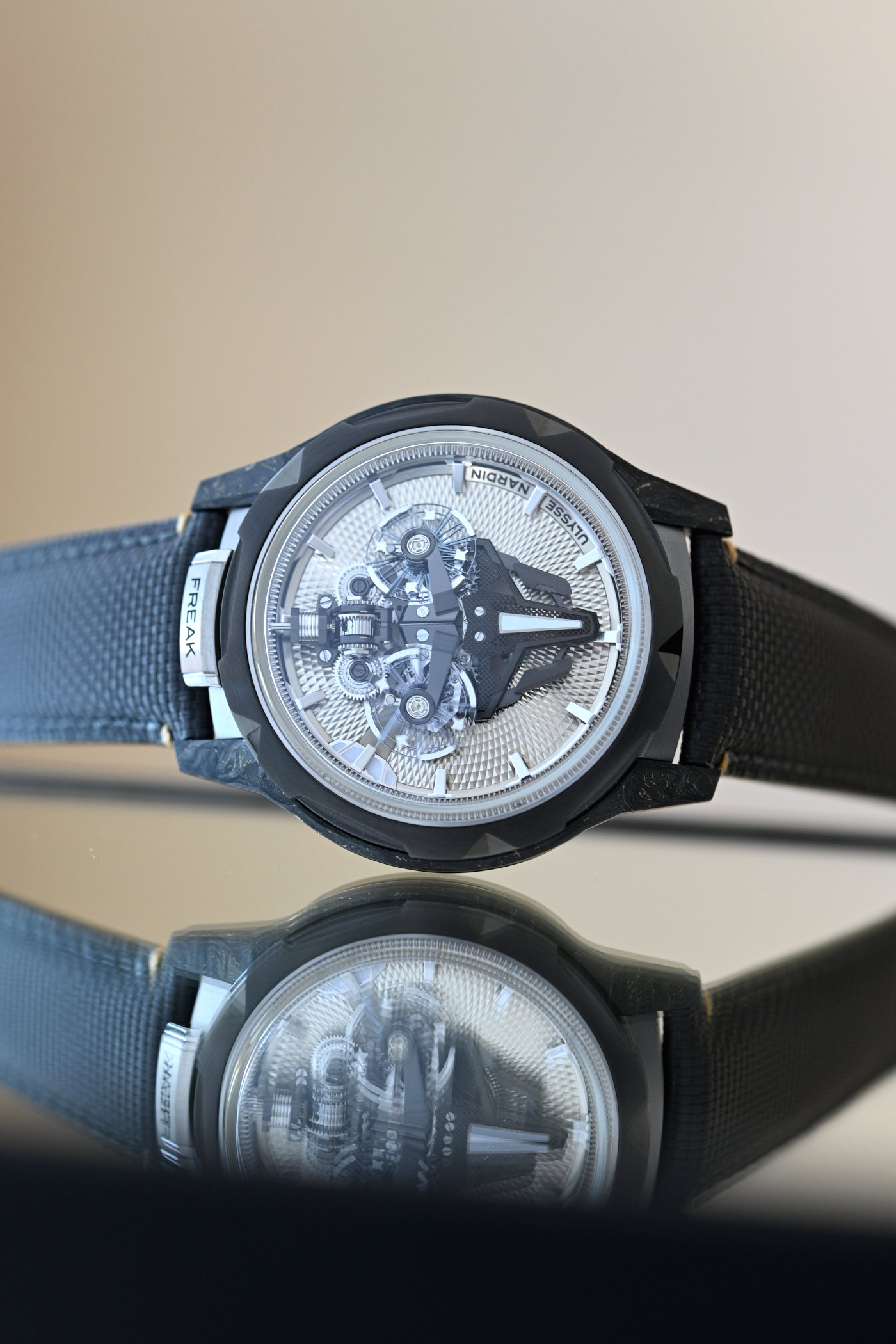 The way time is displayed remains one of the defining features of the Freak concept. The movement performs the role usually assigned to hands. The central bridge, carrying the regulating organ, rotates once per hour to indicate the minutes, while the disc indicating the hour completes a full rotation every twelve hours; thus, the indication is inseparable from the mechanics that produce it.