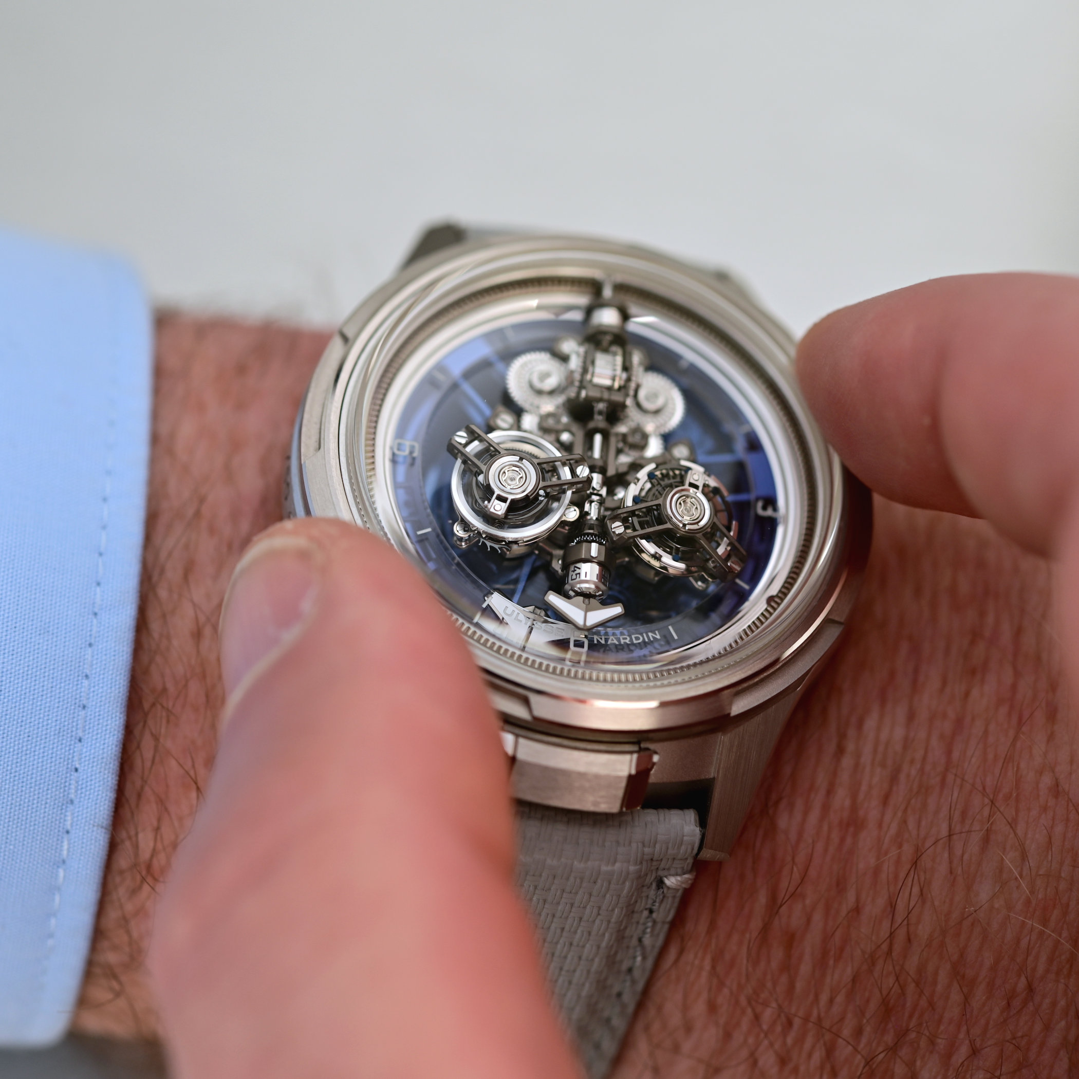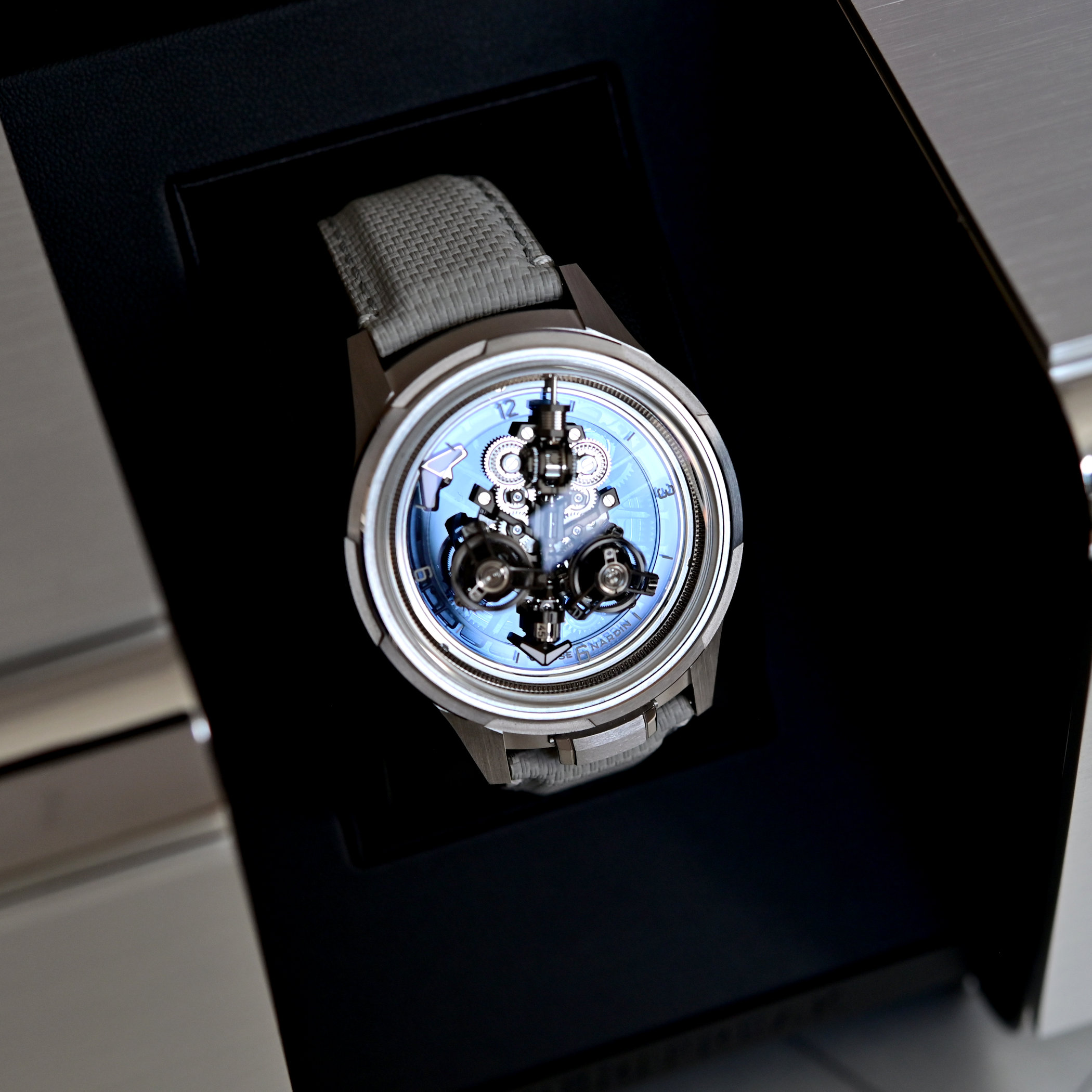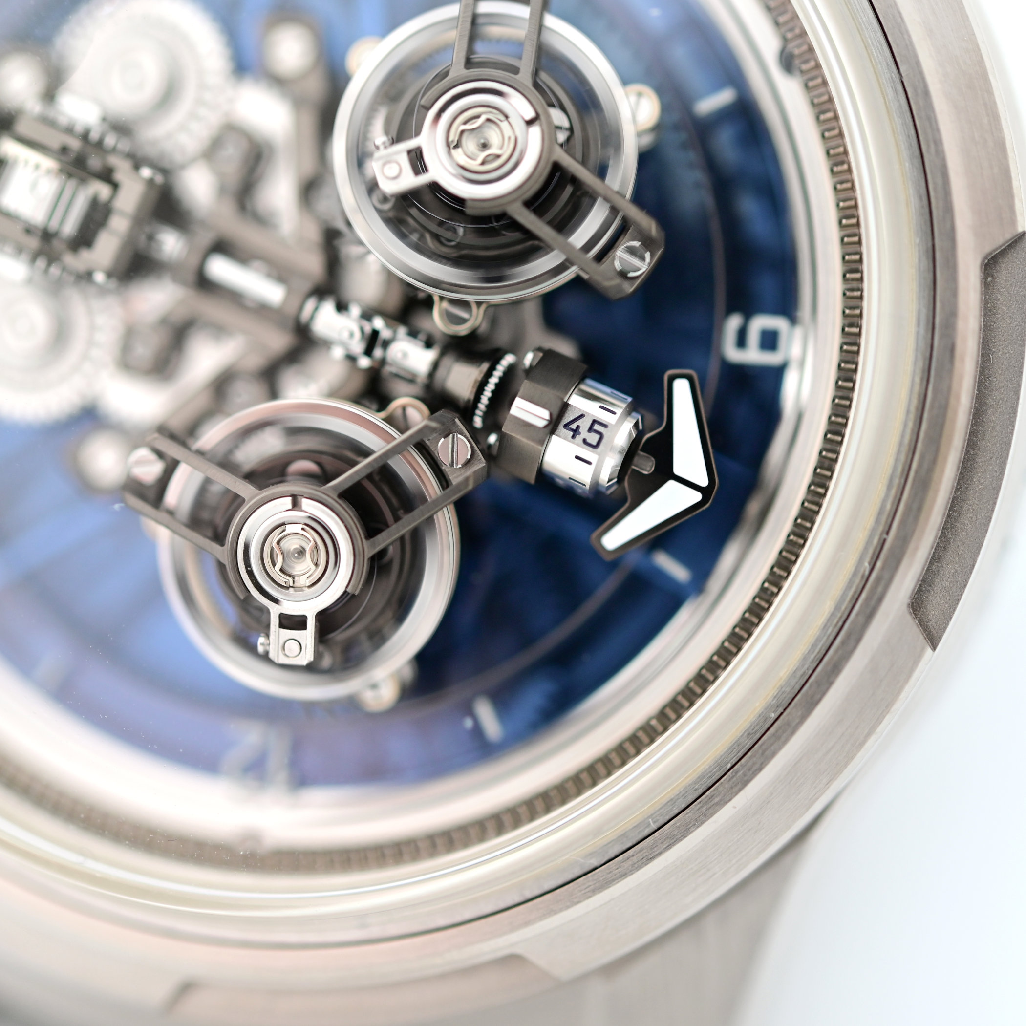 The integration of this differential is particularly noteworthy. Its orientation has been inverted compared to earlier implementations (Freak S), opening up the movement’s architecture. It is both a functional and an aesthetic decision, because in the Freak, mechanics are always meant to be seen. Obviously, energy management is important, if not crucial, for a watch of this complexity. Driving two tourbillons, a rotating carousel, and an additional seconds display requires efficiency, and this is where the Grinder system comes into play. Unlike traditional automatic winding systems, which rely on a central rotor, the Grinder uses a system of ultra-thin blades connected to an oscillating weight. This configuration allows it to capture even minimal wrist movements and convert them into usable energy with remarkable efficiency, with a power reserve of approximately three days.