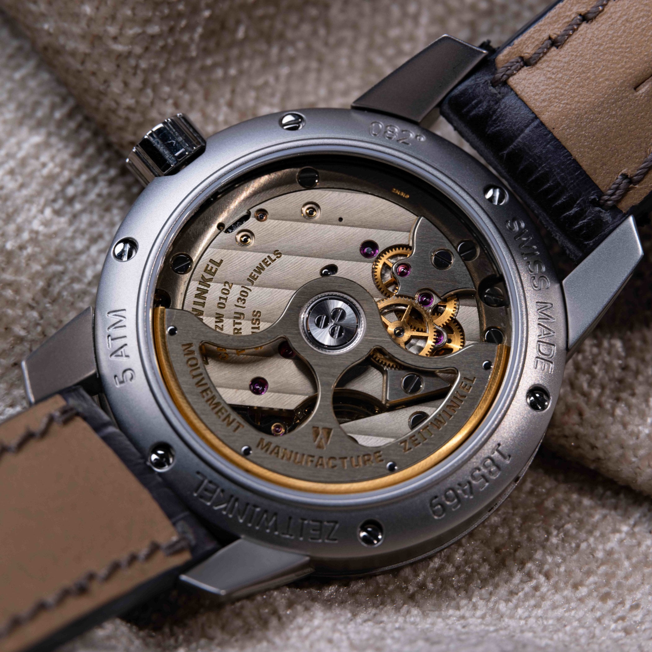 The watch is powered by the Zeitwinkel ZW0102 manufacture automatic calibre, built in the three-quarter plate tradition. It features untreated German silver plates and bridges, decorated with Côtes de Genève and hand-polished bevels. The openworked bi-directional rotor powers a movement operating at 28,800 vibrations/hour and offering a robust 72-hour power reserve.