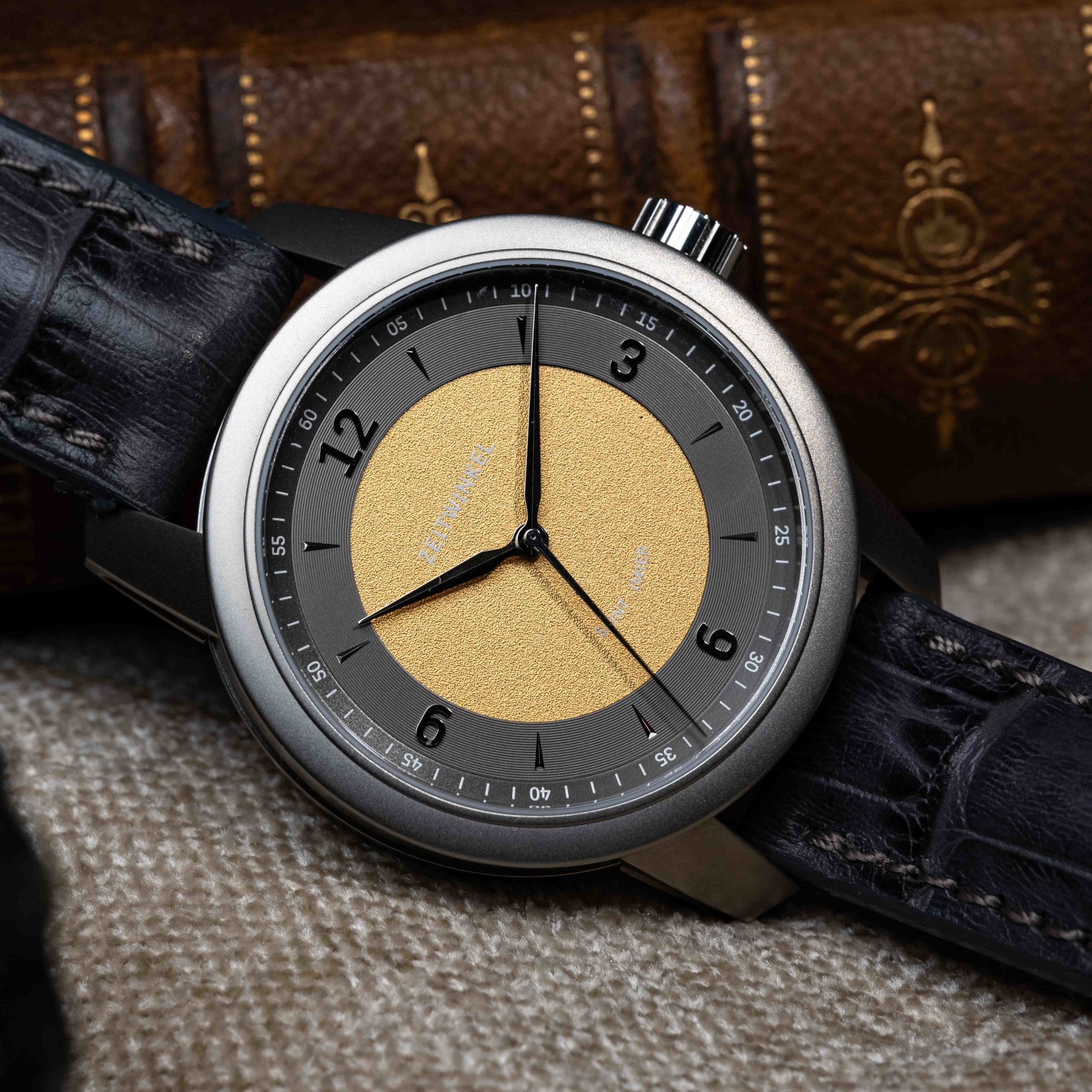 For this special edition, Zeitwinkel reinterprets the 082º’s dial with a new composition that plays on textures, tones, and depth. At its centre, a galvanised 2N gold section with a grained texture glows softly as light changes, surrounded by a Black Or chapter ring with concentric decoration, hosting Zeitwinkel’s proprietary numerals and applied markers. A smooth peripheral track with double digits at 5-minute intervals completes the layout. The distinctive Zeitwinkel hour and minute hands, diamond-cut and angled to reflect light on only one edge, ensure readability, while a slender central seconds hand indicates that the watch is running.