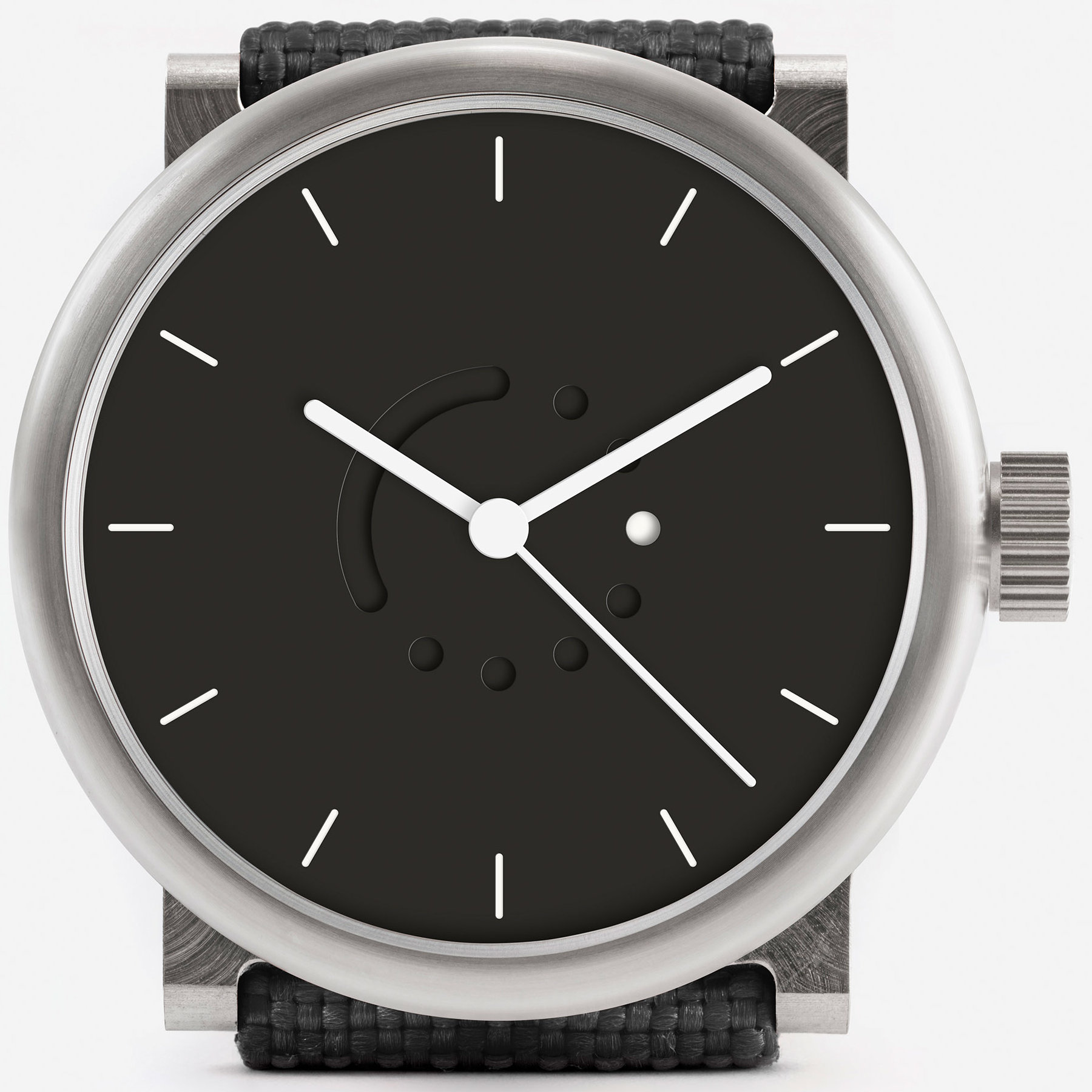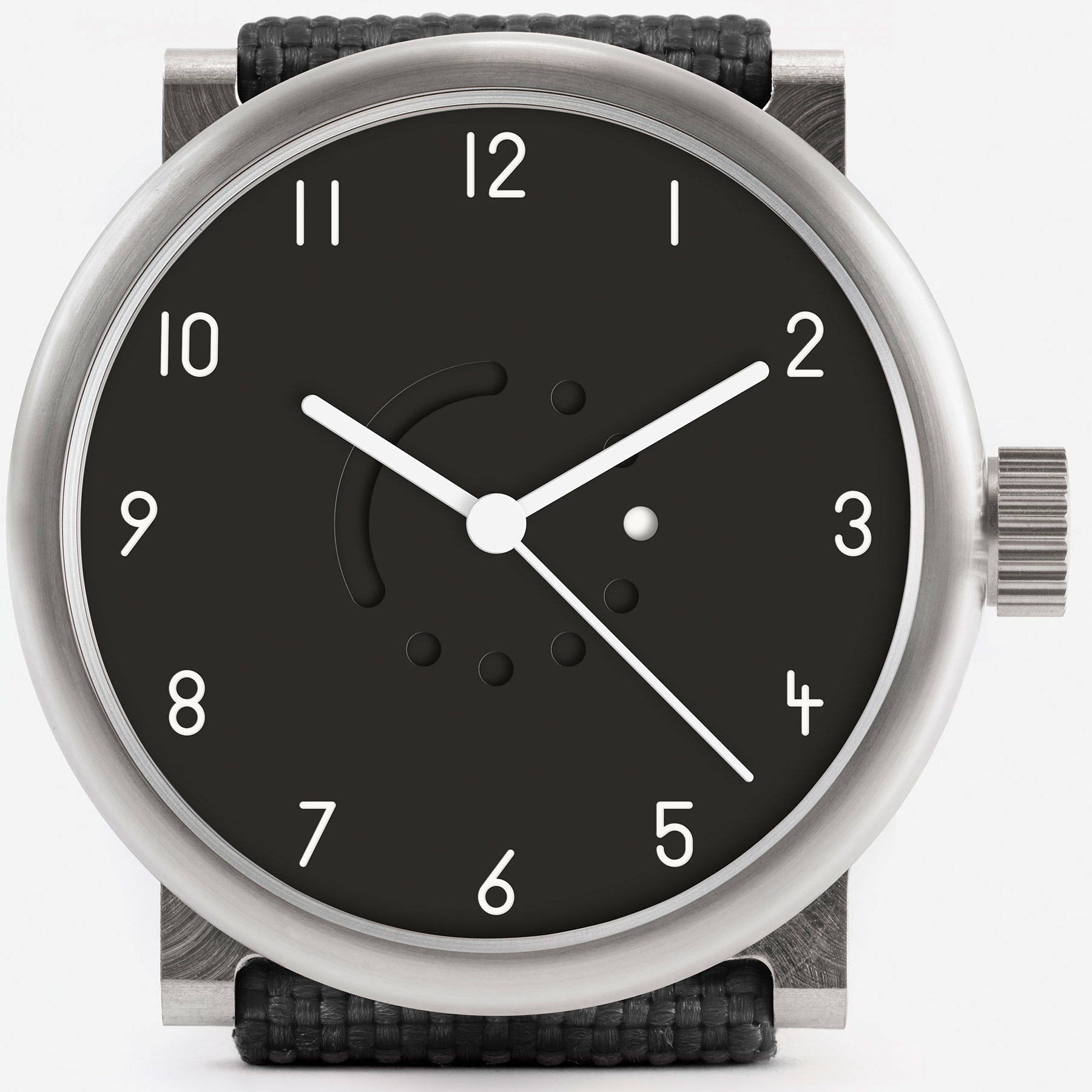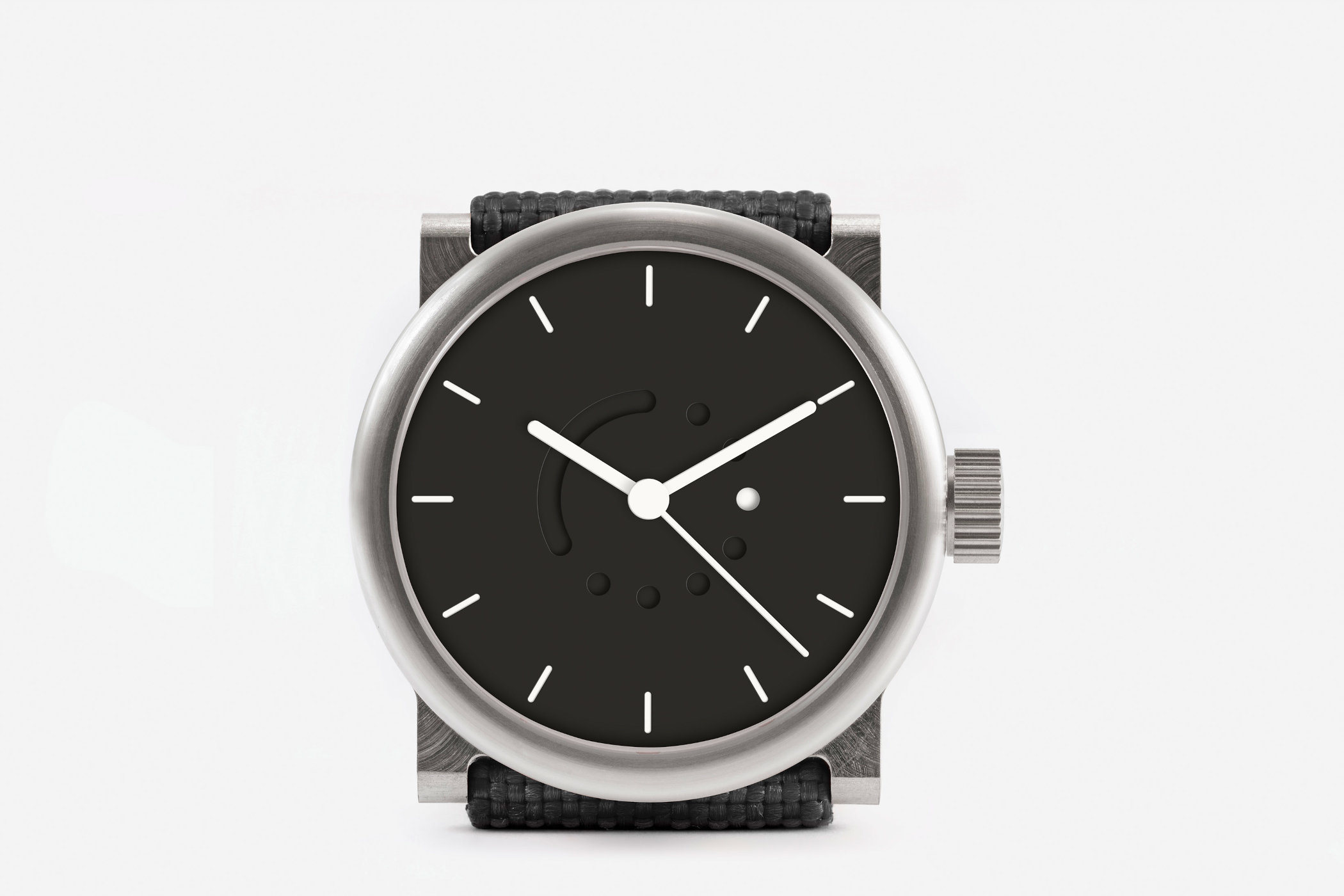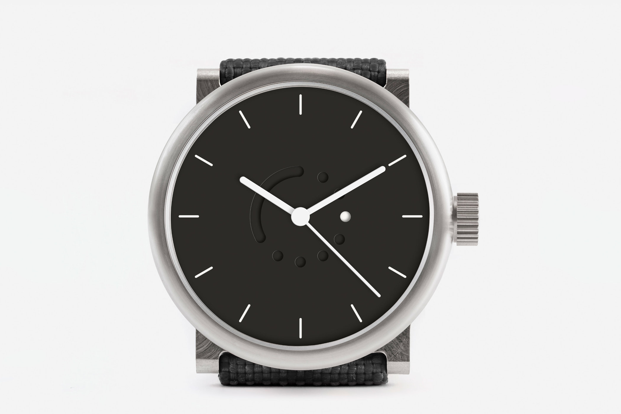 The Ochs & Junior Settimana Classic Black is part of the permanent collection, and not customisable. It is worn on a black textile strap with a titanium pin buckle that tucks in one end underneath the other. It retails for CHF 2,600.