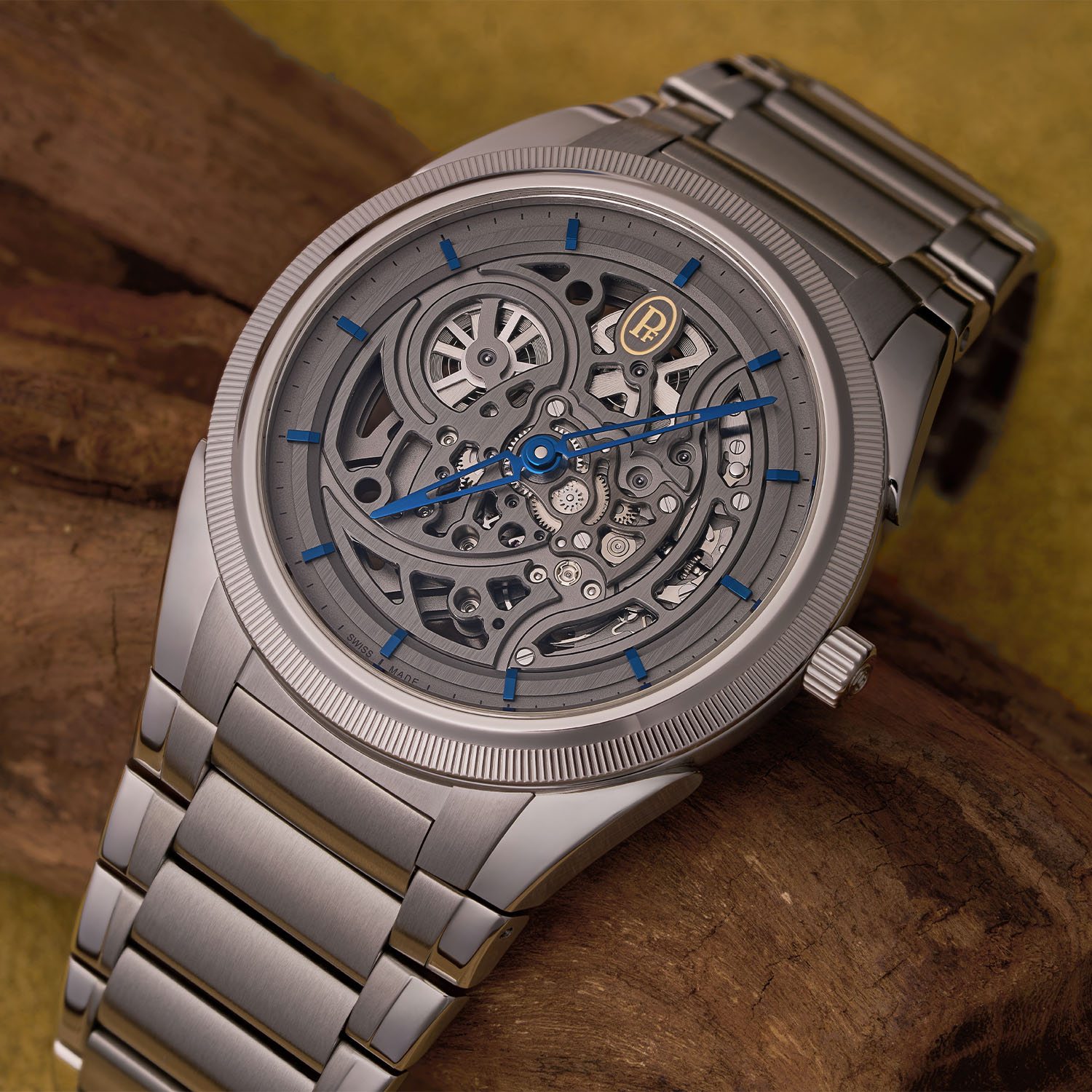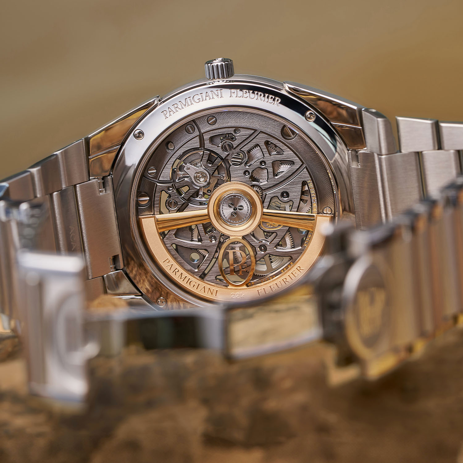 Based on one of the most appealing models within the now classic Tonda PF collection, the brand’s vision of a luxury sports watch with integrated design, the Parmigiani Fleurier x PRJKT8 Tonda PF Skeleton features a 40mm polished and satin-finished stainless steel case with a platinum 950 knurled bezel. Despite a comfortable 100m water-resistance, the case is slim, at only 8.5mm in thickness and retains a screw-in crown.