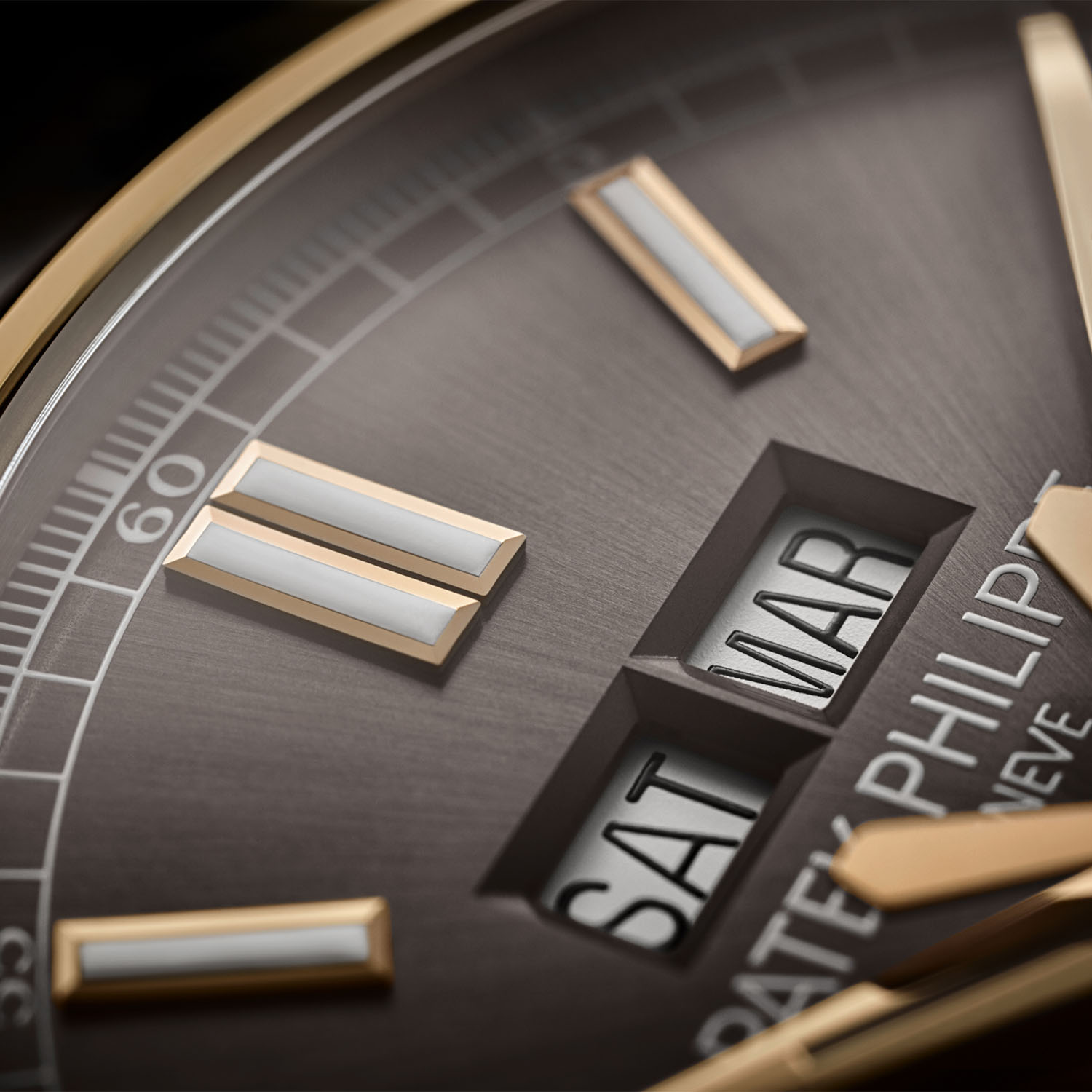 New to this specific reference is the dial, which is presented in a sleek slate grey colour, a tone that we don’t see often at Patek. Other than this new dial colour, the Split-Seconds Chronograph Perpetual Calendar 5204R-011 remains basically the same watch as before. The display is complex and classic, with a tri-counter layout. The day and month are displayed in two in-line apertures at 12 o’clock. The date hand at 6 o’clock incorporates the moon-phase aperture. Small seconds and the instantaneous 30-minute counter appear on two subdials at 9 and 3 o’clock. Two small round apertures display the leap-year cycle between 4 and 5 o’clock and the day/night indication between 7 and 8 o’clock – functions enabling accurate adjustment of the calendar. Whether by day or night, reading the time is facilitated by the applied hour-markers and Dauphine-type hands in rose gold, all with luminescent coating.