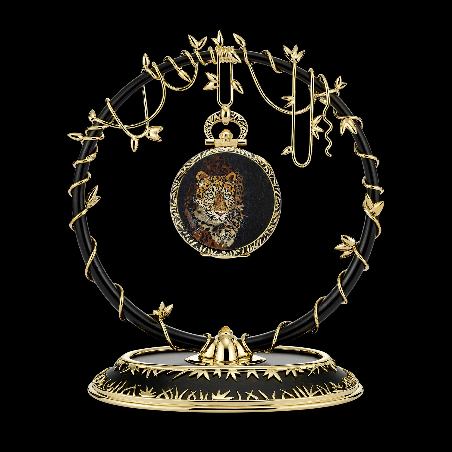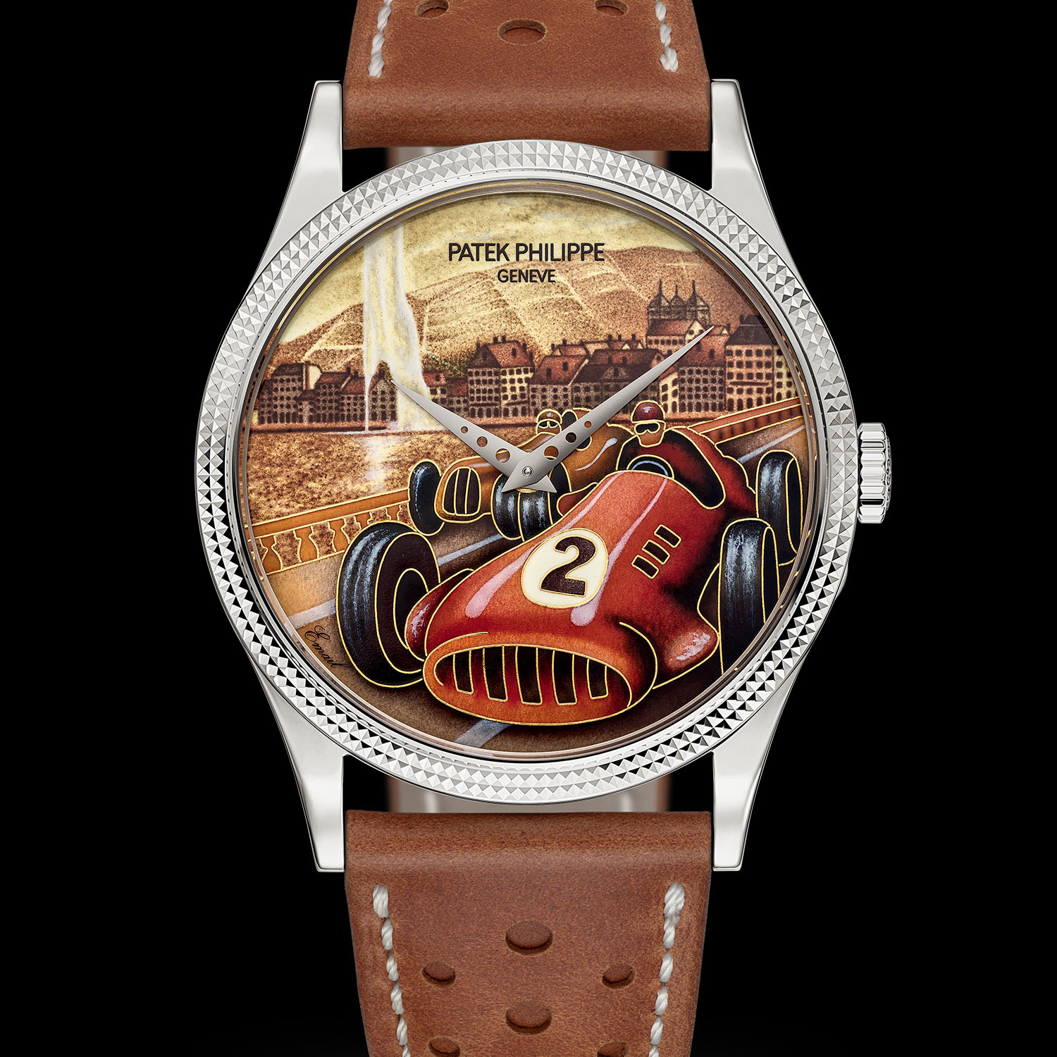 Divided thematically into two areas, the first is dedicated to flora and fauna and features the “Leopard” pocket watch combining wood marquetry, manual engraving and champlevé enamel. The second thematic area pays tribute to the great legends of human adventure and includes a set of timepieces dedicated to motor racing, including the “1948 Nations Grand Prix” Calatrava wristwatch with its miniature enamel depiction of two vintage race cars speeding along the shoreline of Lake Geneva.