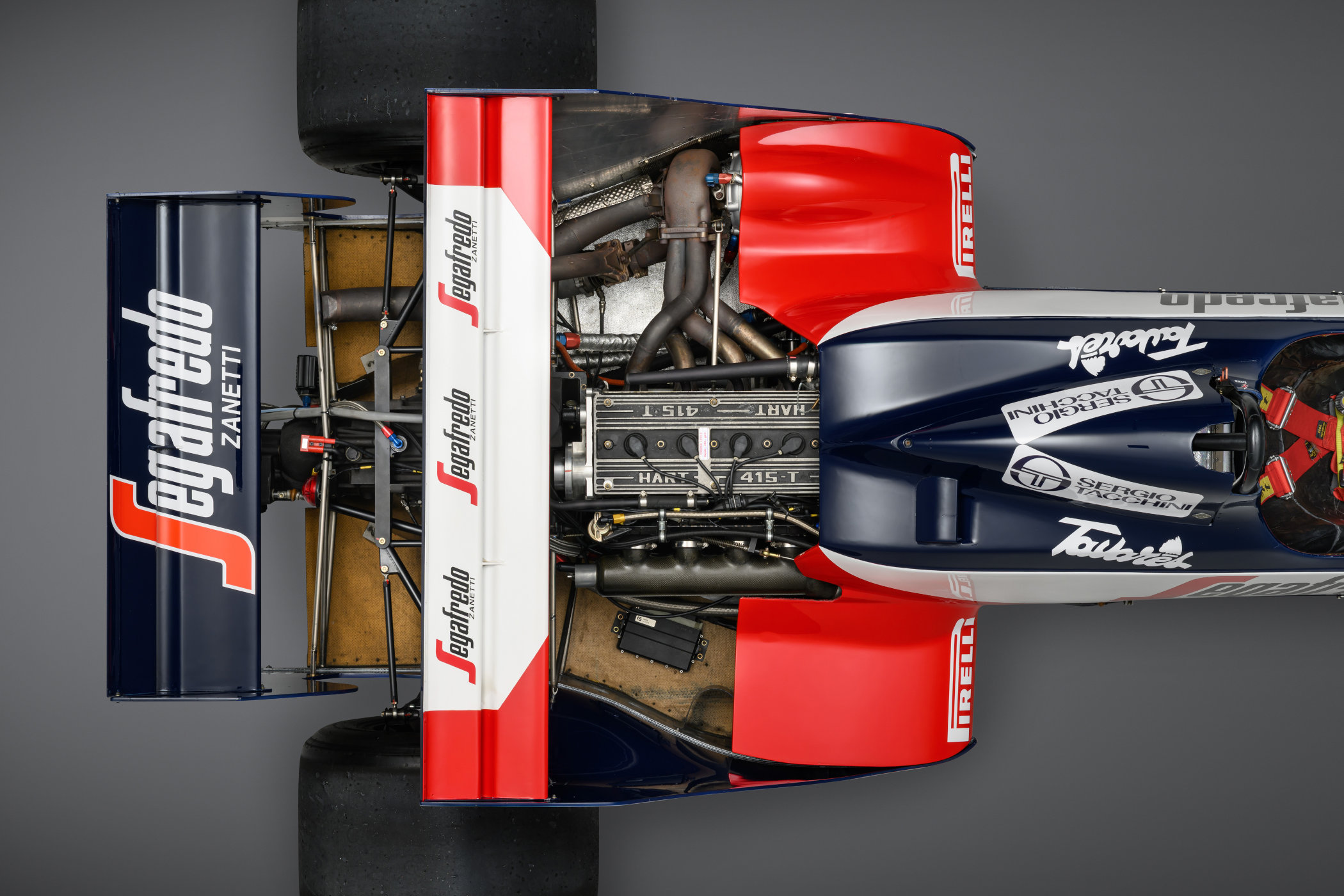 The main characteristics of Toleman’s TG181 and subsequent TG183 cars were the elaborate rear-wing designs. It was built upon a carbon fibre monocoque chassis, which was already common back then, and with the engine being a semi-stressed member of it. It had double-wishbone pull-rod suspension up front, with double-wishbone push-rod suspension geometry in the back. As mentioned, it was fitted with a 1.5-litre inline four-cylinder engine by Hart, mated to a Hewland five-speed gearbox. It also featured front-wing-mounted radiators, which proved to make the car somewhat unstable at high speed. Looking at the car from the top down, you’ll notice the rather square setup on both ends, with a very narrow cockpit area in between, something this era of F1 was known for (think of the Brabham BT-42, for instance).