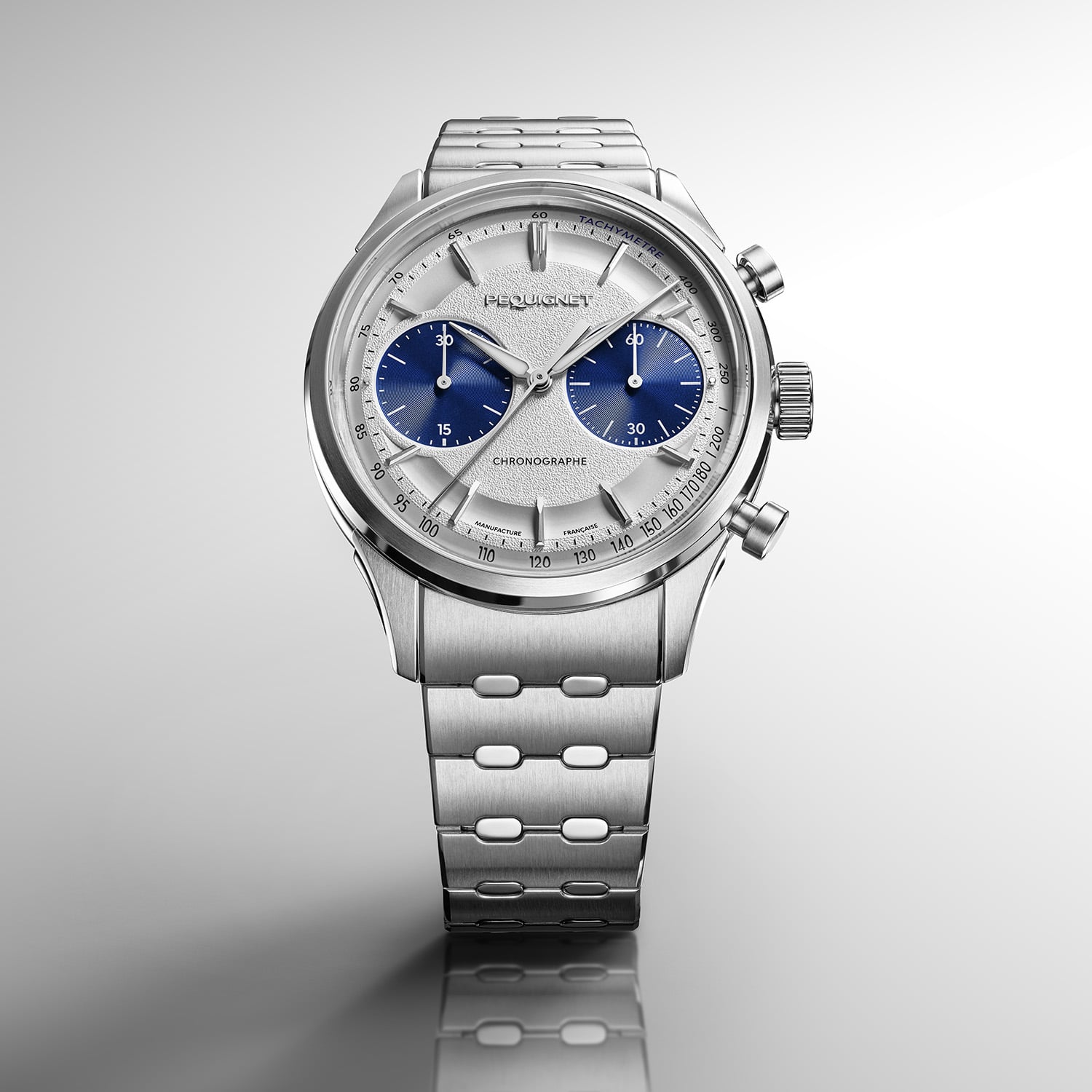 Although the Royale Paris Chrono is not powered by the Calibre Royal, it belongs to the Royale Paris collection and retains its signature lugs, which are individually produced and then attached to the case. Crafted in 316L stainless steel, the case has a 39.5mm diameter and a 12.7mm thickness. Adding a touch of sportiness, the case flanks are recessed, and the chronograph pushers are classic piston-style. Alternating satin-brushed surfaces with crisply delineated, polished bevels highlight the case’s architecture, finishes that continue onto the smooth, flowing interchangeable steel bracelet, with its wide brushed central links and two smaller polished connector links in the centre.