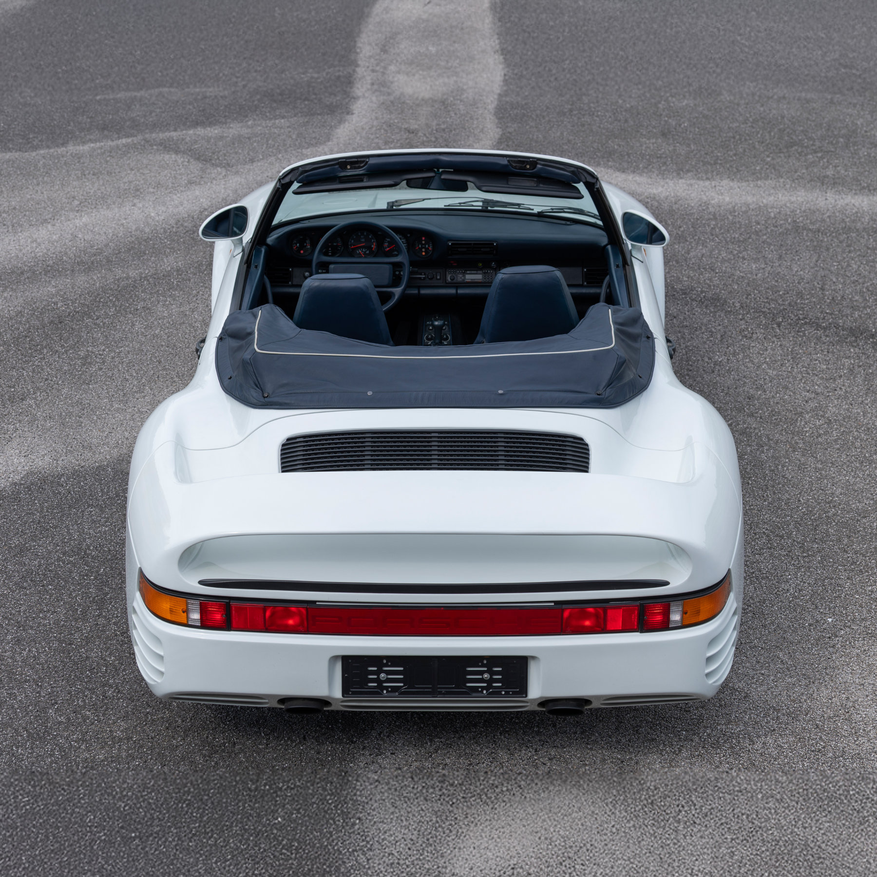 According to RM Sotheby’s details, there was a tremendous focus on getting the fit and finish of the chop-top conversion just right. It’s a Porsche after all, so engineering-wise, it had to be done as close to perfect as can be. An electrically operated soft-top was installed, and a removable hard-top was constructed. The team even made a low-level ‘Speedster’ front windshield, which could be exchanged for the standard 959 windshield you see in the images. Along with the hard top, this windshield is also included in the lot.