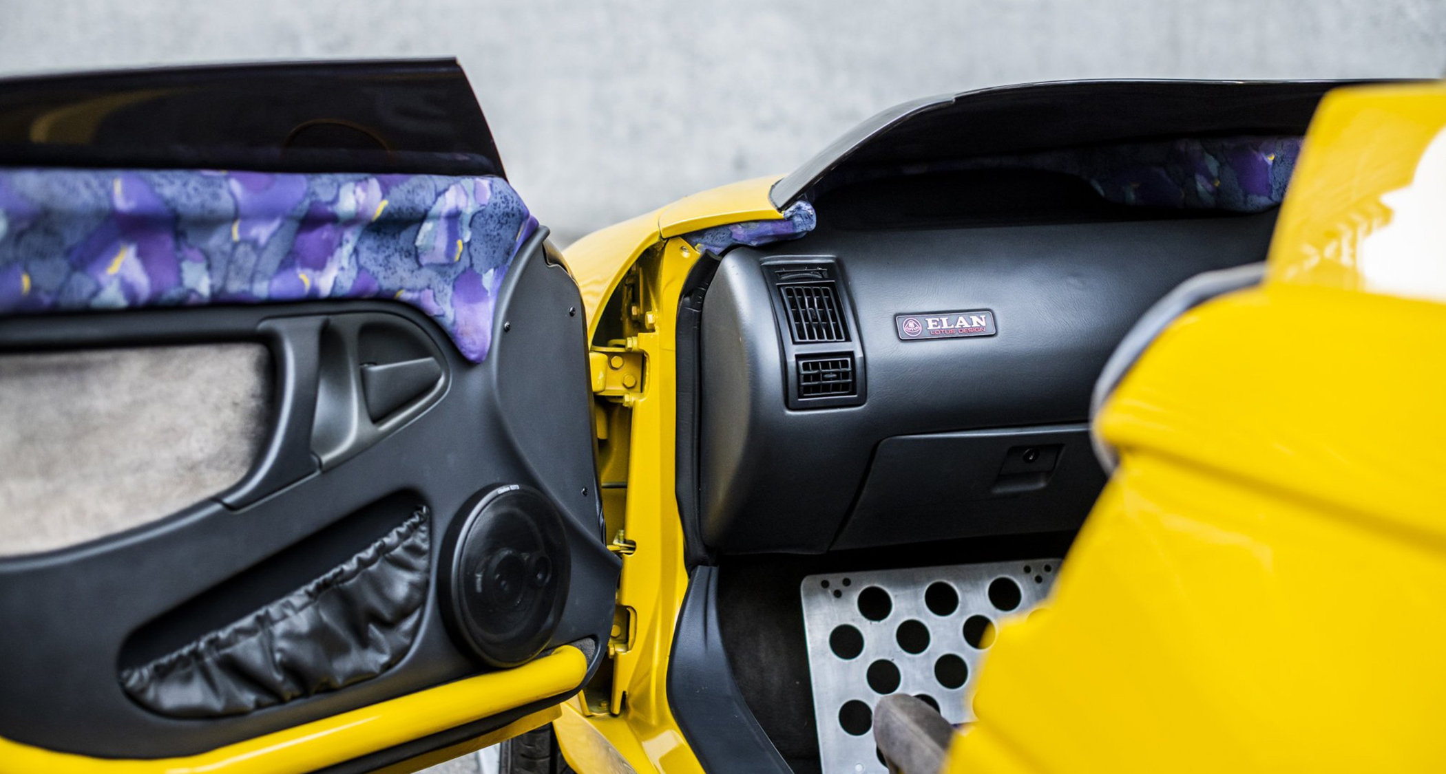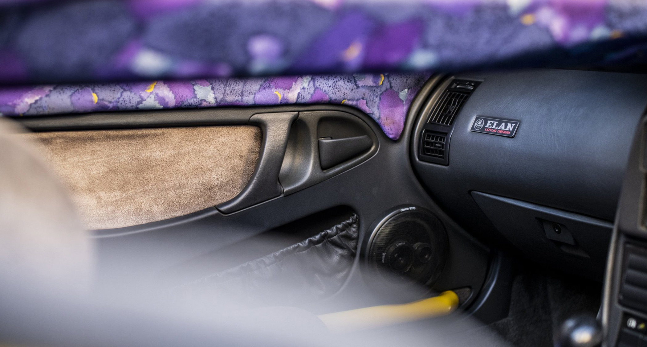In a true statement of early-1990s fashion, the interior is quite outspoken, with multi-coloured purple fabric inserts paired with black leather and Alcantara. Other than that, it seems pretty straightforward and similar to the interior of the ‘donor’ car. It’s also in right-hand-drive configuration, mind you, so navigating your local drive-thru might be challenging beyond just the split-cockpit design of the Elan M200 Speedster.