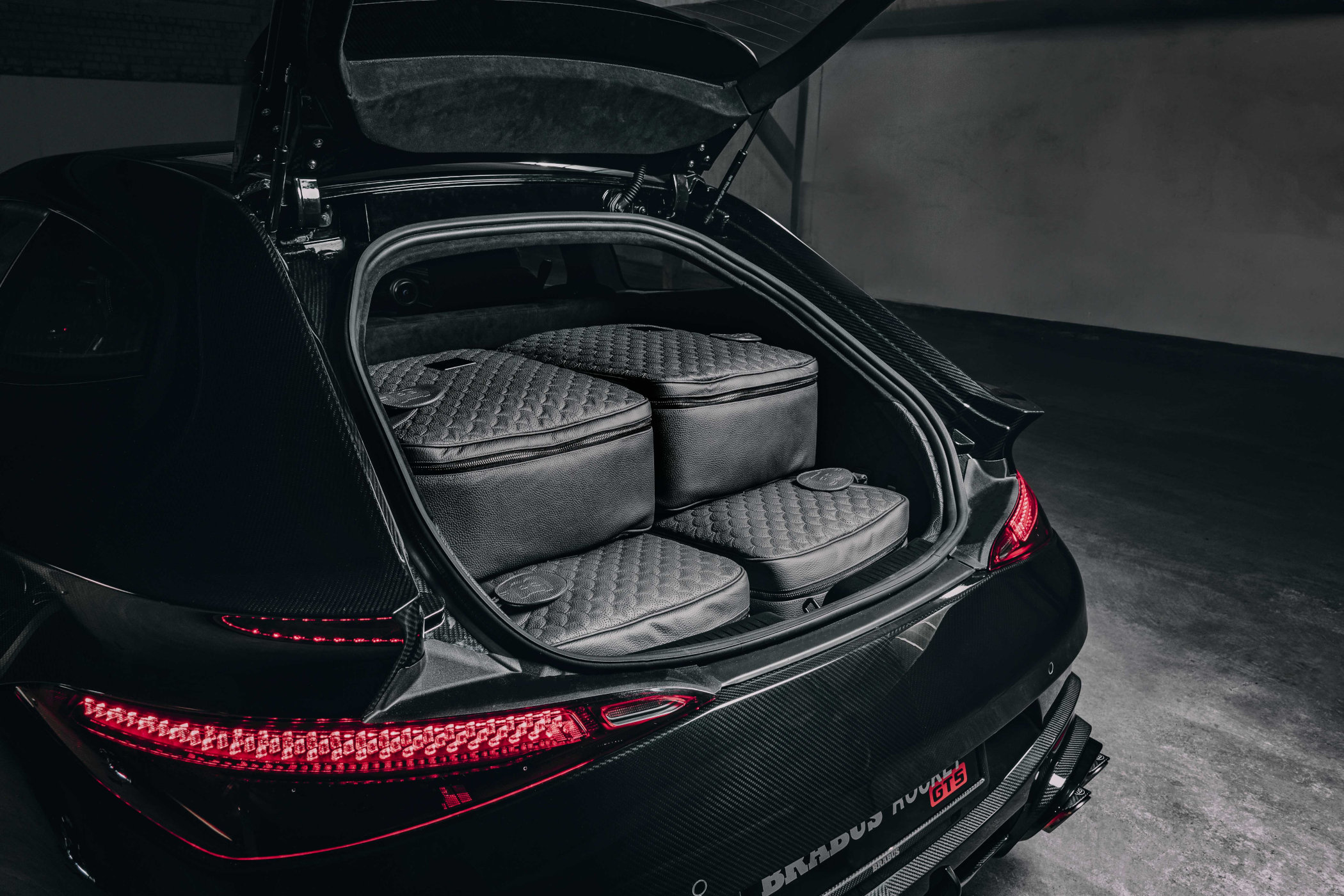 On the inside, swathes of black leather, Alcantara and carbon fibre elements line the interior. Stretching the roof line to form a liftback-style rear section, the hallmark of a Shooting Break, also adds quite a bit of room to the back. Brabus doesn’t state how much extra boot space the conversion equates to, but the set of bespoke suitcases that come with the car suggest it’s enough for more than a day or two away from home. And you can bring some more mates, as this is a proper 2+2, although it might not look like it at first.