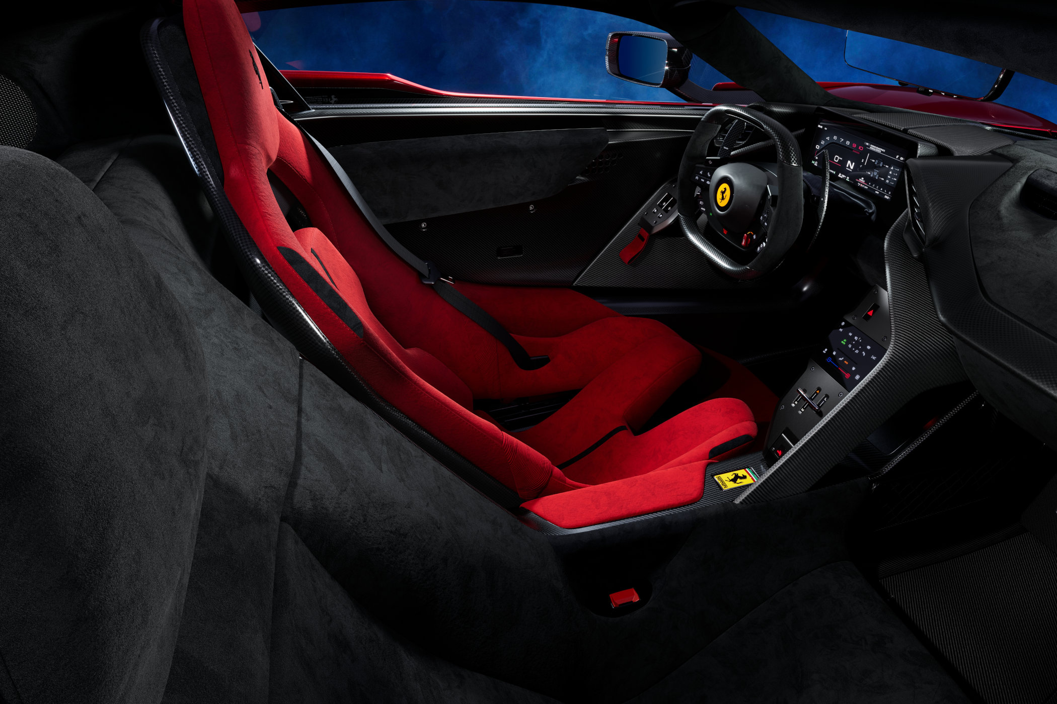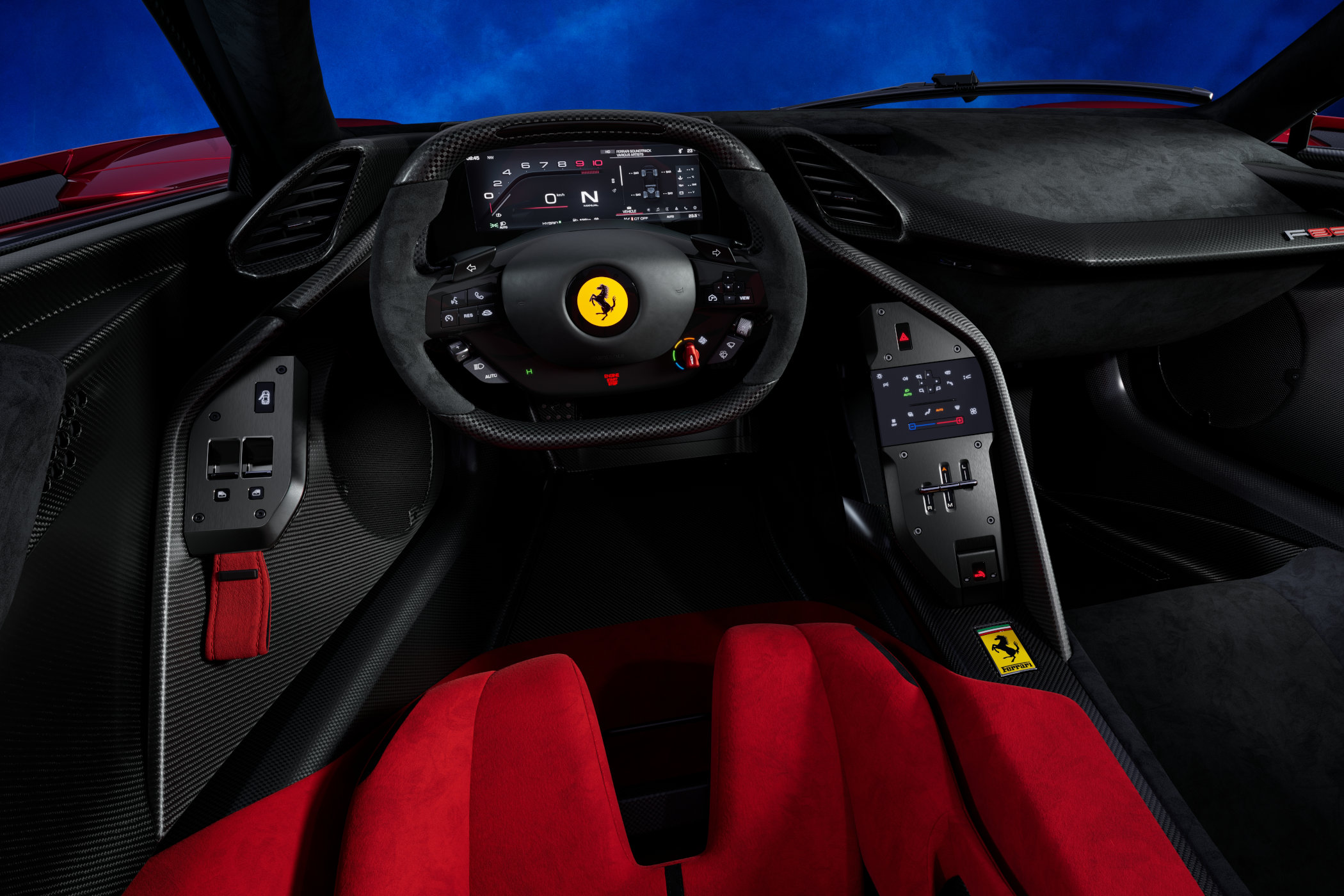 Two butterfly doors that move up and forward give way to the purposeful cabin. You’ll notice perhaps, that the passenger seat is moved back a little compared to the driver’s seat, thanks to an asymmetrical carbon tub. This means the frontal area of the cabin can be 50mm narrower, compared to a pure side-by-side seating position, benefitting the flow of air over and alongside the top of the car. The driver’s seat is adjustable forwards and backwards, with the squared-off steering wheel and pedals being adjustable as well, while the passenger seat is fixed in place. All controls are angled towards the one in charge, with toggles and switches both on the steering wheel and on either side. The digital instrument panel has various settings, depending on the driver’s needs. Ferrari’s famous Mannetino switch on the right lets you choose between a range of modes (Wet – Sport – Race – CT Off – ESC Off) with three more modes for the powertrain on the left (Hybrid – Performance – Qualify).
