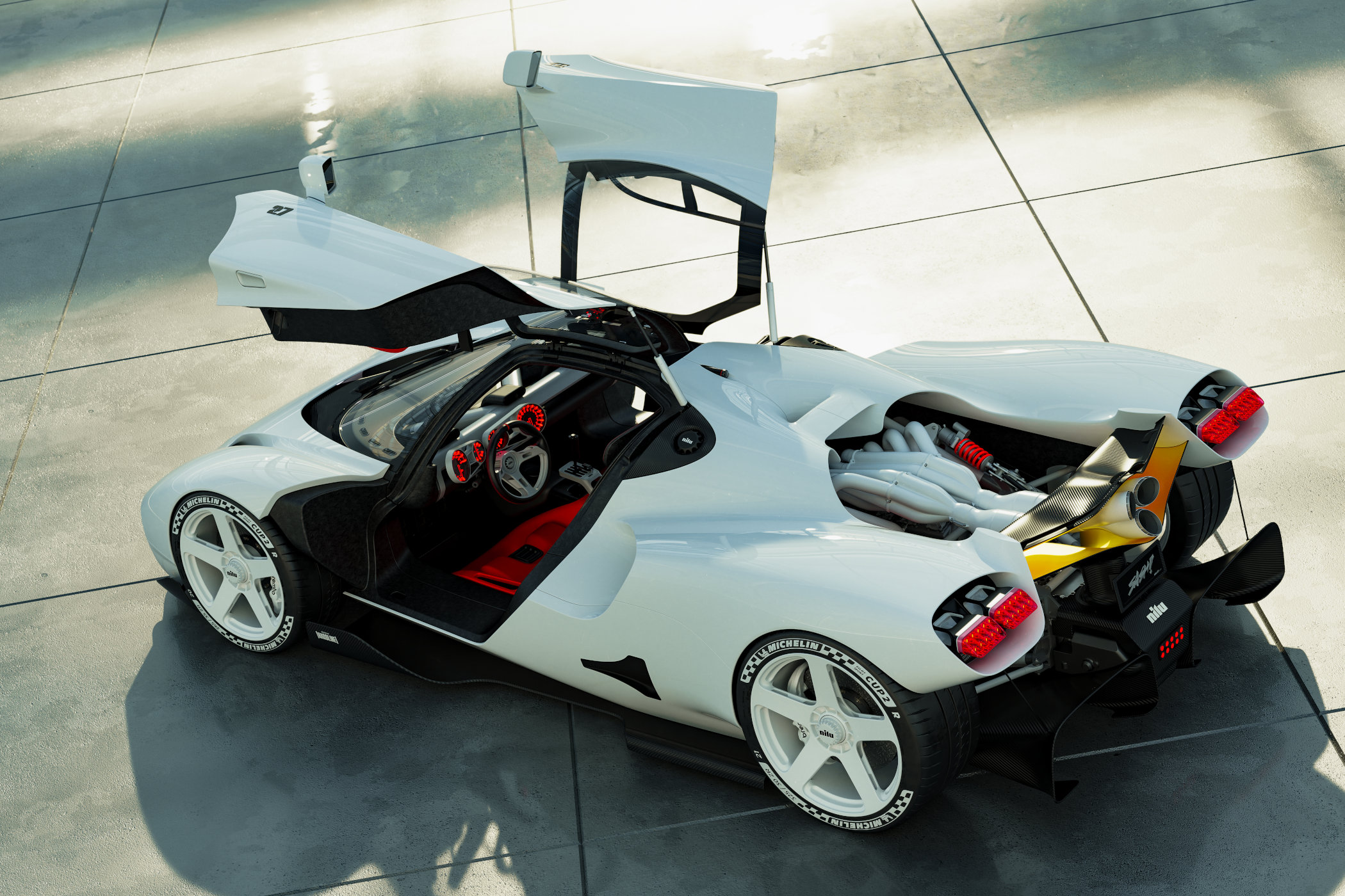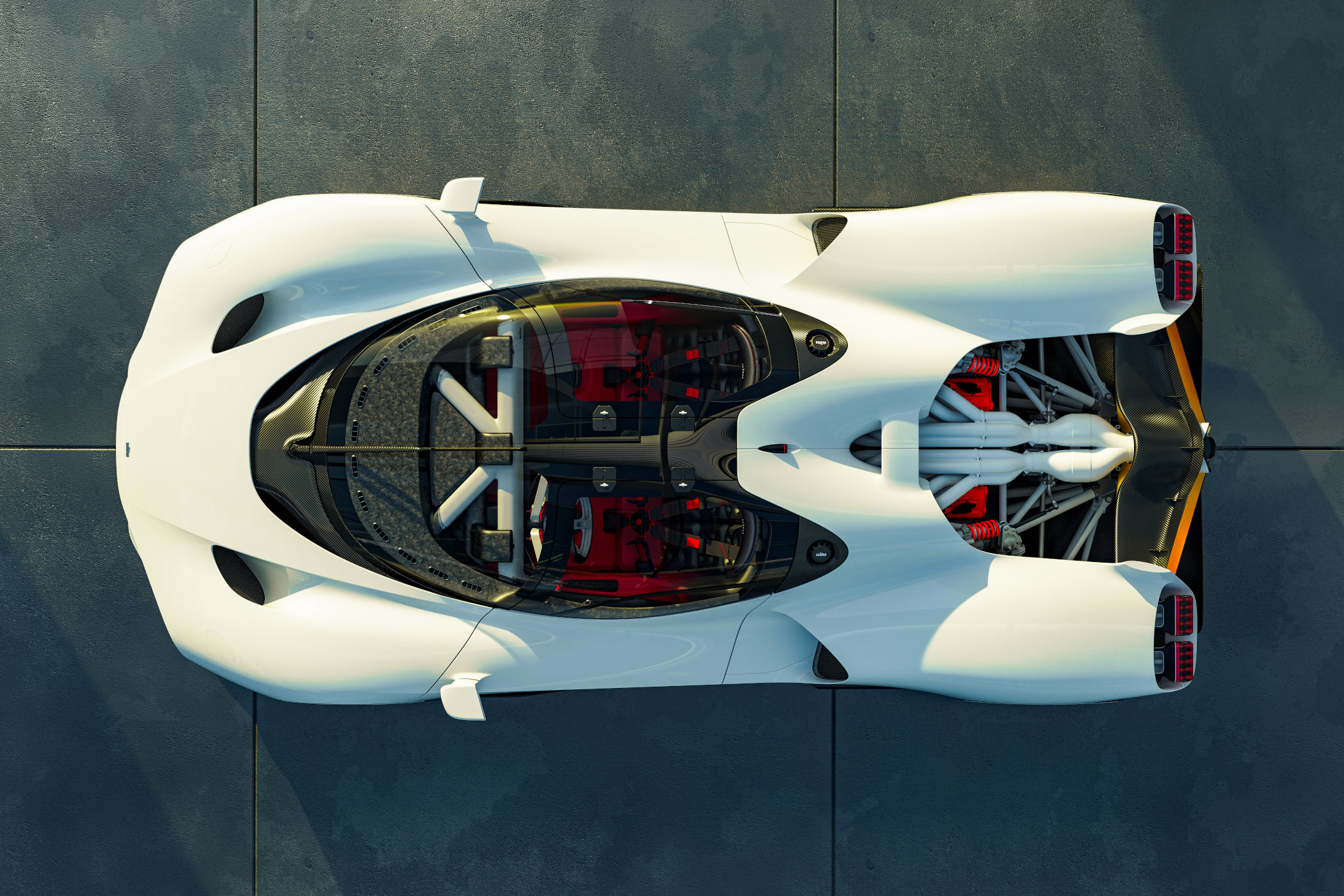 Regardless, it looks amazing, doesn’t it? I mean, slap it on a poster and you have an instant bedroom-decoration for youngsters who are into their cars! The sleek exterior has tons of retro influences with a swooping front leading into a very curvaceous profile and ending in what’s best described as ‘the most amazing use of negative space’ in ages. Just look at it for a few seconds, honestly! The engine seems to be semi-floating between the rear wheels and is fitted with an exposed 12-into-1 exhaust manifold that snakes its way over the engine to end underneath the rear wing. But the coolest little detail in the design? The Naca-style duct in the side of the full carbon fibre body!