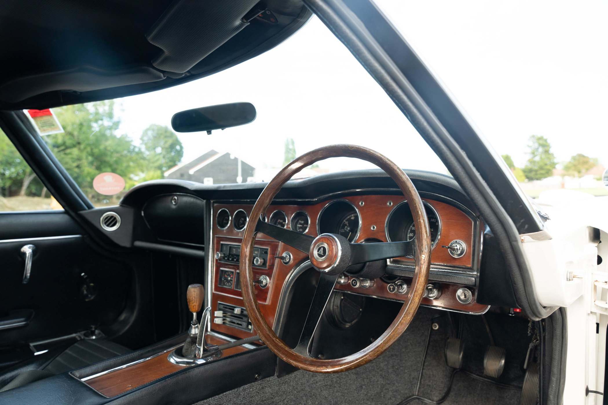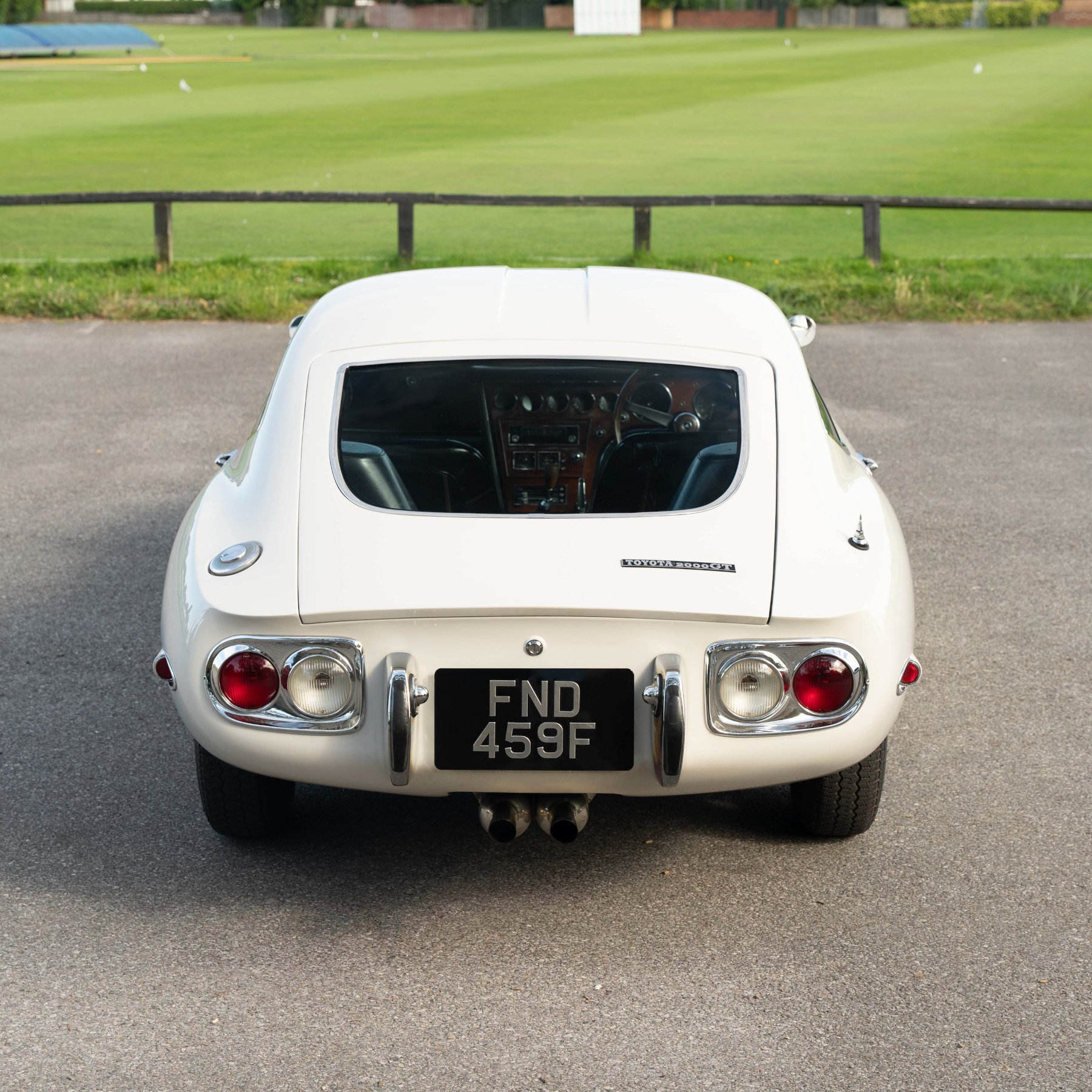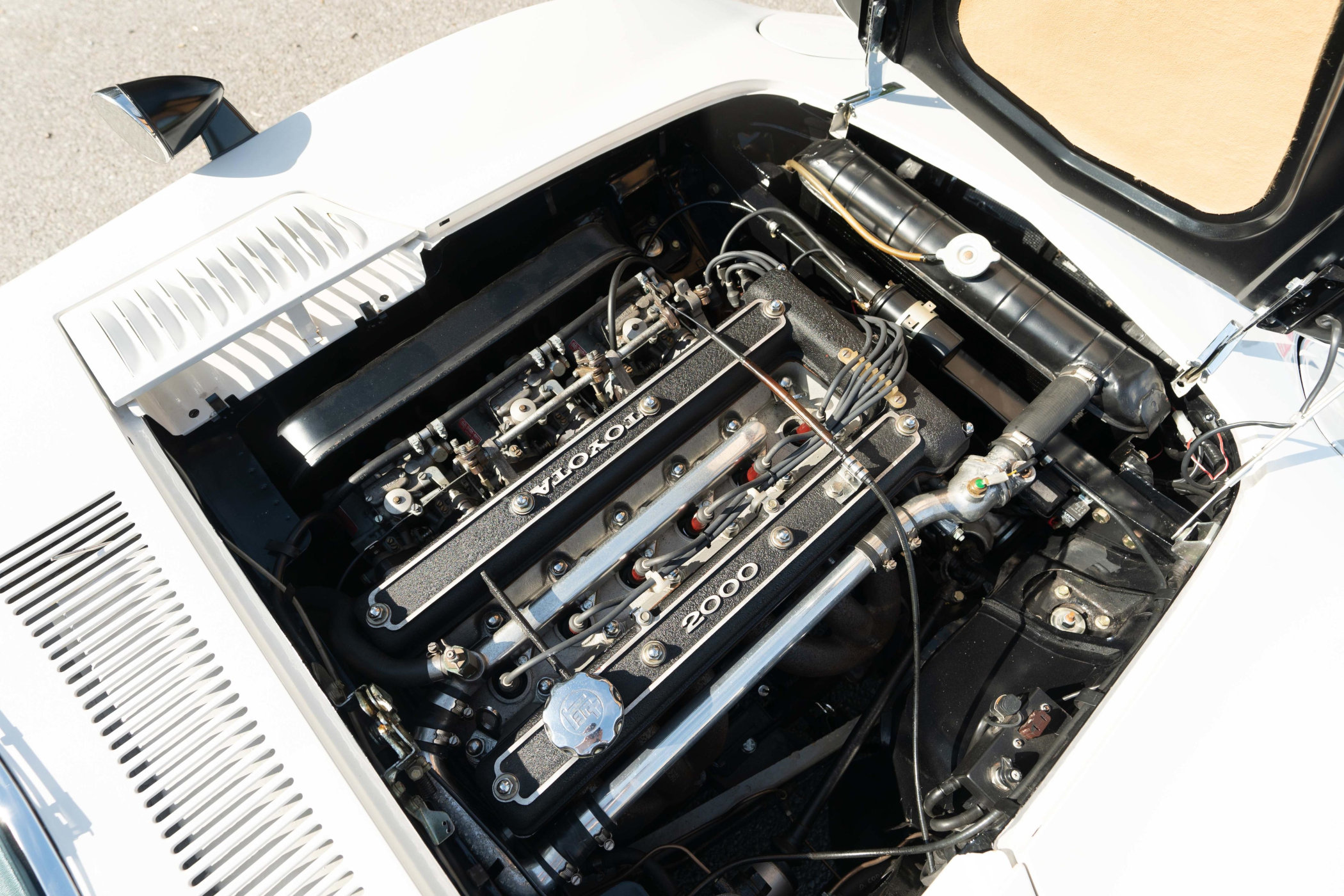 This specific car is finished in a gorgeous cream-white colour that emphasises the elegance of the 2000GT perfectly. The front section of the design is trademarked by the built-in headlights on either side of the grille, the pop-up headlights on top of the nose, and the panels in the flanks to access the battery and such. The low-slung coupe has an angled wrap-around windshield and low but long doors to gain access to the cabin. Around the back, the body ends in a curvaceous tail section with double-round rear lights, bumper stops and a double central exhaust. The interior features leather seats, wood trim for the dash and centre console, a wooden steering wheel and period-typical switches and knobs. Fun fact, the handbrake is mounted in the vertical section of the centre console and needs to be pulled back to engage.