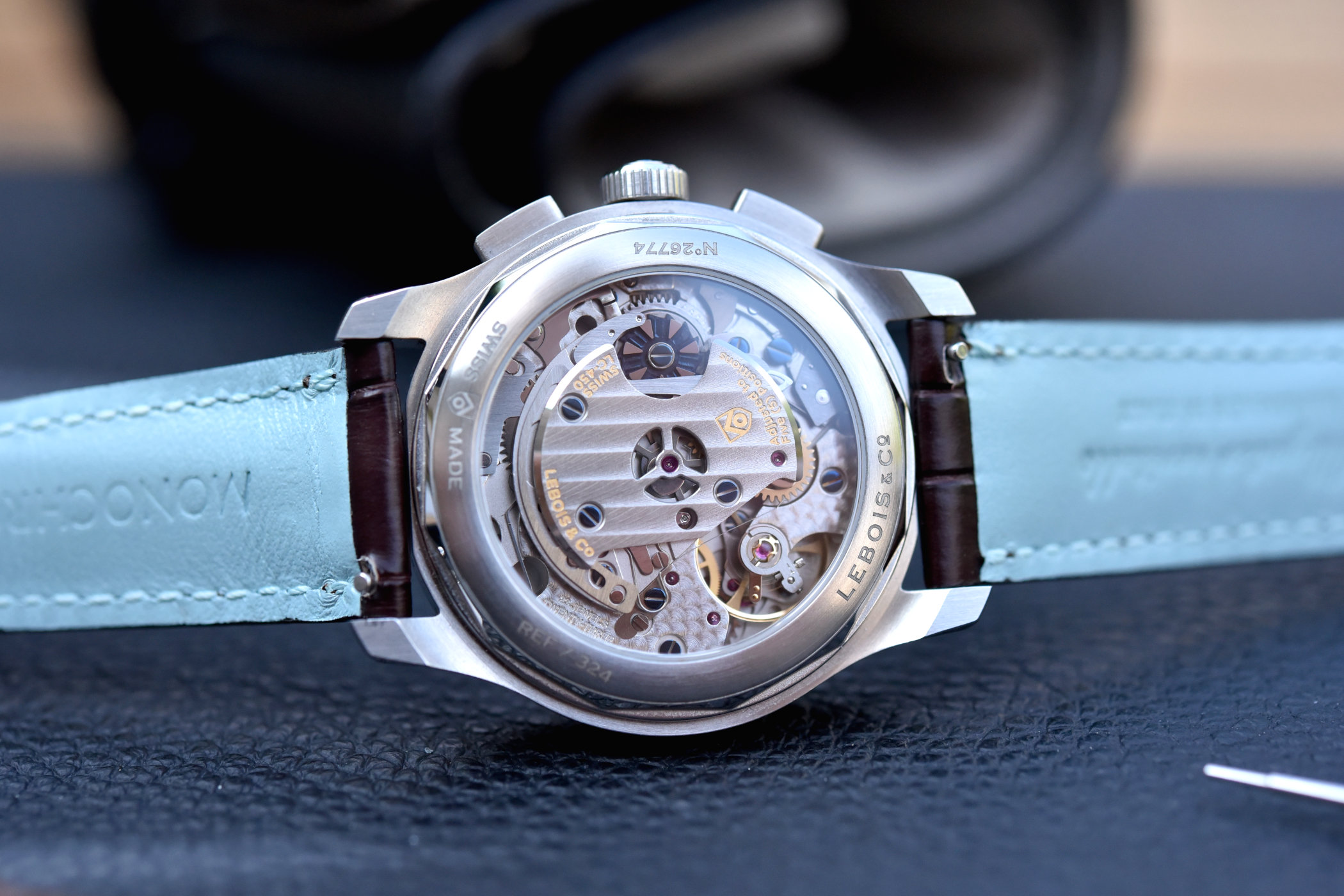 For the rest, nothing has changed as you still get that very nicely finished 39mm wide by 10.5mm high case. The sloped bezel greets a domed sapphire crystal, and the wide pushers help in instantly starting, stopping or resettling the chronograph when needed. Around the back, another sapphire crystal reveals the manually wound Calibre LC-450, made with La Joux-Perret. This relies on a blued column wheel for a smooth action for the chronograph and holds up to 60 hours of fuel in the tank. Pardon, the barrel.